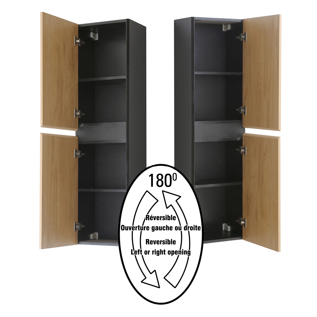 Lingerie murale réversible au fini chêne rustique et noir, laminé européen, bordures en PVC, installation murale, 2 portes avec pentures à fermeture lente, 2 tablettes réglables, quincaillerie incluse.