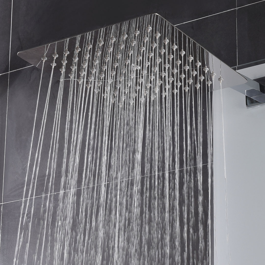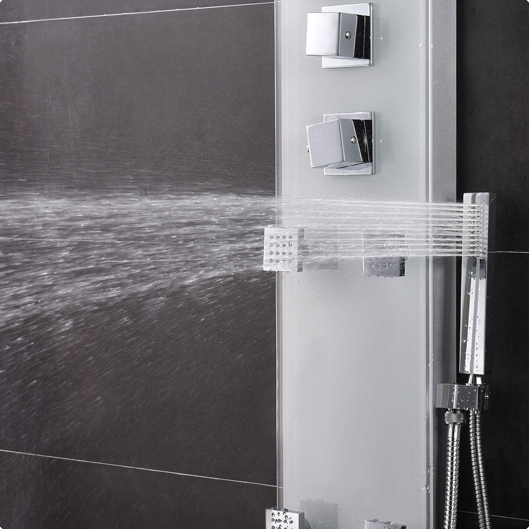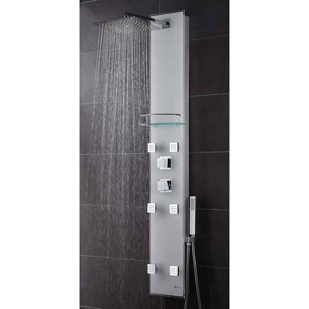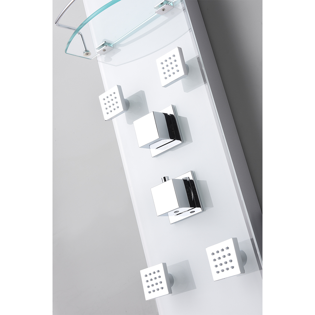 COLONNE DE DOUCHE THERMOSTATIQUE : Fabriquée en aluminium; Façade de verre trempé 6 mm au fini blanc; Cartouche thermostatique; Déviateur 4 voies; Bras de douche en laiton; Pommeau de douche carré de 9-3/4 po (24,7 cm) en acier inoxydable; Douchette en laiton à 1 réglage; 6 jets de corps orientables en laiton; Buses anti-calcaire faciles à nettoyer; Support à douchette en laiton; Tablette en verre trempé; Boyau flexible et extensible de 59 po (1,5 m) en acier inoxydable avec double agrafage et raccords en laiton; Tuyaux d’alimentation souples en acier inoxydable tressés avec raccords coudés; Débit de 9,5 L/min (2,5 gal US/min).
