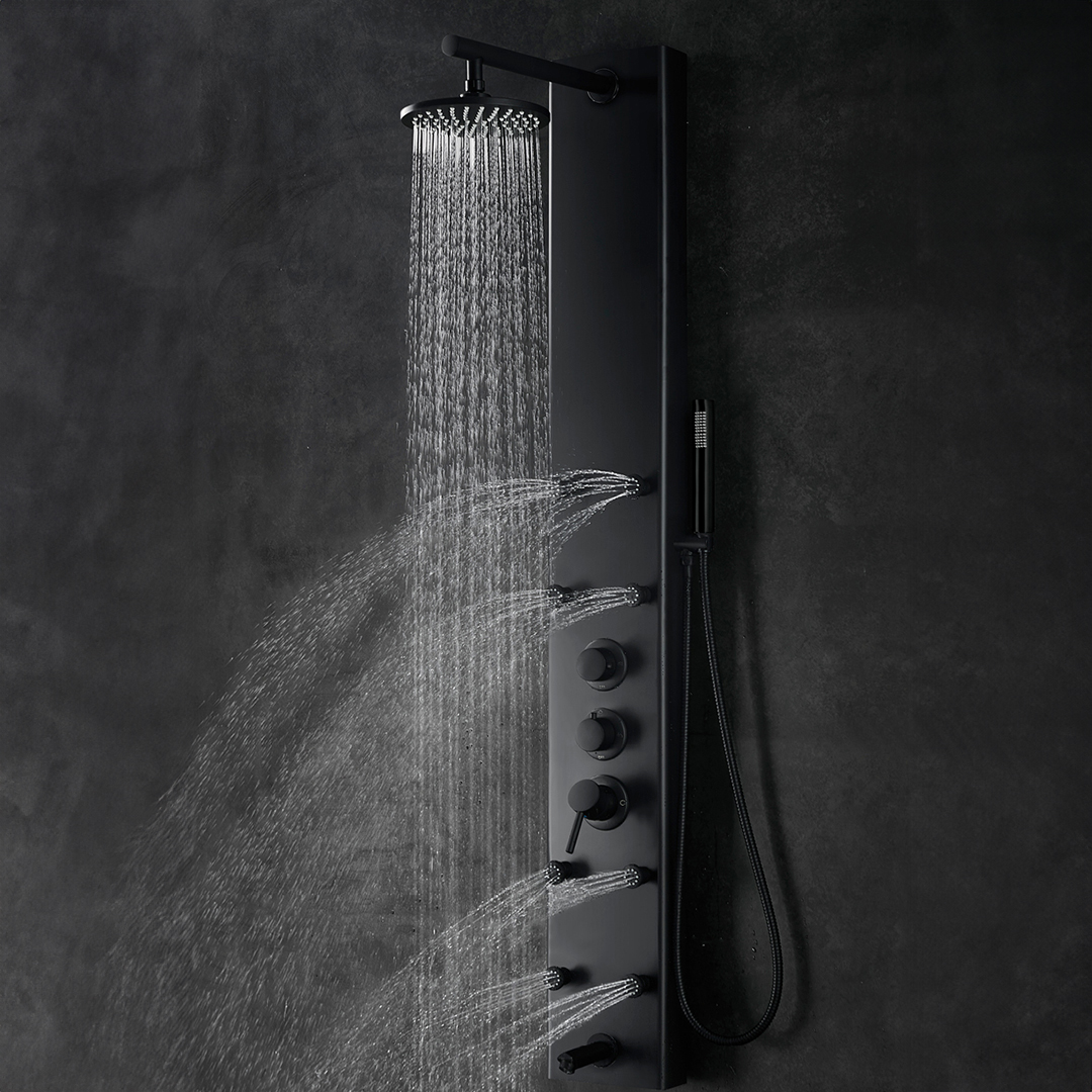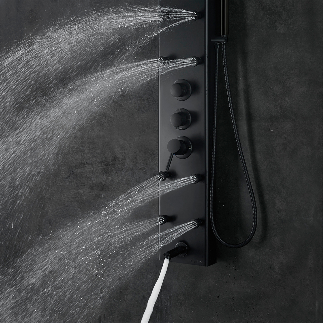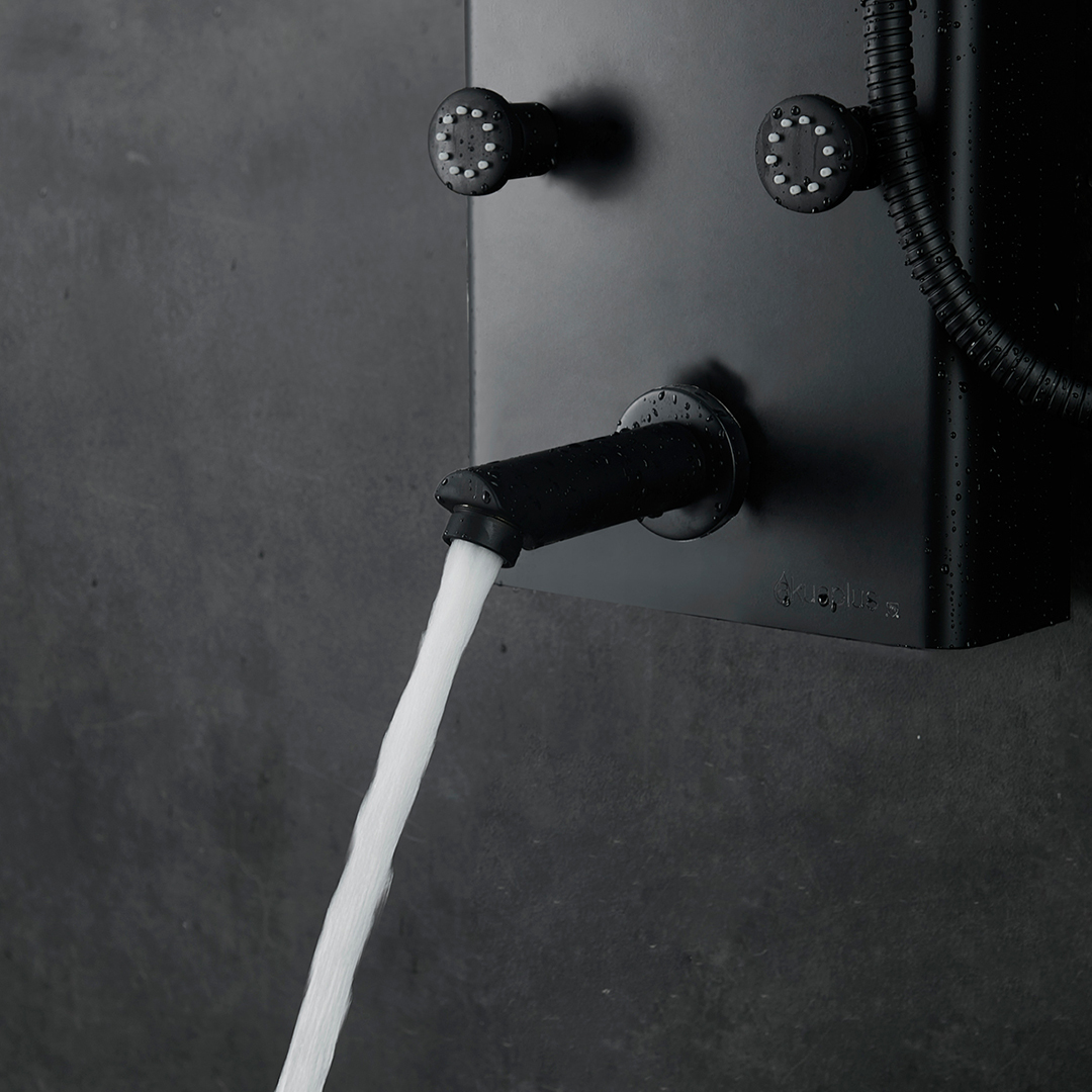 Fabriquée en acier inoxydable au fini noir mat; Cartouche à pression équilibrée; 4 déviateurs indépendants; Bras de douche en laiton; Pommeau de douche rond en ABS de 8 po (20 cm); Douchette à 1 réglage en ABS; 8 jets de corps orientables; Buses anti-calcaire faciles à nettoyer; Bec de bain en laiton; Support à douchette en laiton; Boyau flexible de 59 po (1,5 m) en acier inoxydable avec double agrafage et raccords en laiton; Tuyaux d’alimentation souples en acier inoxydable tressés avec des raccords coudés; Débit de 9,5 L/min (2,5 gal US/min).