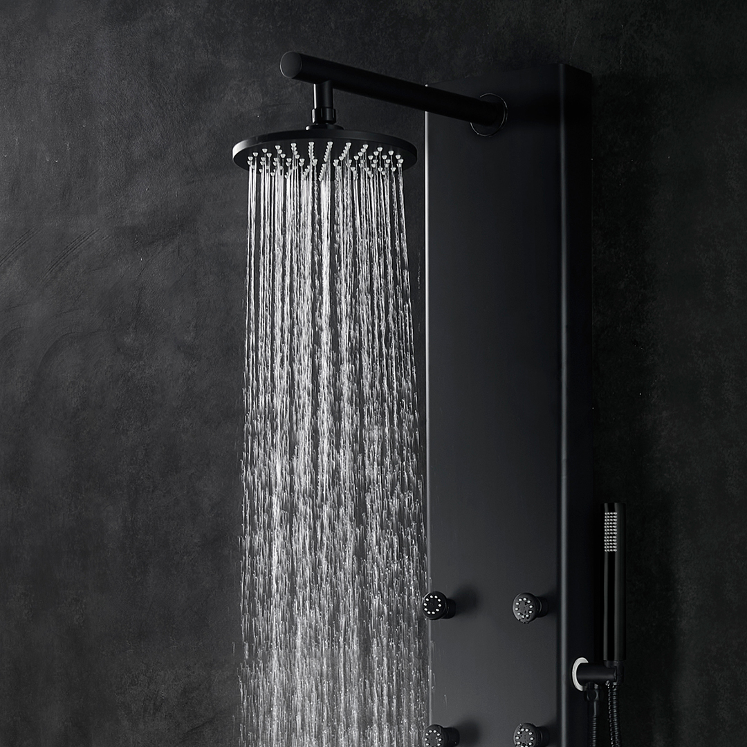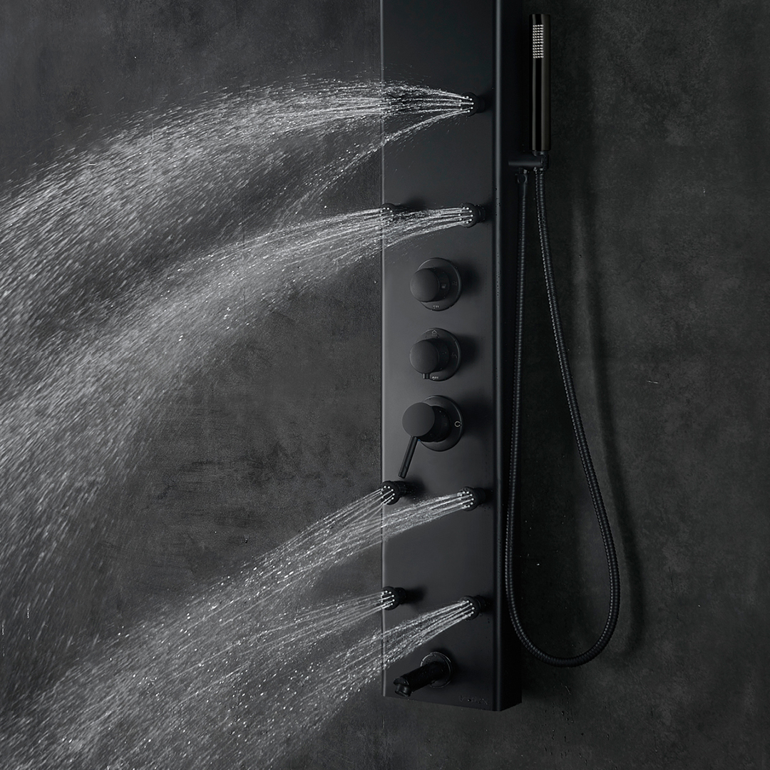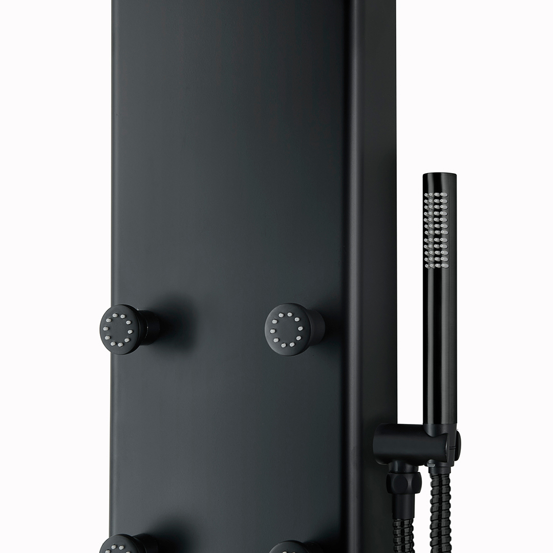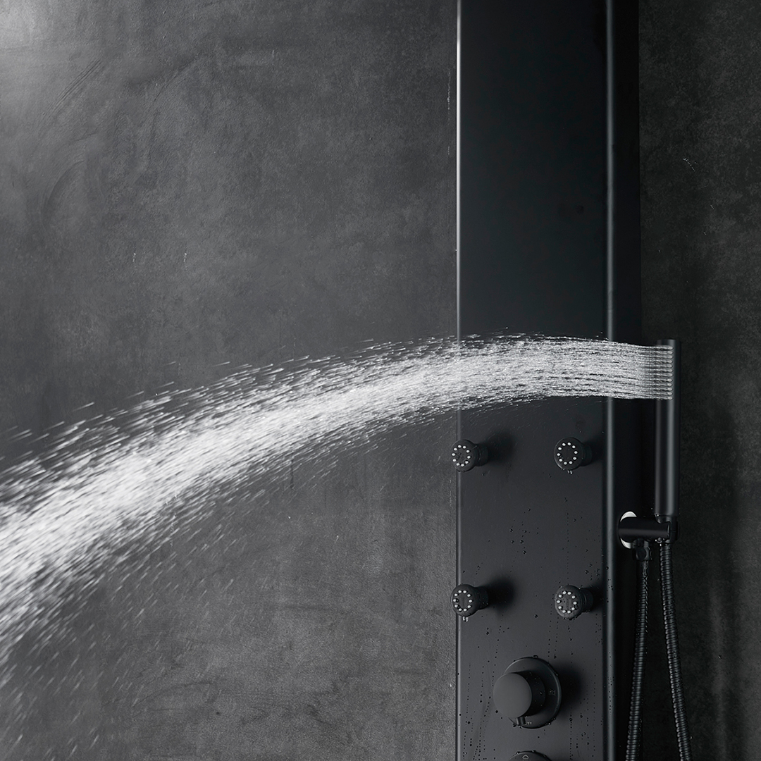 Fabriquée en acier inoxydable au fini noir mat; Cartouche à pression équilibrée; 4 déviateurs indépendants; Bras de douche en laiton; Pommeau de douche rond en ABS de 8 po (20 cm); Douchette à 1 réglage en ABS; 8 jets de corps orientables; Buses anti-calcaire faciles à nettoyer; Bec de bain en laiton; Support à douchette en laiton; Boyau flexible de 59 po (1,5 m) en acier inoxydable avec double agrafage et raccords en laiton; Tuyaux d’alimentation souples en acier inoxydable tressés avec des raccords coudés; Débit de 9,5 L/min (2,5 gal US/min).