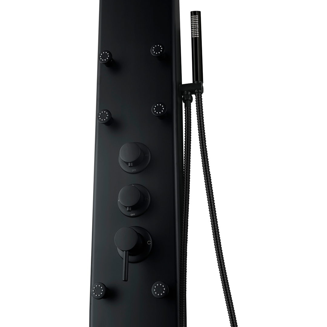 La colonne de douche à pression équilibrée Amelia SPB9999BL en noir mat comprend 8 jets de corps, une pomme de douche orientable de 20,3 cm, et une douchette en laiton. Le déviateur 4 voies et le déviateur indépendant offrent un contrôle flexible pour une expérience de douche luxueuse.