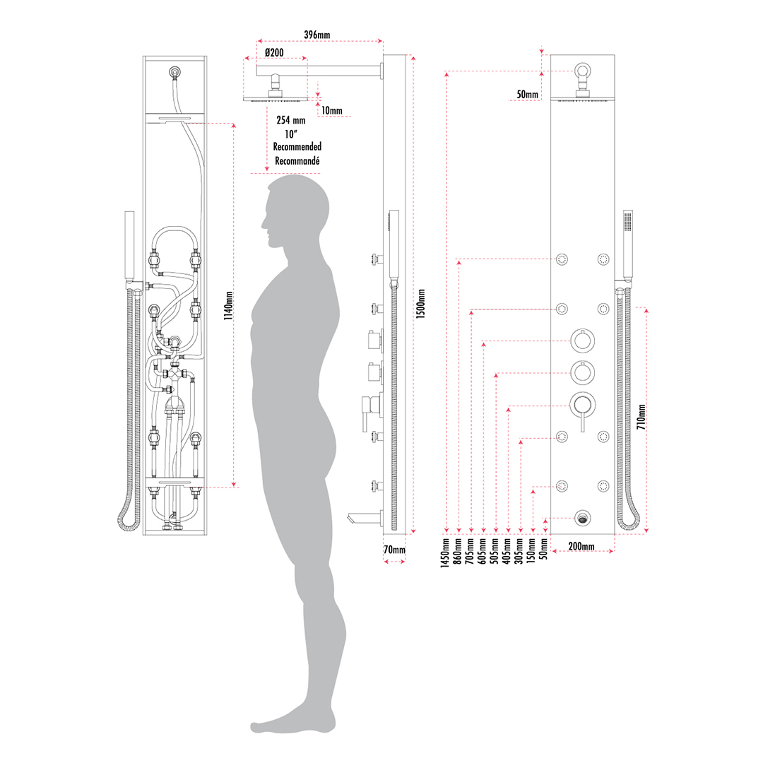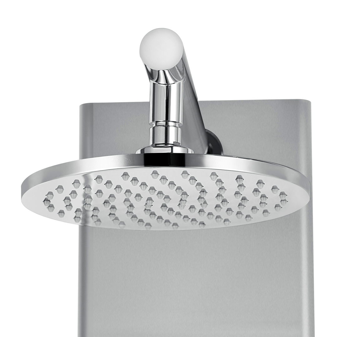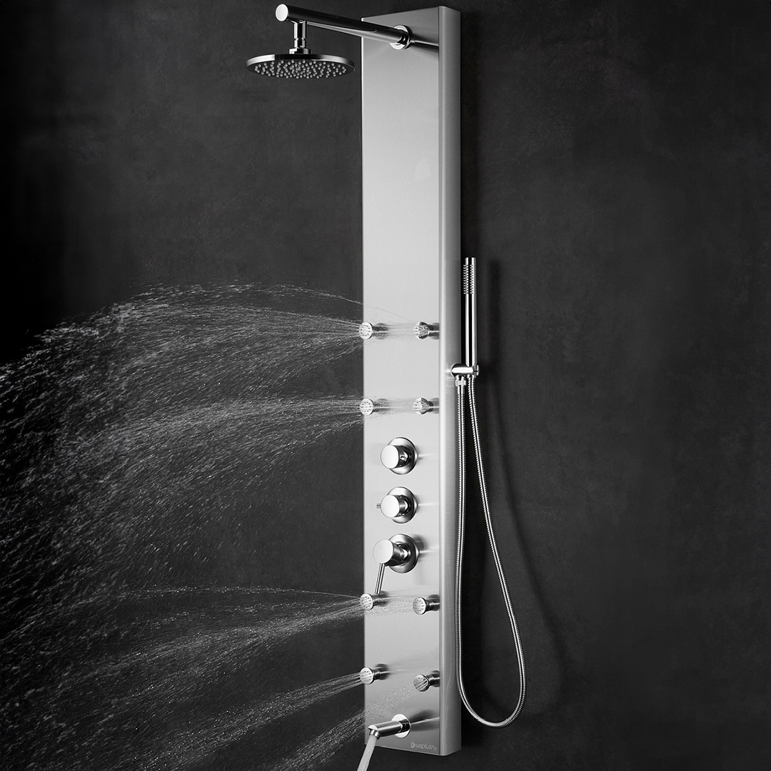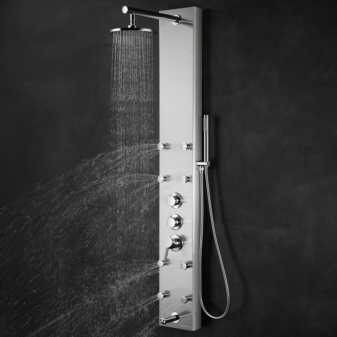 Fabriquée en acier inoxydable au fini brossé; Cartouche à pression équilibrée; 4 déviateurs indépendants; Bras de douche en laiton; Pommeau de douche rond en ABS de 8 po (20 cm); Douchette à 1 réglage en ABS; 8 jets de corps orientables; Buses anti-calcaire faciles à nettoyer; support à douchette en laiton; Boyau flexible et extensible de 59 po (1,5 m) en acier inoxydable avec double agrafage et raccords en laiton; Tuyaux d’alimentation souples en acier inoxydable tressés avec des raccords coudés; Débit de 9,5 L/min (2,5 gal US/min).