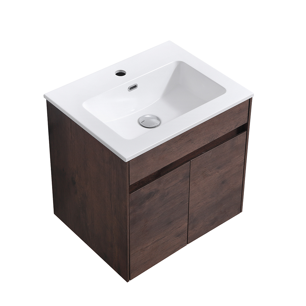 Meuble-lavabo mural au fini chêne rustique en laminé européen, bandes de chant en PVC, installation murale, lavabo blanc en pierre synthétique avec trop-plein, renvoi non inclus, 2 portes à fermeture lente, quincaillerie incluse