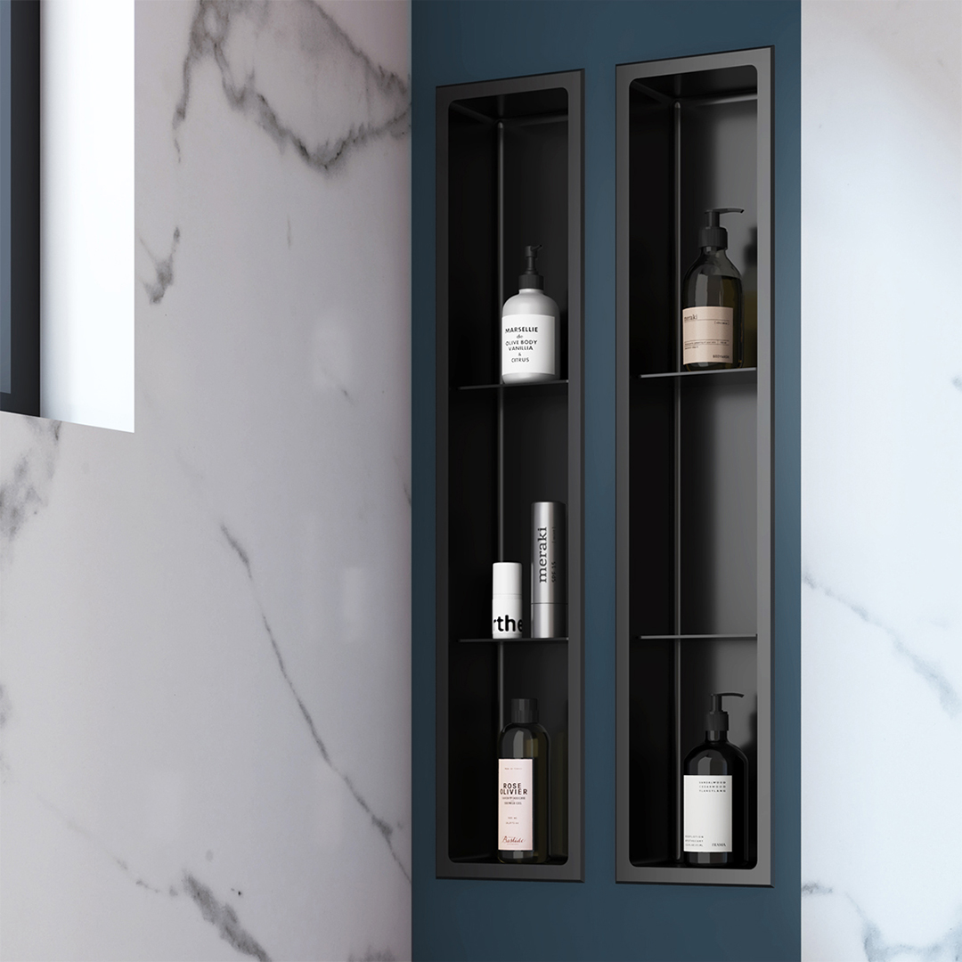 Niche de douche encastrée Layla NT0836BL en noir mat. 20 × 90 cm. Facile à installer, résistante à la corrosion, étanche.