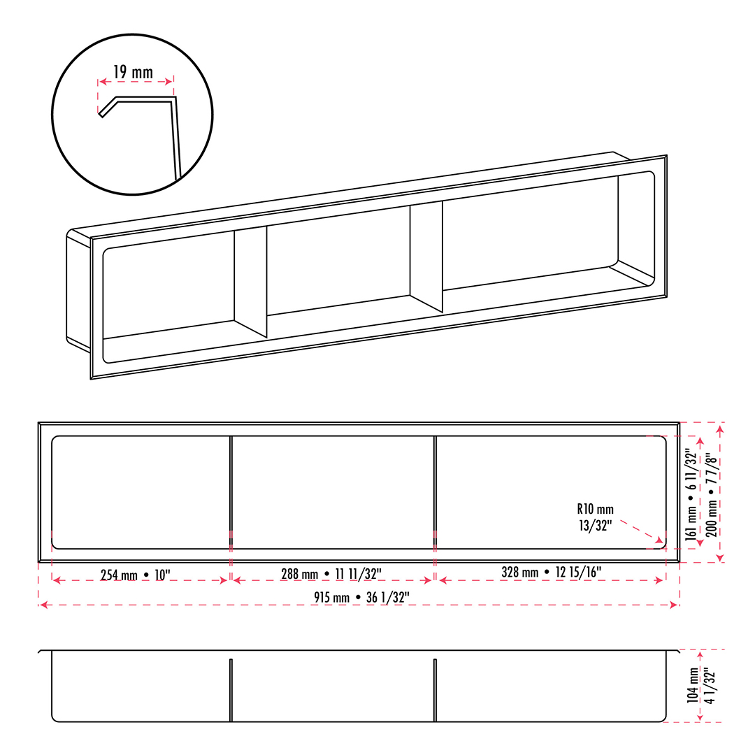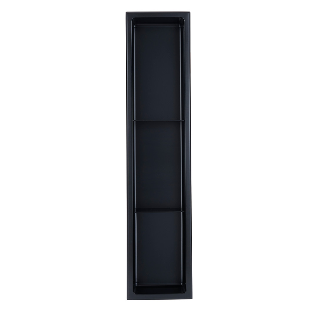La niche de douche encastrée Layla NT0836BL d’akuaplus® est fabriquée en acier inoxydable 304 calibre 18, fini noir mat. Dimensions 20 × 90 cm, avec 2 shelves, coins arrondis de 1 cm, pente légère pour l’égouttement et peinture électrostatique cuite. Entièrement étanche, facile à nettoyer, s’installe directement sur le mur sans carrelage. Peut être posée horizontalement ou verticalement. Certifiée cUPC, approuvée par les propriétaires, détaillants et professionnels partout au Canada avec Dimex360 Inc. depuis 2002. Cette niche de douche en acier inoxydable 304 est une étagère encastrée étanche qui ajoute un rangement mural moderne à la salle de bain. Son matériau résistant à la corrosion garantit la durabilité, tandis que l’installation encastrée offre une finition élégante et facile à nettoyer. Peut être installée horizontalement ou verticalement, avec 1 ou 2 tablettes. Idéale comme niche de douche encastrée inox, niche murale moderne ou étagère murale pour salle de bain.