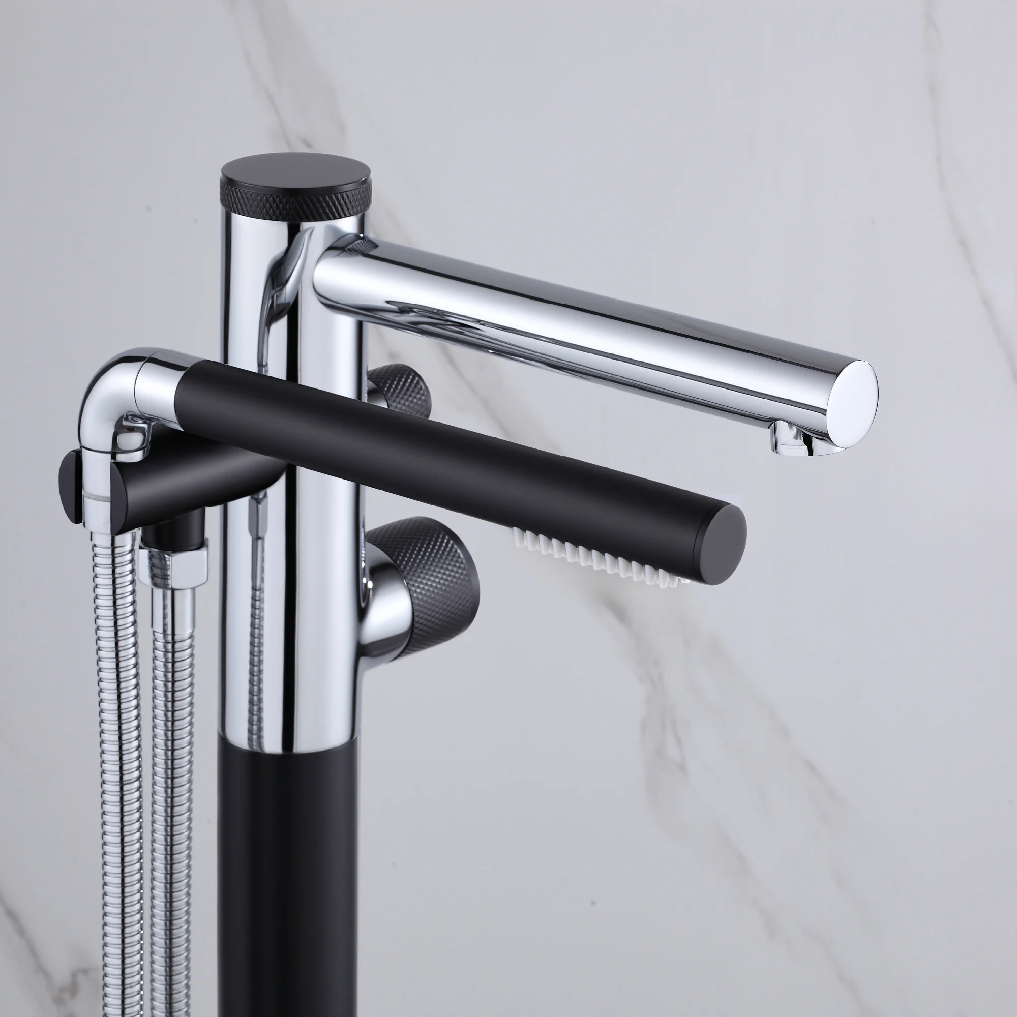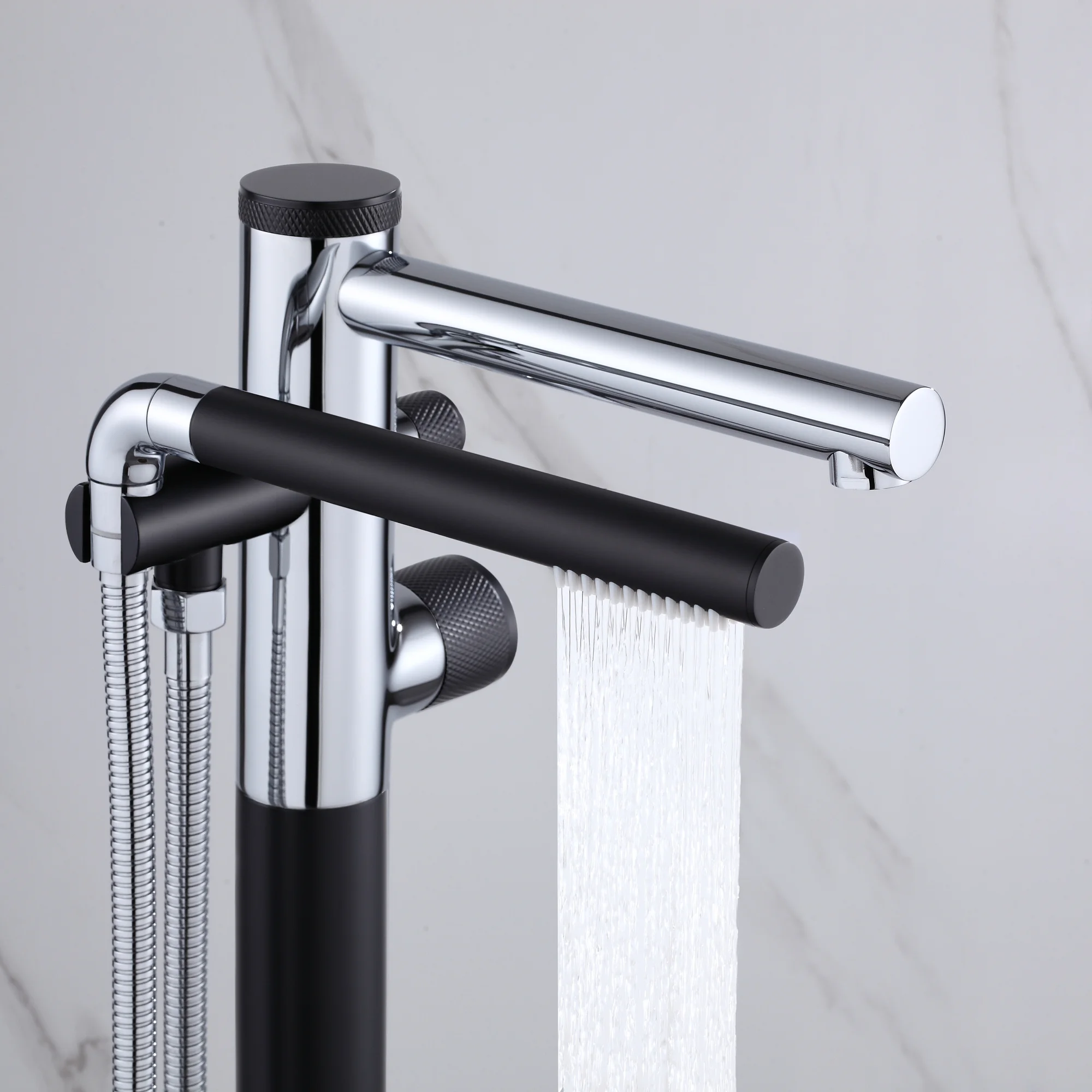 Le robinet de baignoire autoportant bicolore AKUALUX CLAUDIA FLSD5126CPBL met en valeur des finis contrastés (chrome et noir mat). Construction en laiton avec cartouche céramique, inclus douchette et boyau flexible. Installation sur pied pour un style moderne et épuré. Certifié cUPC, faisant partie de la ligne AKUALUX de Dimex360 Inc., repoussant les limites de l’élégance et du confort depuis 2002. Également appelé robinet de baignoire sur pied pour plus de clarté.