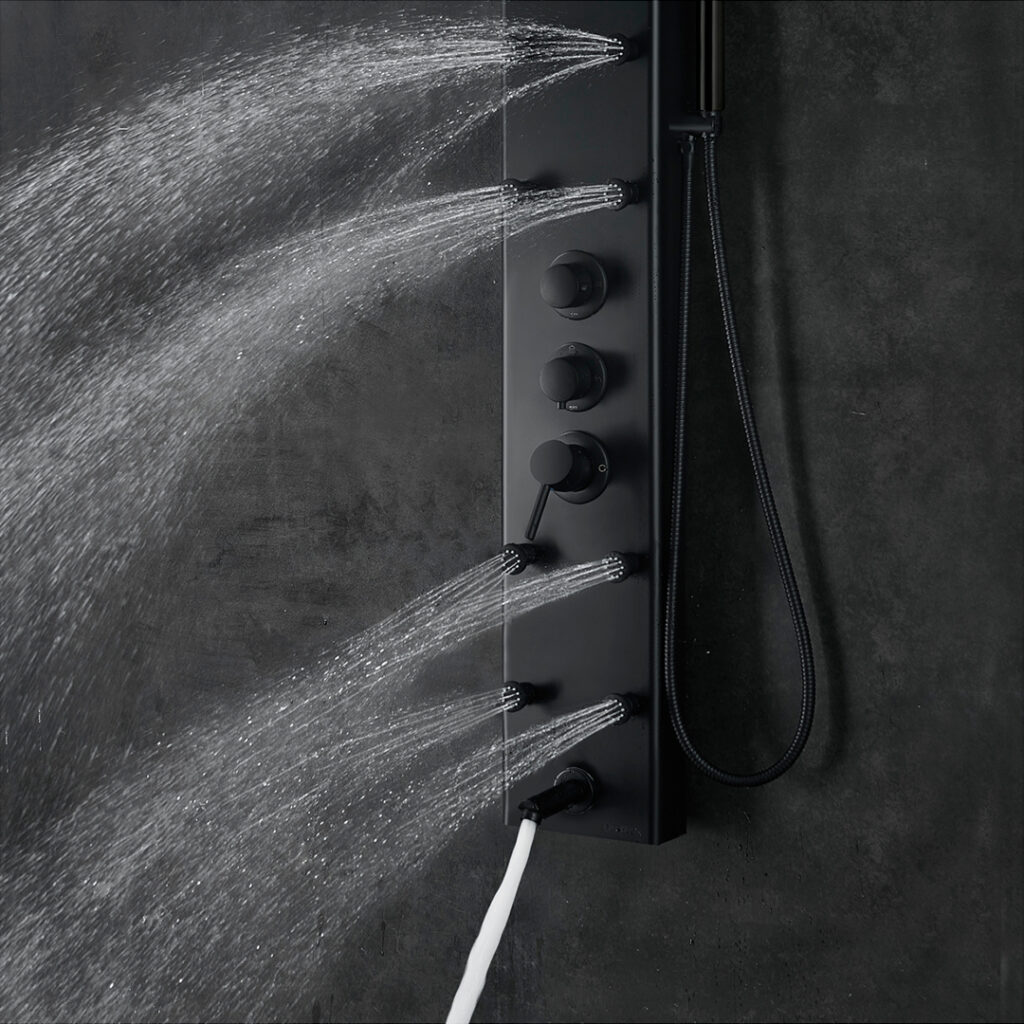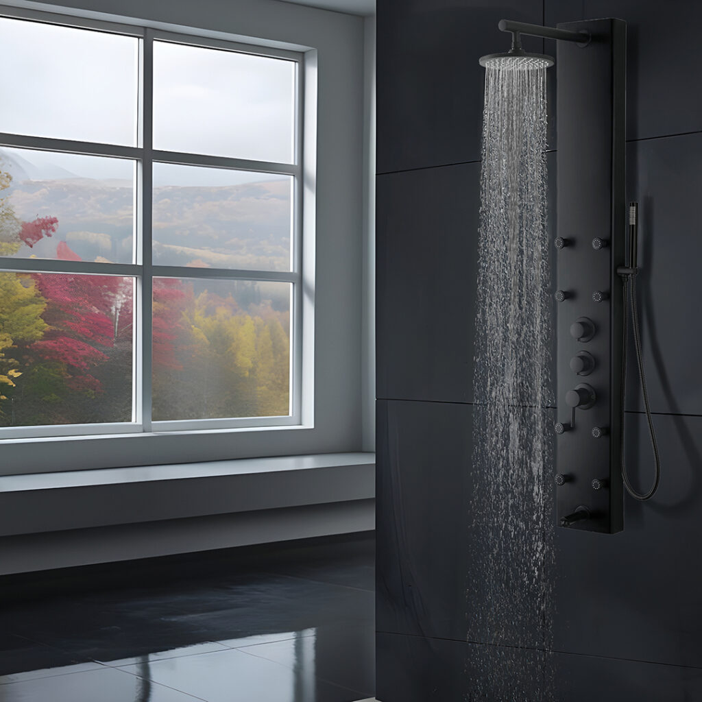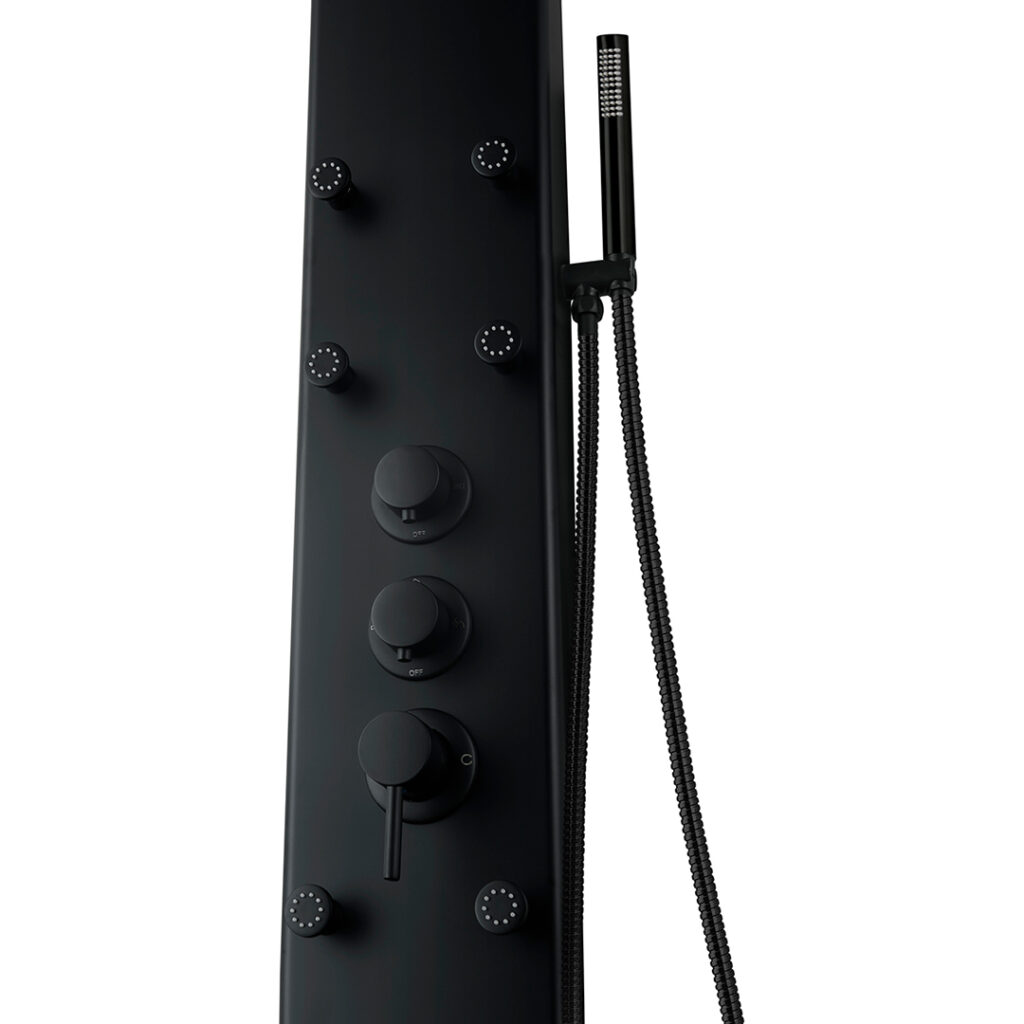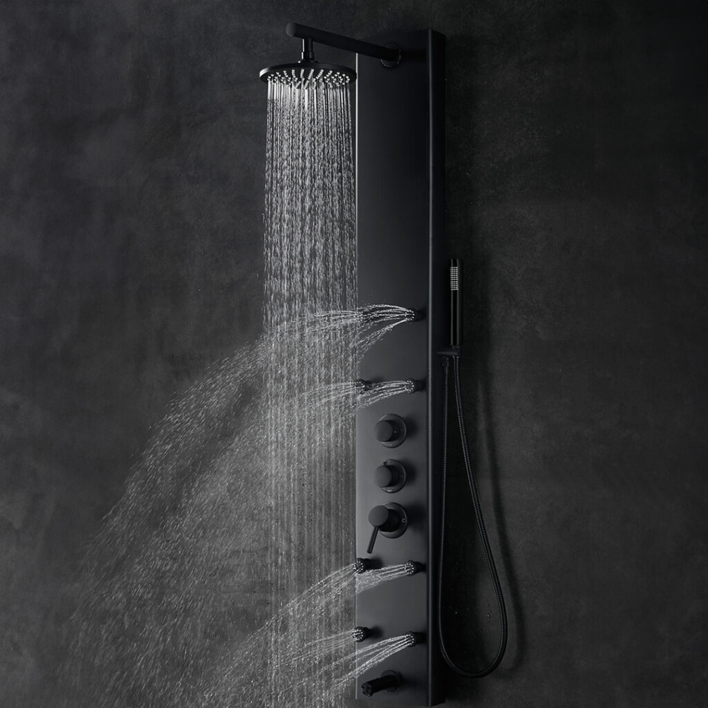 The Amelia SPB9999BL matte black pressure balance Shower panel features 8 body jets, an 8-inch (20.3 cm) swiveling rain Showerhead, and a brass handheld Shower. The 4-way diverter and independent diverter offer flexible water control for a luxurious Shower experience.
