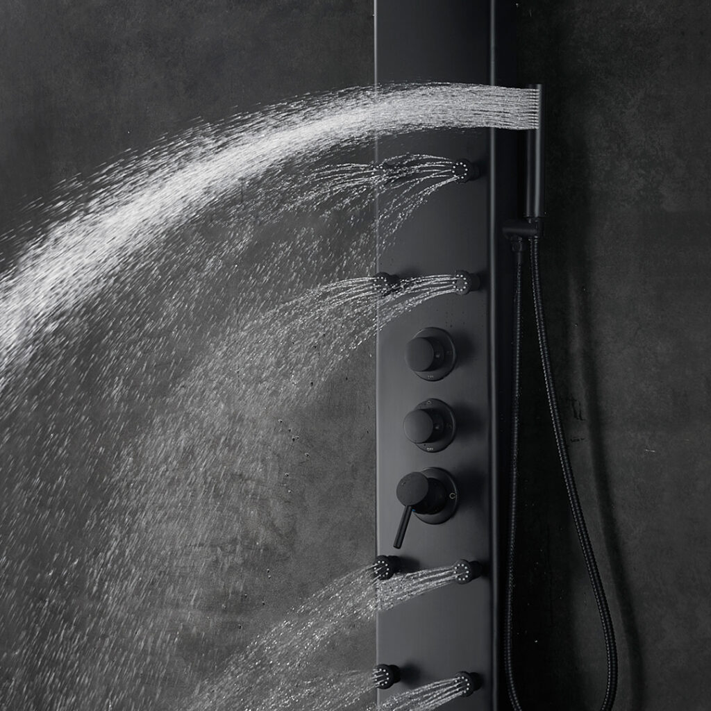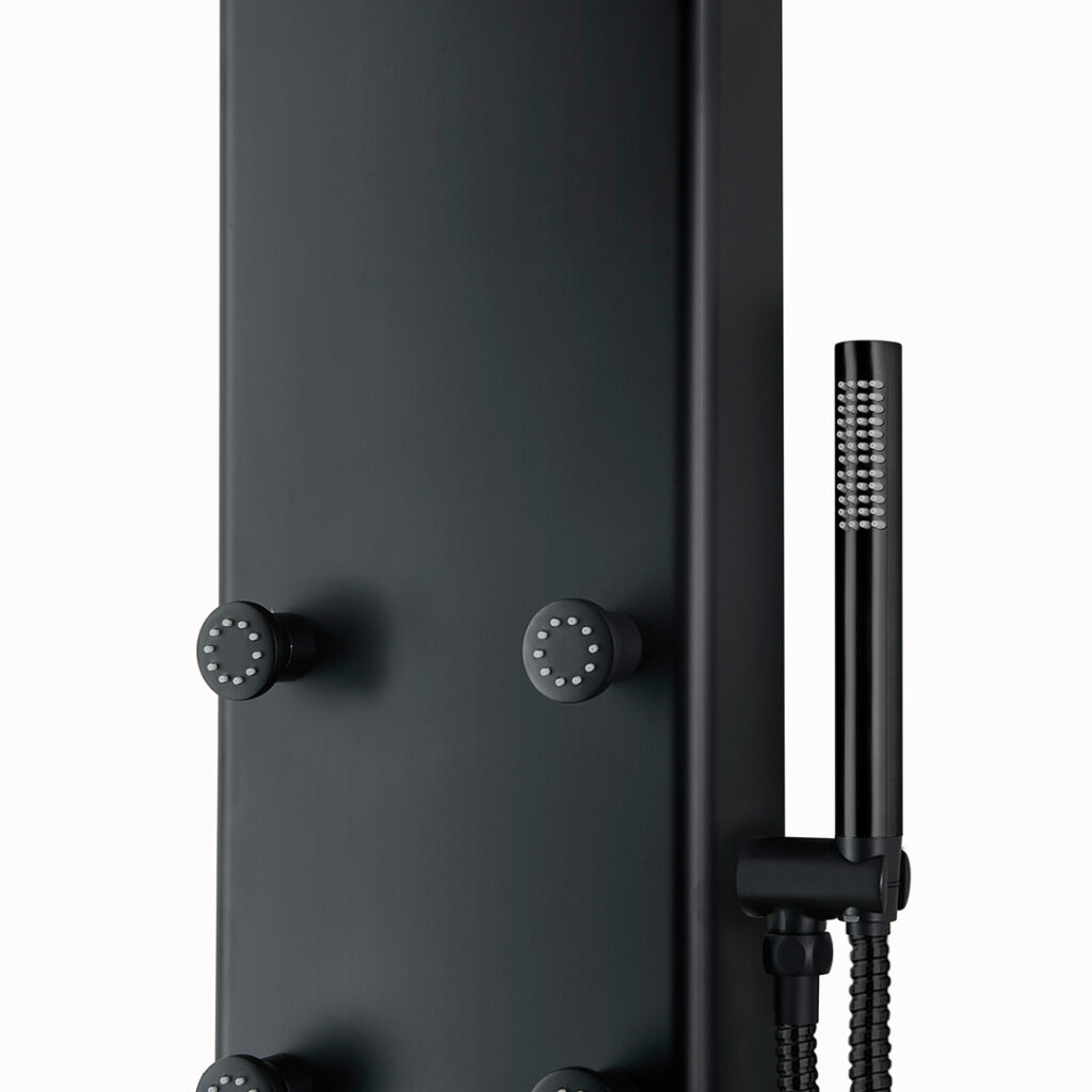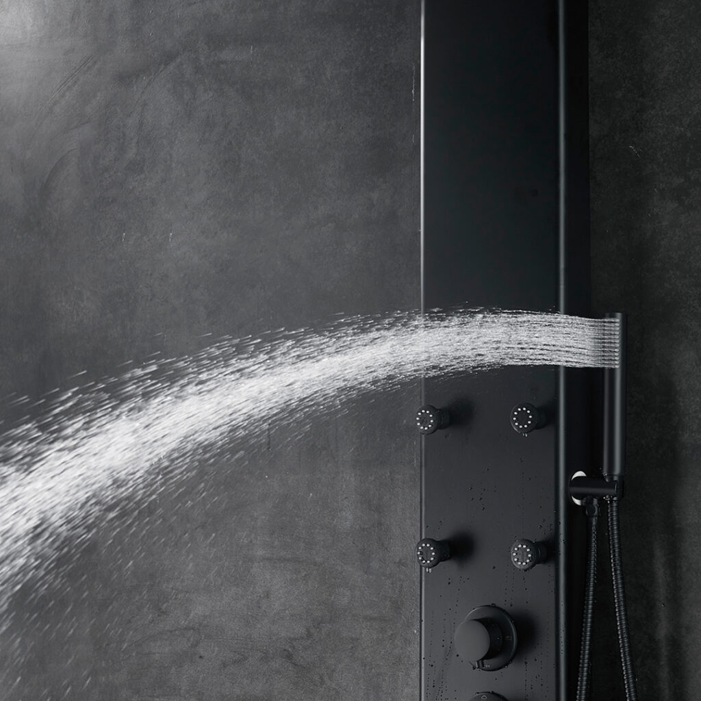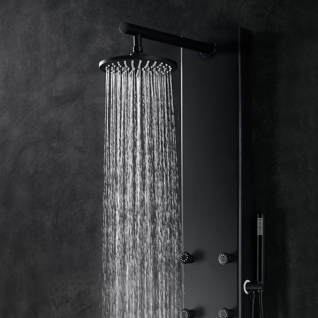 The Amelia SPB9999BL matte black pressure balance Shower panel features 8 body jets, an 8-inch (20.3 cm) swiveling rain Showerhead, and a brass handheld Shower. The 4-way diverter and independent diverter offer flexible water control for a luxurious Shower experience.