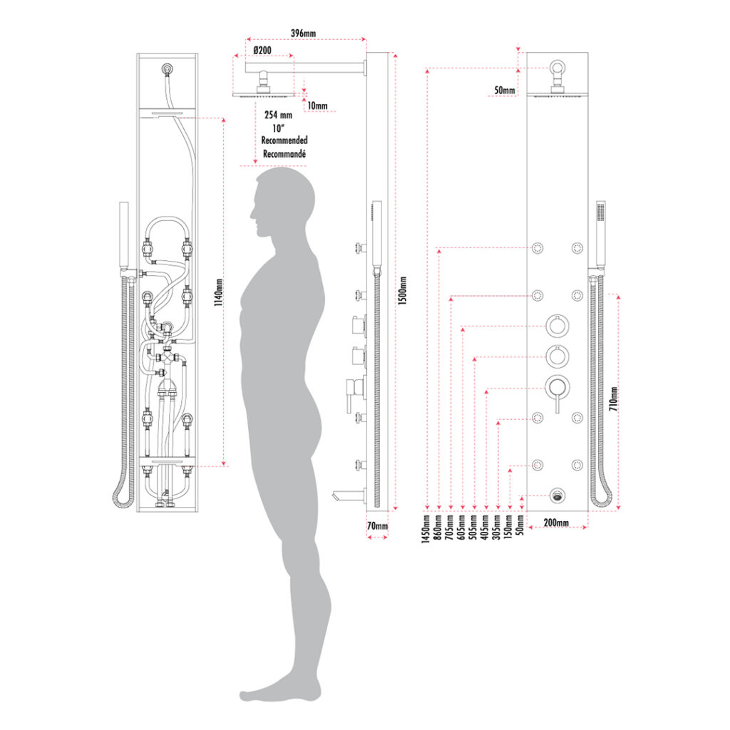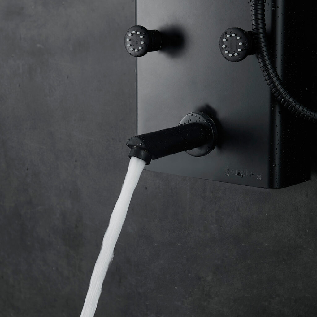La colonne de douche Amelia SPB9999BL à pression équilibrée en noir mat allie design moderne et haute performance. Elle comprend une pomme de douche orientable de 20,3 cm en ABS, 8 jets de corps en laiton avec des buses en gel de silice anti-obstruction, et une douchette en laiton. Dotée d’un bras de douche en laiton de 40,6 cm, d’un bec de bain en laiton, et d’un boyau flexible en acier inoxydable de 59 po (1,5 m) avec raccords en laiton, elle assure durabilité et flexibilité. Le déviateur 4 voies et le déviateur indépendant permettent un contrôle précis de l’eau. Facile à installer et certifiée cUPC, l’Amelia SPB9999BL modernise toute salle de bain avec un style élégant et fonctionnel. Caractéristiques : Fabriquée en acier inoxydable au fini noir mat; Cartouche à pression équilibrée; 4 déviateurs indépendants; Bras de douche en laiton; Pommeau de douche rond en ABS de 8 po (20 cm); Douchette à 1 réglage en ABS; 8 jets de corps orientables; Buses anti-calcaire faciles à nettoyer; Bec de bain en laiton; Support à douchette en laiton; Boyau flexible de 59 po (1,5 m) en acier inoxydable avec double agrafage et raccords en laiton; Tuyaux d'alimentation souples en acier inoxydable tressés avec des raccords coudés; Débit de 9,5 L/min (2,5 gal US/min). 20 x 46,6 x 150 cm • 7-7/8 x 18-5/16 x 59-1/16 po