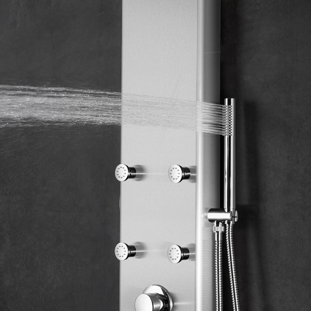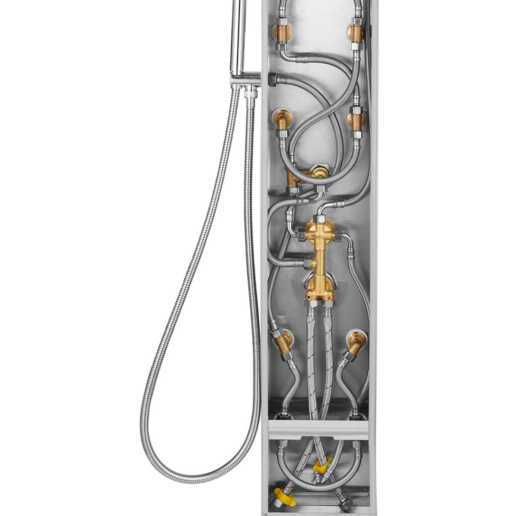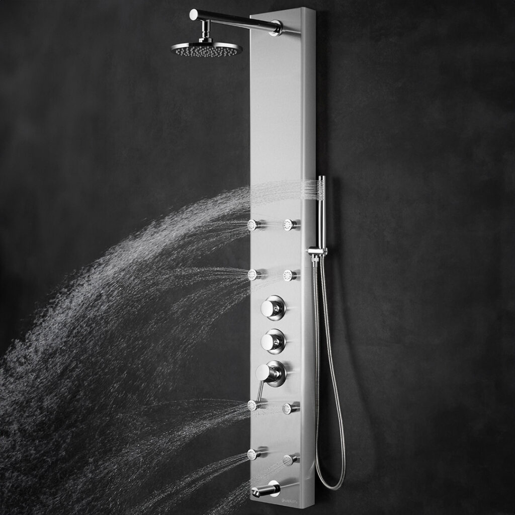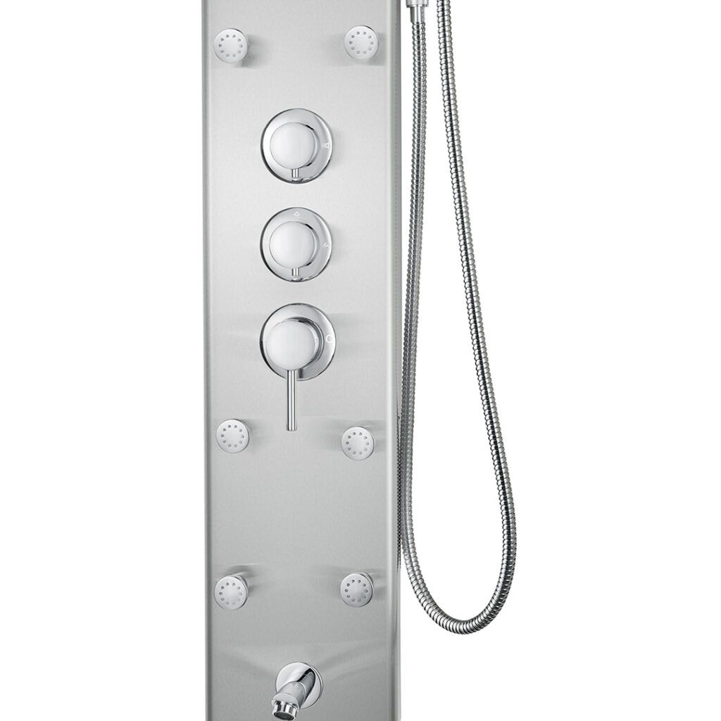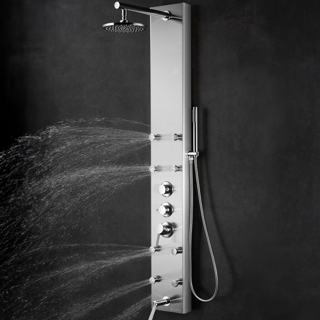 The Amelia SPB9999SS brushed stainless steel pressure balance Shower panel features 8 body jets, a round 8-inch (20 cm) Shower head and a brass handheld Shower for a contemporary look and luxurious experience.