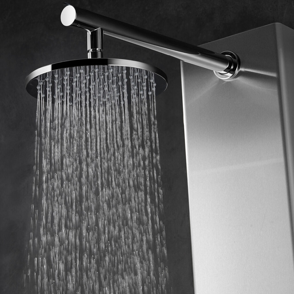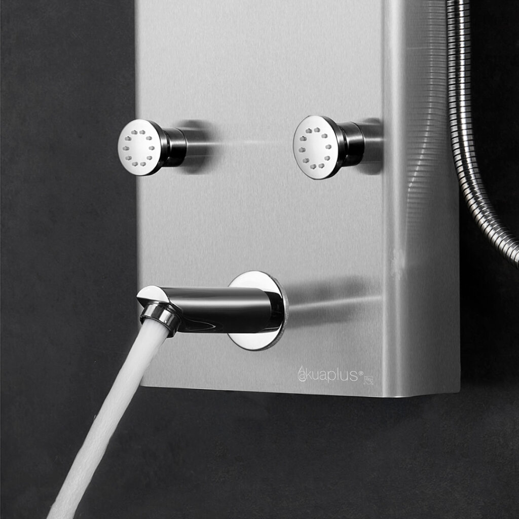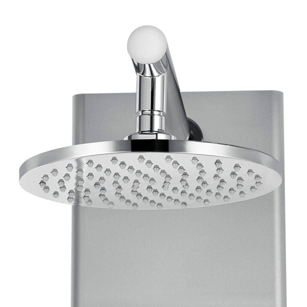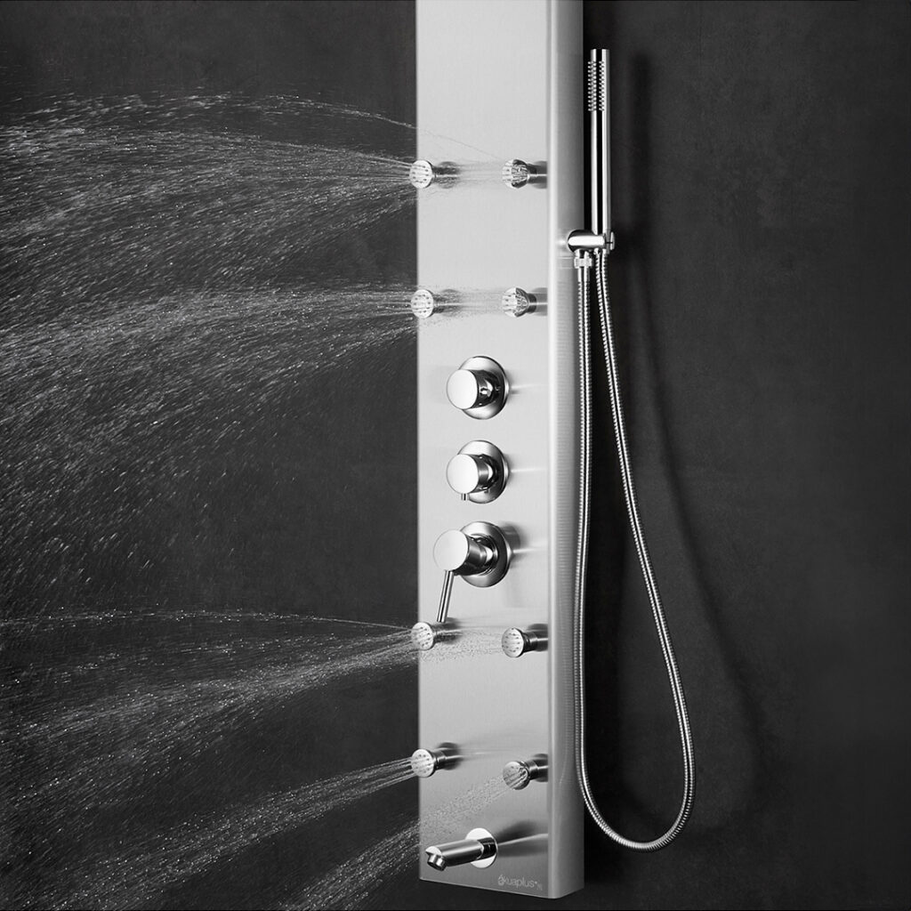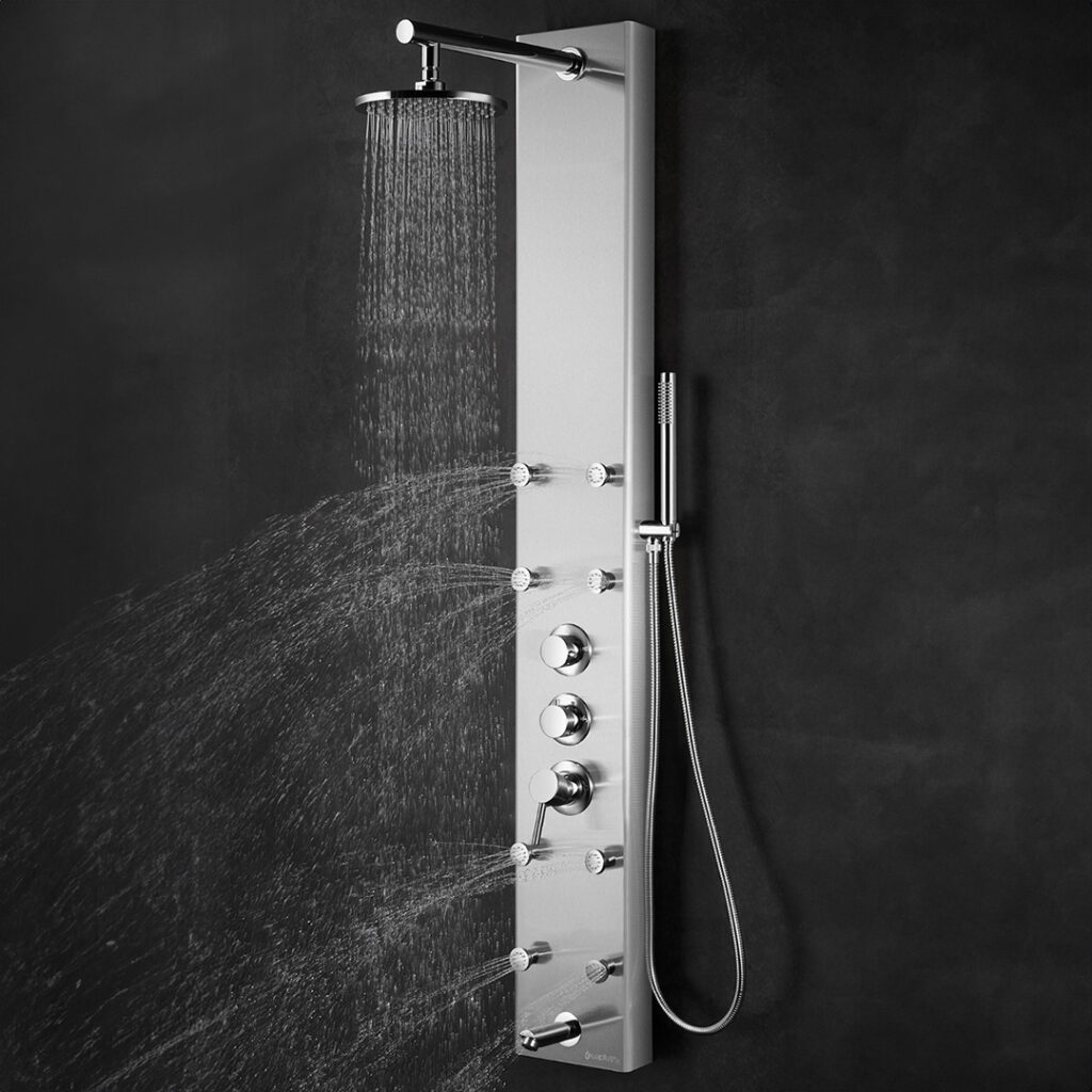 The Amelia SPB9999SS brushed stainless steel pressure balance Shower panel features 8 body jets, a round 8-inch (20 cm) Shower head and a brass handheld Shower for a contemporary look and luxurious experience.