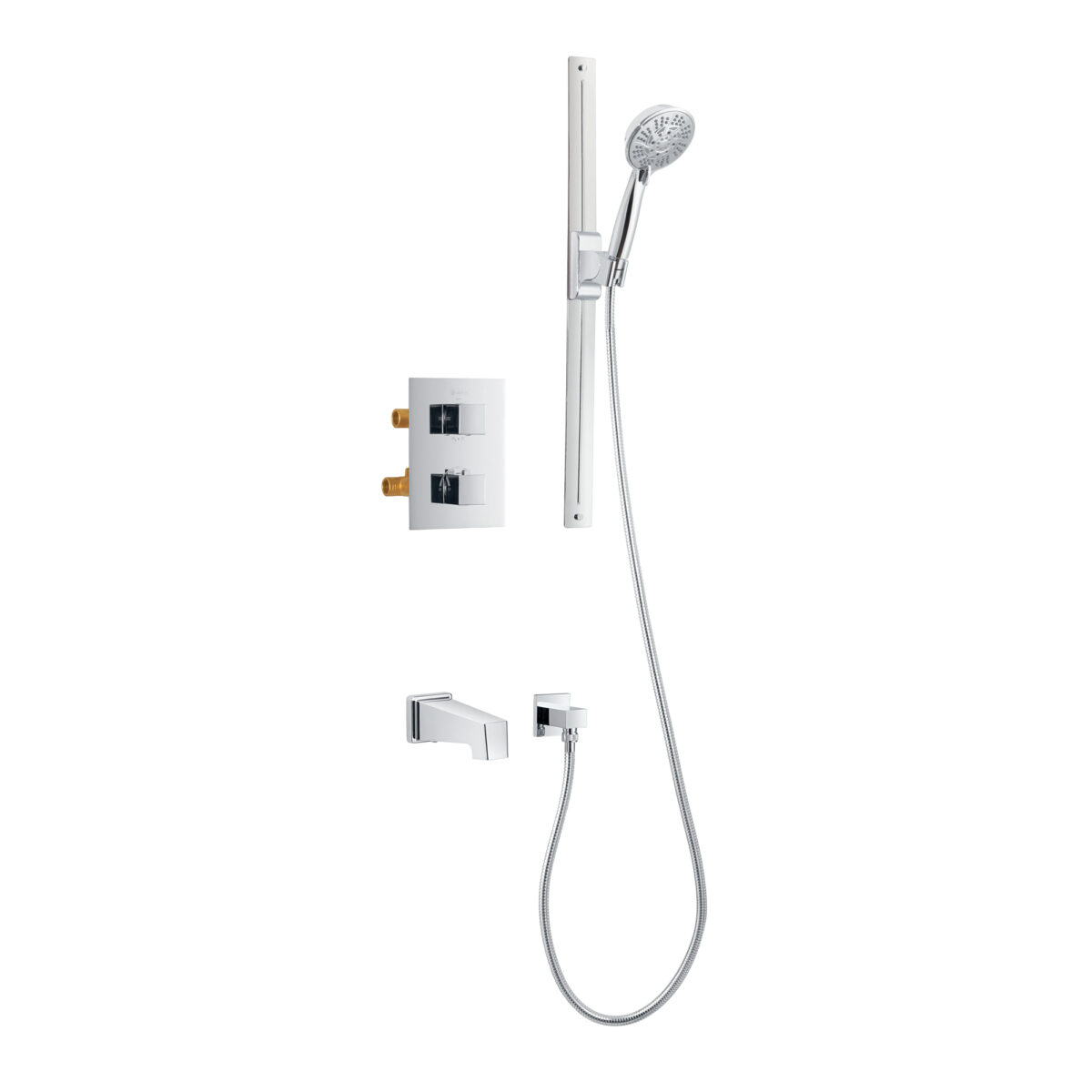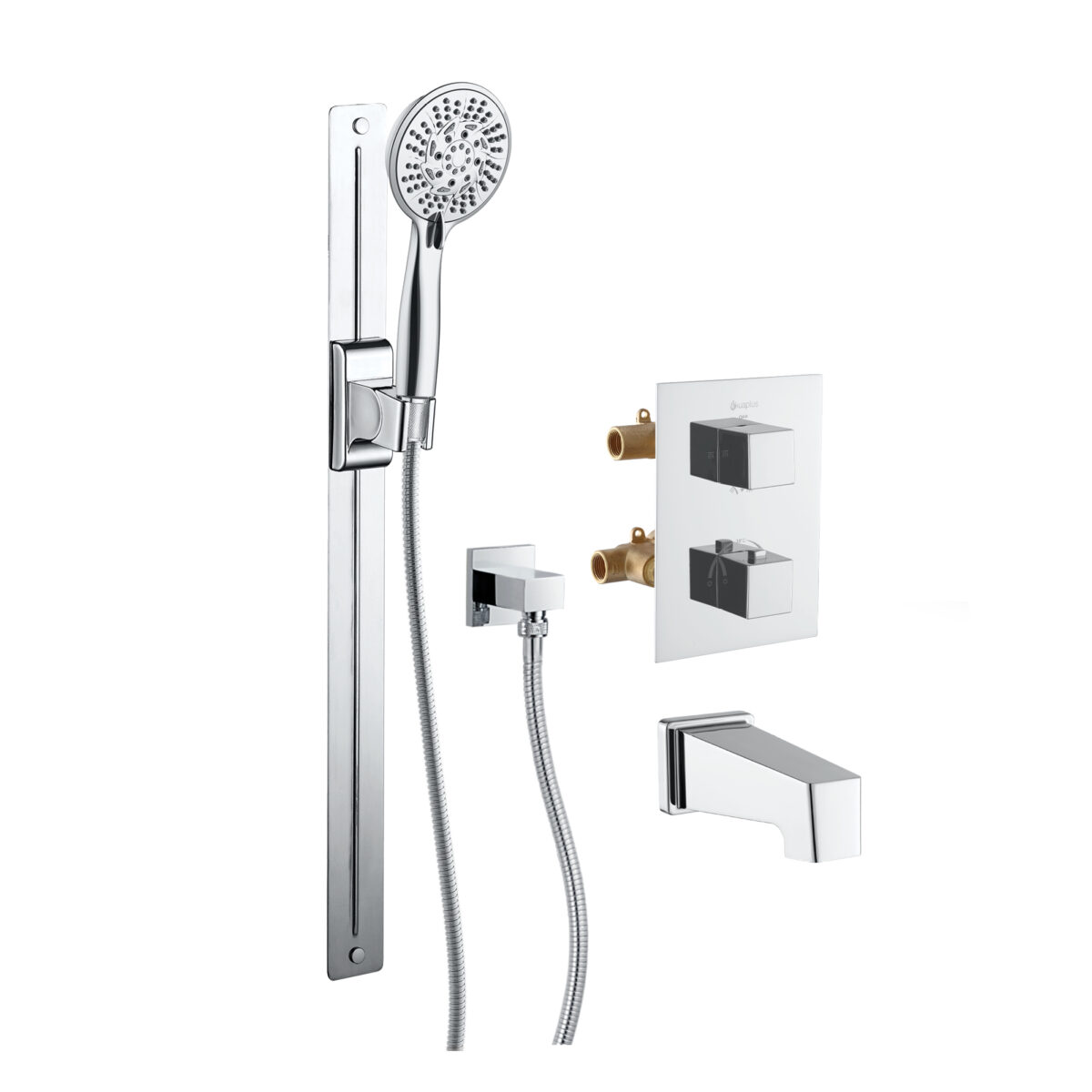 L’ensemble bain-douche magnétique thermostatique carré par akuaplus® est conçu pour offrir un contrôle précis de la température et une flexibilité optimale dans les installations résidentielles modernes. La valve de douche en laiton est équipée d’une cartouche thermostatique et d’une soupape d’arrêt intégrée, assurant un fonctionnement fiable et sécuritaire. Le déviateur 4 voies permet d’utiliser la douchette, le bec de bain, les deux simultanément ou d’interrompre l’écoulement selon les besoins. Les connexions femelles filetées de 1/2 po assurent une compatibilité avec les systèmes de plomberie nord-américains standards. La barre de douche en acier inoxydable mesure 26 3/16 po (66,5 cm) et peut être installée facilement à l’aide du ruban adhésif double face inclus, simplifiant l’installation sans compromettre la stabilité. La douchette à main en ABS à 10 réglages, dotée de buses anti-calcaire faciles à nettoyer, offre un débit de 9,5 L/min (2,5 gal US/min) conforme aux normes d’économie d’eau. Son support magnétique ajustable en ABS permet un positionnement précis et un maintien sécurisé. L’ensemble comprend également un boyau flexible de 59 po (1,5 m) en acier inoxydable à double agrafage avec raccords en laiton, assurant durabilité et fiabilité. Le raccord coudé en laiton (mâle/mâle, 1/2 po) permet une connexion sécurisée, tandis que le bec de bain à glissement en zinc, mesurant 5 3/4 po (14,6 cm), assure un remplissage efficace de la baignoire. Cet ensemble est certifié cUPC, garantissant sa conformité aux normes nord-américaines de plomberie.