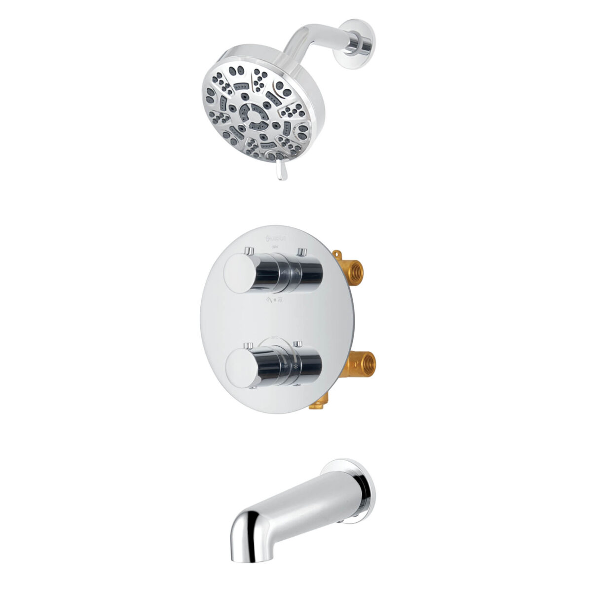 L’ensemble bain-douche thermostatique rond à 4 voies avec pommeau de douche à 8 réglages par akuaplus® est conçu pour offrir un contrôle précis de la température et une performance fiable dans les installations résidentielles modernes. La valve en laiton est équipée d’une cartouche thermostatique assurant une température d’eau constante et sécuritaire, ainsi que d’une soupape d’arrêt intégrée facilitant l’entretien. Le déviateur 4 voies permet d’utiliser le pommeau de douche, le bec de bain, les deux simultanément ou d’interrompre complètement l’écoulement. Les connexions femelle filetées de 1/2 po assurent une compatibilité avec les standards nord-américains de plomberie. Le système comprend un bras de douche en laiton de 6 po (15,24 cm) avec bride murale et un pommeau de douche pivotant à 8 réglages muni de buses anti-calcaire faciles à nettoyer. Il offre un débit contrôlé de 9,5 L/min (2,5 gal US/min), combinant confort et efficacité. Le bec de bain à glissement en zinc, mesurant 7 3/4 po (19,5 cm), permet un remplissage rapide et efficace de la baignoire. L’ensemble est certifié cUPC, garantissant sa conformité aux normes nord-américaines de plomberie.