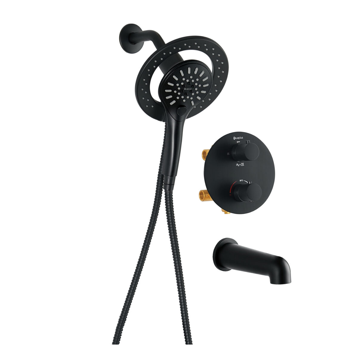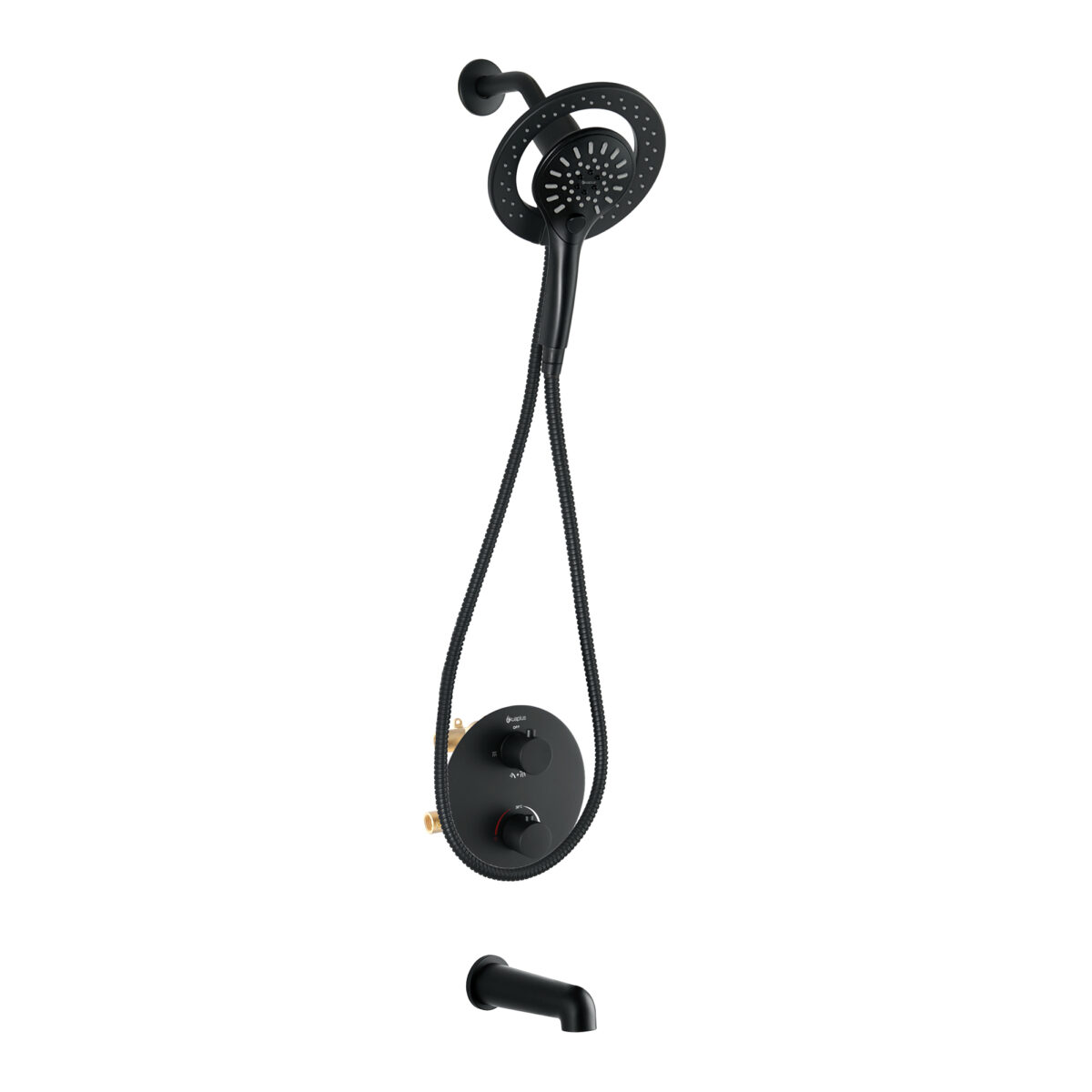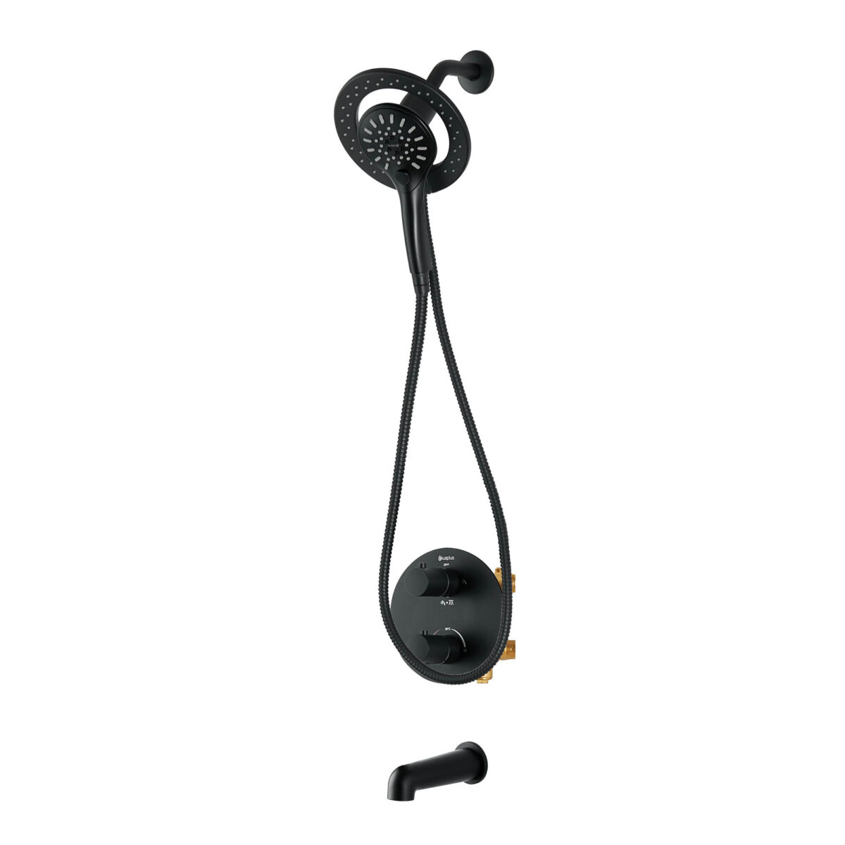 L’ensemble bain-douche magnétique thermostatique rond à 3 réglages par akuaplus® est conçu pour offrir un contrôle précis de la température, une grande polyvalence et un design moderne adapté aux salles de bain résidentielles. La valve de douche en laiton est équipée d’une cartouche thermostatique qui maintient une température d’eau constante et sécuritaire, ainsi que d’une soupape d’arrêt intégrée facilitant l’entretien. Le déviateur 4 voies permet de sélectionner le mode combo, le bec de bain, les deux simultanément ou l’arrêt complet de l’écoulement. Les connexions femelle filetées de 1/2 po assurent une compatibilité avec les standards nord-américains de plomberie. Le système combo comprend une douchette magnétique en ABS à 3 réglages avec bouton poussoir, permettant d’activer le pommeau de douche pivotant de 7 3/8 po (18,7 cm) en ABS. Les buses anti-calcaire facilitent l’entretien et assurent un débit de 9,5 L/min (2,5 gal US/min). Le bras de douche en laiton de 6 po (15,24 cm), muni d’une bride, garantit une installation stable et durable. Le boyau flexible de 59 po (1,5 m) en acier inoxydable à double agrafage avec raccords en laiton assure fiabilité et longévité. Le bec de bain à glissement en zinc, mesurant 7 3/4 po (19,5 cm), permet un remplissage efficace de la baignoire. Cet ensemble est certifié cUPC, assurant sa conformité aux normes nord-américaines de plomberie.