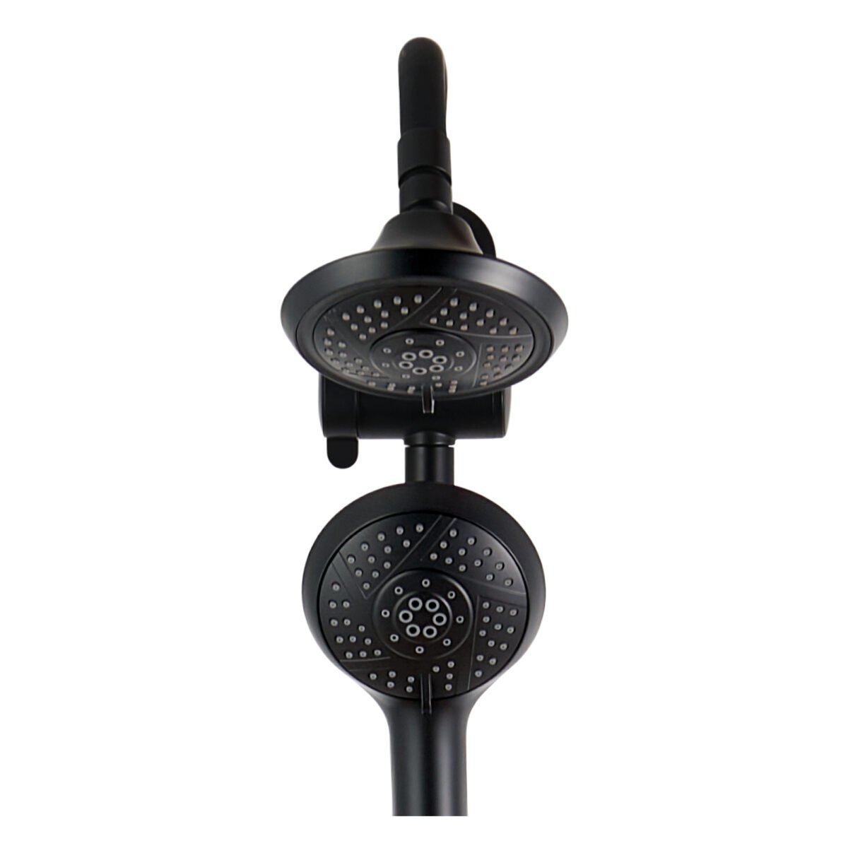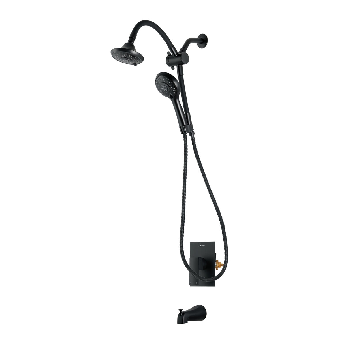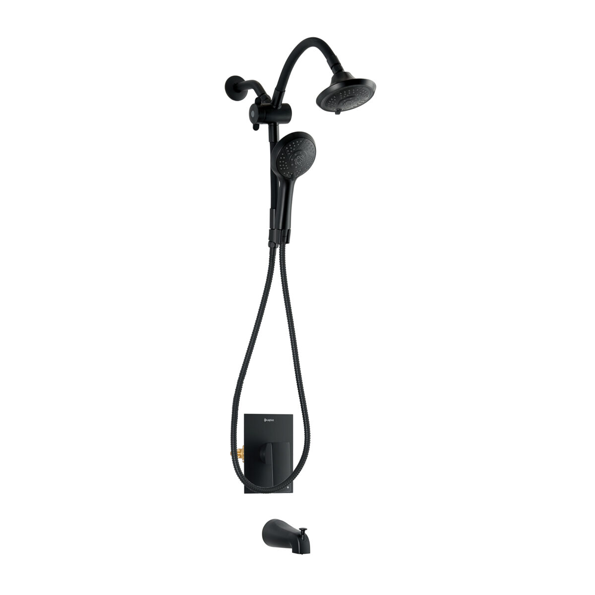 Ensemble bain-douche akuaplus® LILA avec valve à pression équilibrée, système de douche flexible, pommeau et douchette à 5 réglages, et bec de bain rond à glissement au fini noir mat.