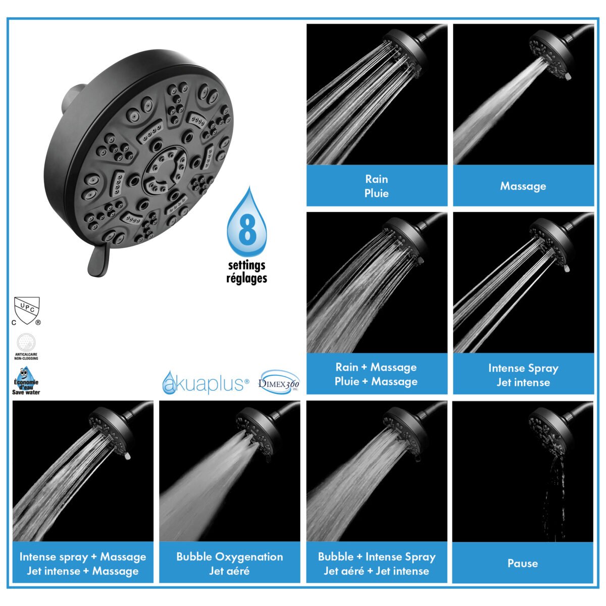 L’ensemble bain-douche à pression équilibrée akuaplus® est conçu pour offrir performance, sécurité et fiabilité dans les installations résidentielles modernes. La valve de douche en laiton est munie d’une cartouche à pression équilibrée assurant une température d’eau stable et réduisant les variations soudaines de pression. Elle comprend une soupape d’arrêt intégrée ainsi que des connexions femelle filetées 1/2 po pour une installation sécuritaire et durable. Le déviateur 3 voies permet d’utiliser le pommeau de douche, le bec de bain ou les deux simultanément, offrant une flexibilité optimale. Le pommeau en ABS à 8 réglages avec fonction pause est doté de buses anti-calcaire faciles à nettoyer, favorisant un entretien simplifié et une performance durable. L’ensemble inclut un bras de douche en laiton de 6 po (15,24 cm) avec bride pour une installation murale solide, ainsi qu’un support à douchette en ABS. Le bec de bain à glissement en zinc de 7 3/4 po (19,5 cm) s’installe facilement sur un tuyau en cuivre standard. Le débit maximal est de 9,5 L/min (2,5 gal US/min). Conçu pour les applications résidentielles, cet ensemble est certifié cUPC, garantissant sa conformité aux normes nord-américaines de plomberie.