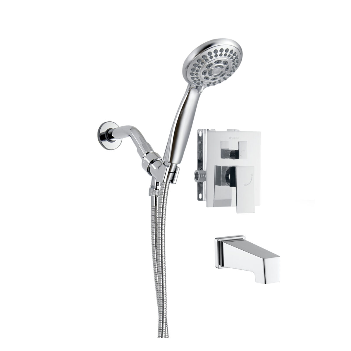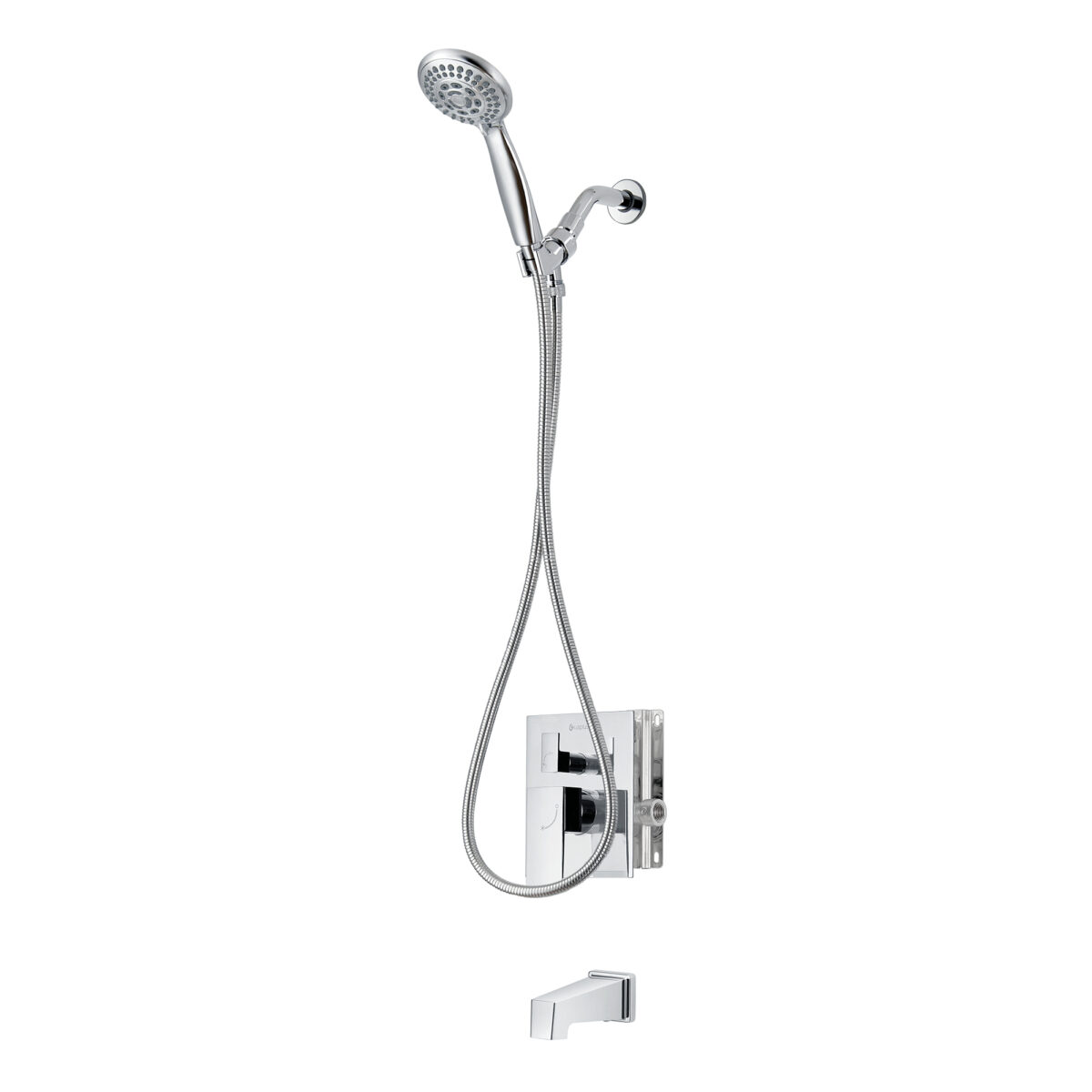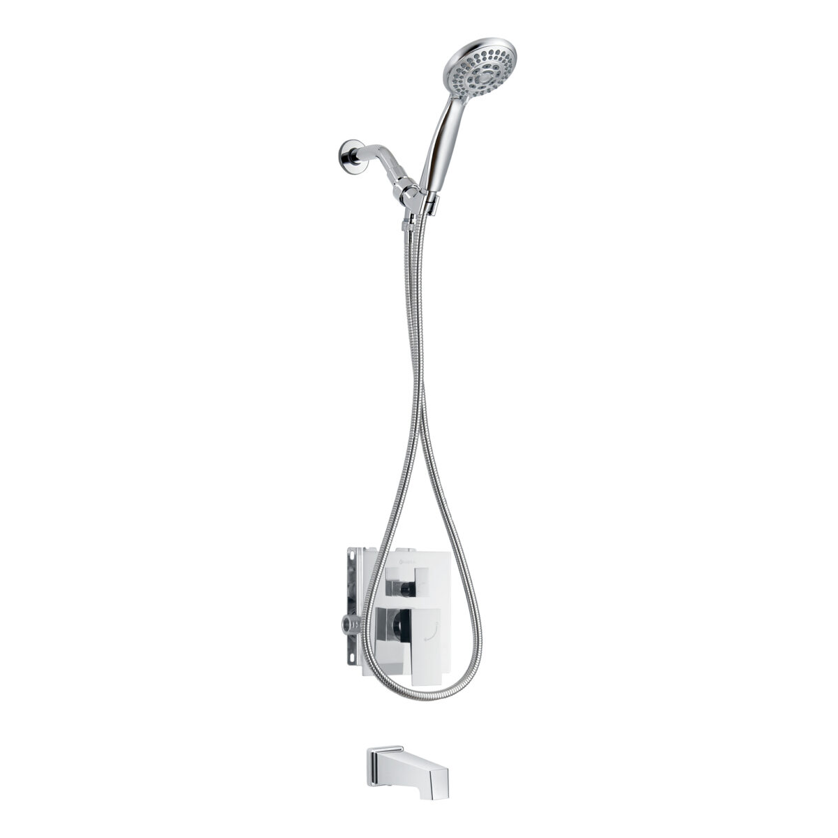 L’ensemble bain-douche à pression équilibrée akuaplus® est conçu pour offrir performance, fiabilité et sécurité dans les installations résidentielles modernes. La valve de douche en laiton est munie d’une cartouche à pression équilibrée assurant une température d’eau stable et réduisant les variations soudaines de pression. Elle comprend une soupape d’arrêt intégrée ainsi que des connexions femelle filetées 1/2 po pour une installation durable et sécuritaire. Le déviateur 3 voies permet d’utiliser la douchette, le bec de bain ou les deux simultanément, offrant une flexibilité optimale selon les besoins. L’ensemble comprend un bras de douche en laiton de 6 po (15,24 cm) avec bride pour une installation murale solide, ainsi qu’un support à douchette en ABS. La douchette en ABS à 5 réglages est dotée de buses anti-calcaire faciles à nettoyer, favorisant un entretien simplifié et une performance durable. Elle est accompagnée d’un boyau flexible de 59 po (1,5 m) en acier inoxydable à double agrafage avec raccords en laiton, assurant robustesse et résistance à la corrosion. Le bec de bain à glissement en zinc de 5 3/4 po (14,6 cm) s’installe facilement sur un tuyau en cuivre standard. Le débit maximal est de 9,5 L/min (2,5 gal US/min). Conçu pour les applications résidentielles, cet ensemble est certifié cUPC, garantissant sa conformité aux normes nord-américaines de plomberie.