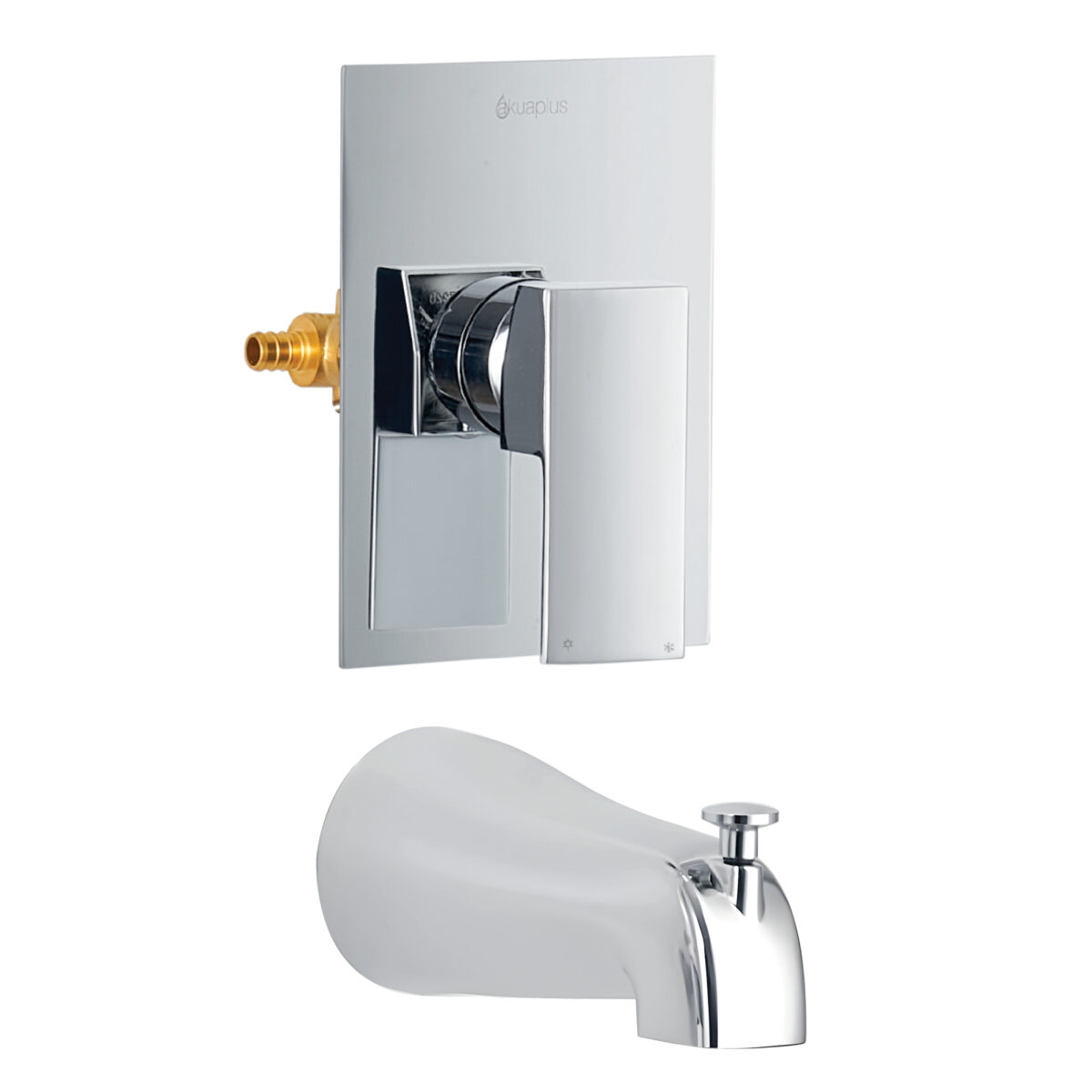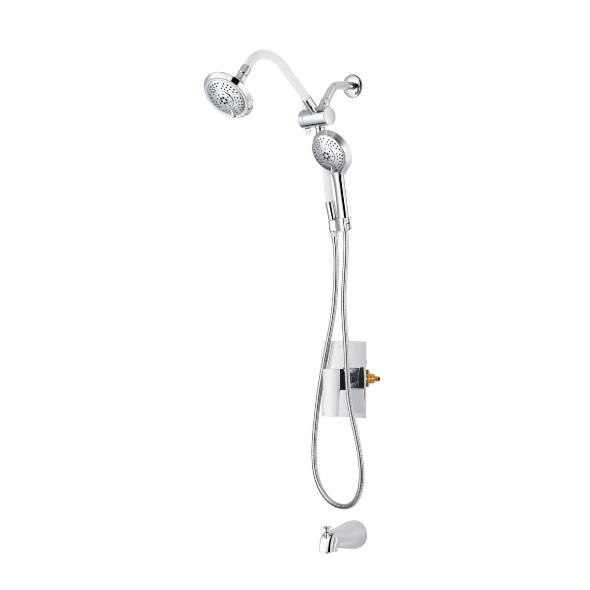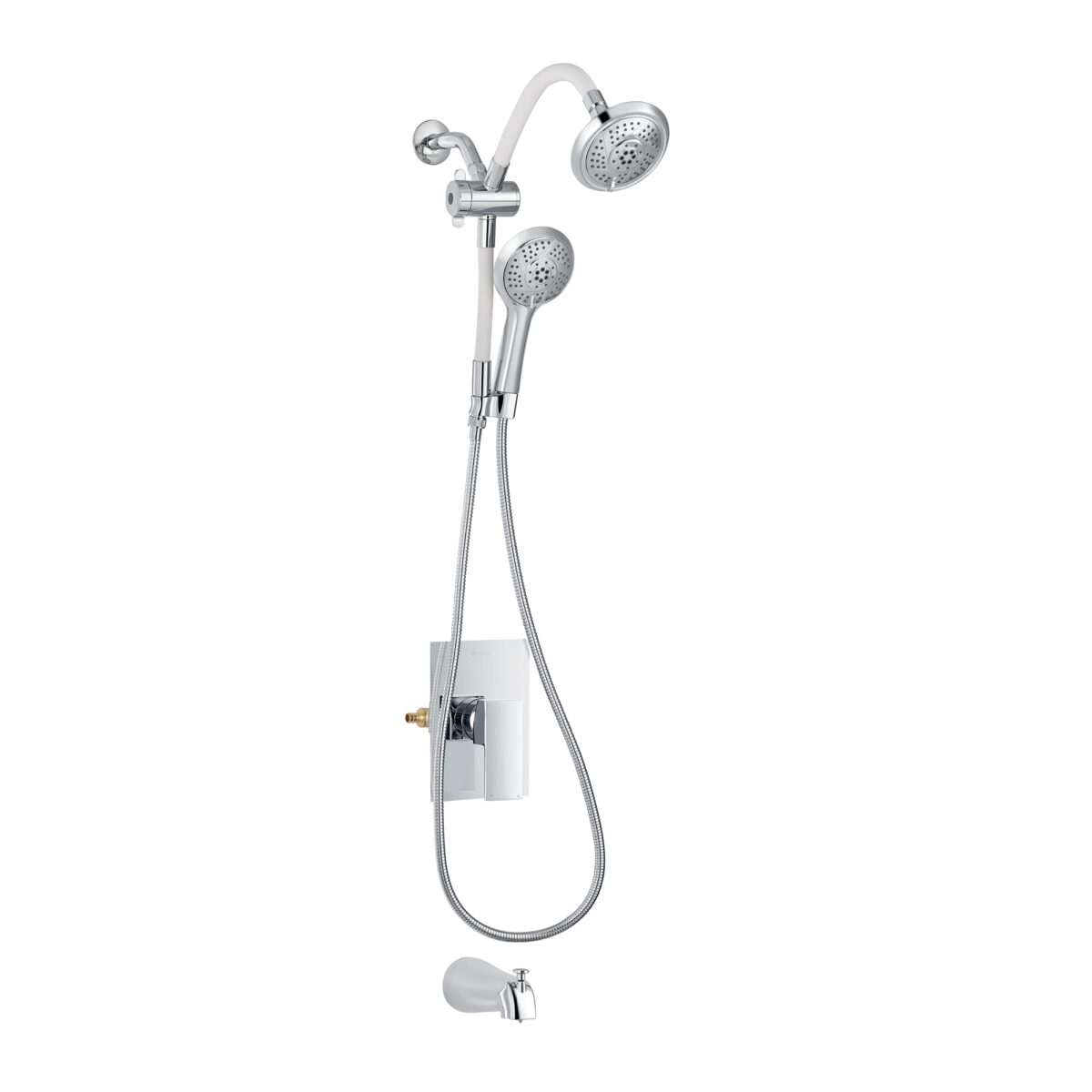Ensemble bain-douche akuaplus® LILA avec valve à pression équilibrée, système de douche flexible, pommeau et douchette à 5 réglages, et bec de bain rond à glissement au fini chrome.