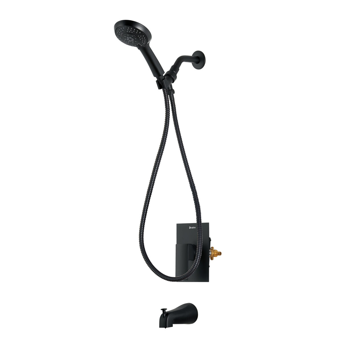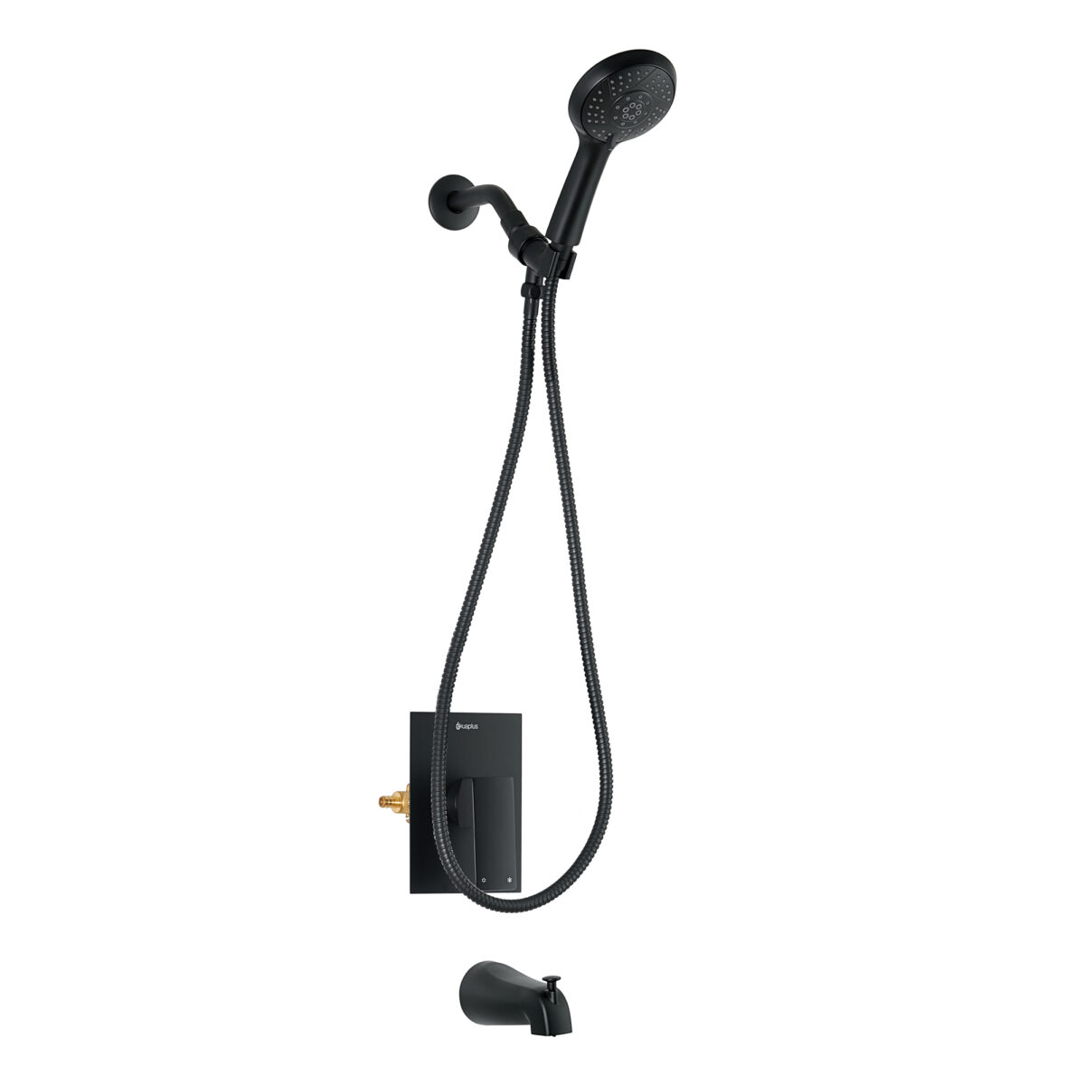 Ensemble bain-douche akuaplus® INA avec valve à pression équilibrée, douchette à 5 réglages, boyau flexible en acier inoxydable et bec de bain rond à glissement au fini noir mat.