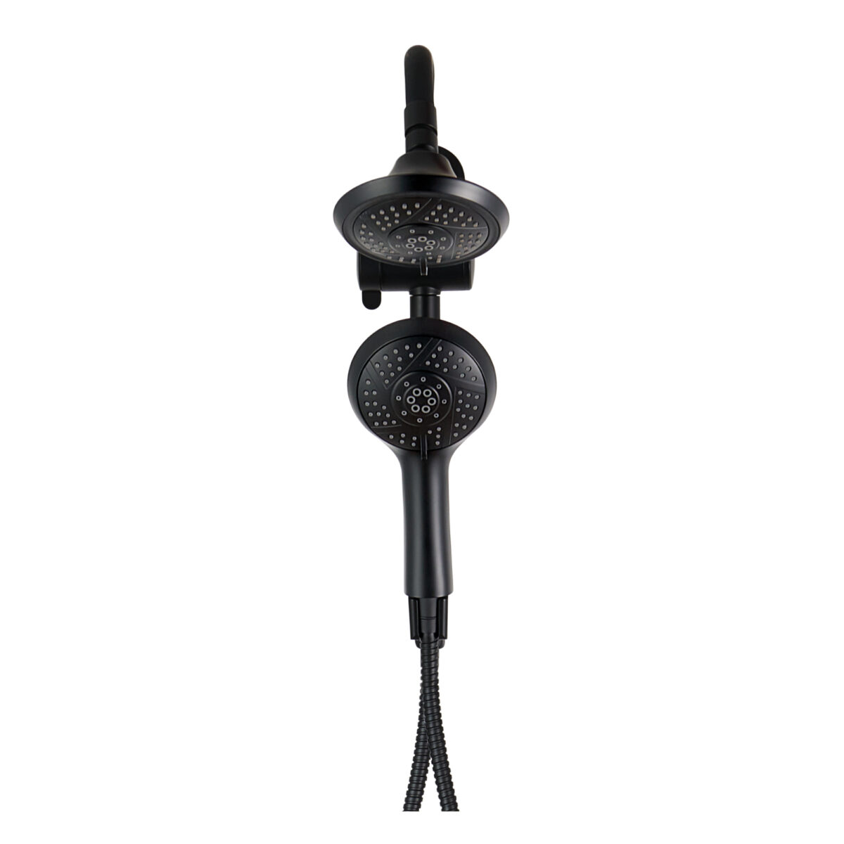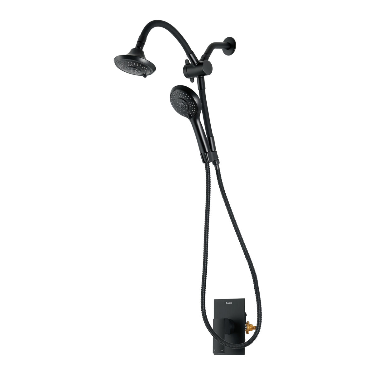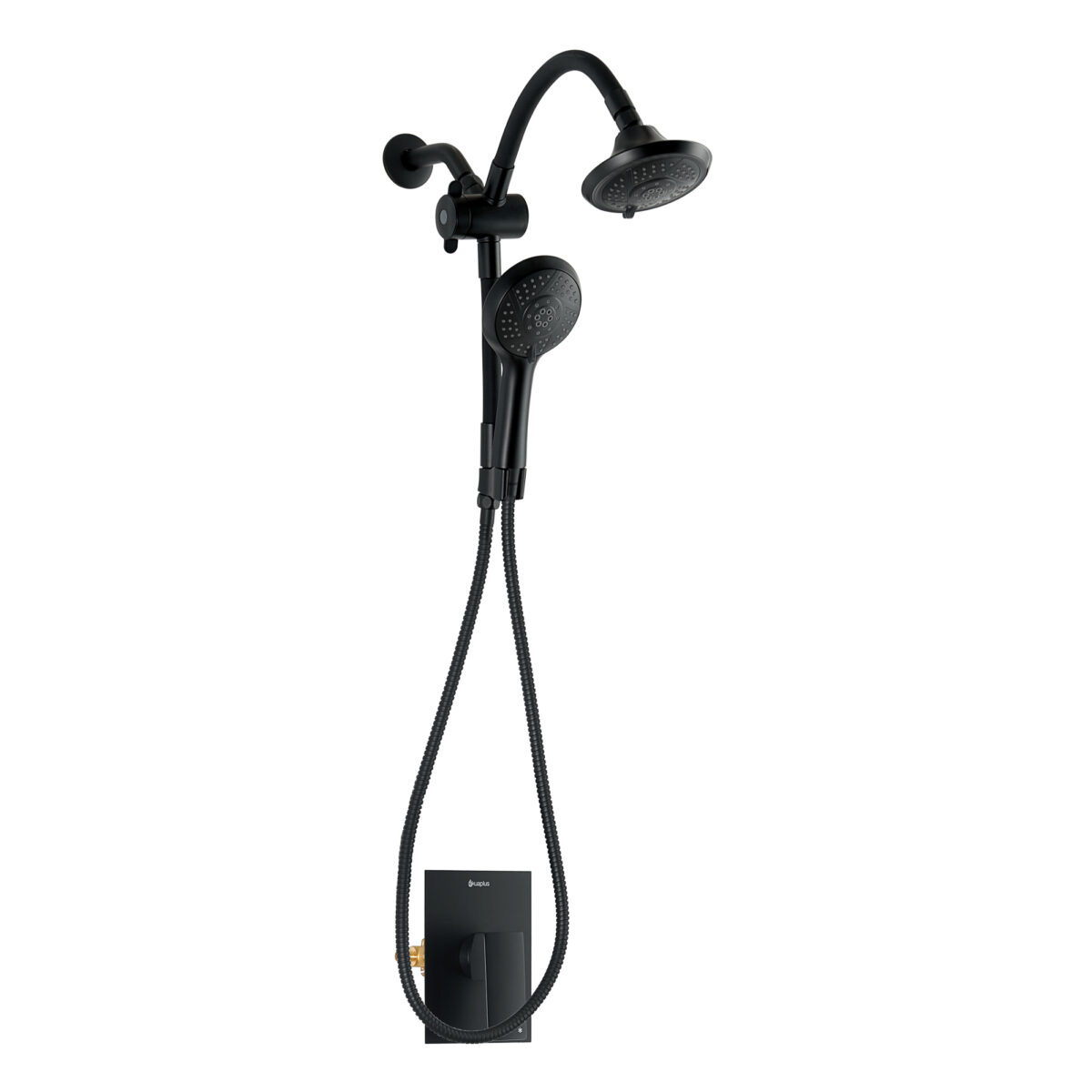 Ensemble de douche akuaplus® LILA avec valve à pression équilibrée, système de douche flexible, pommeau et douchette à 5 réglages, et boyau flexible en acier inoxydable au fini noir mat.