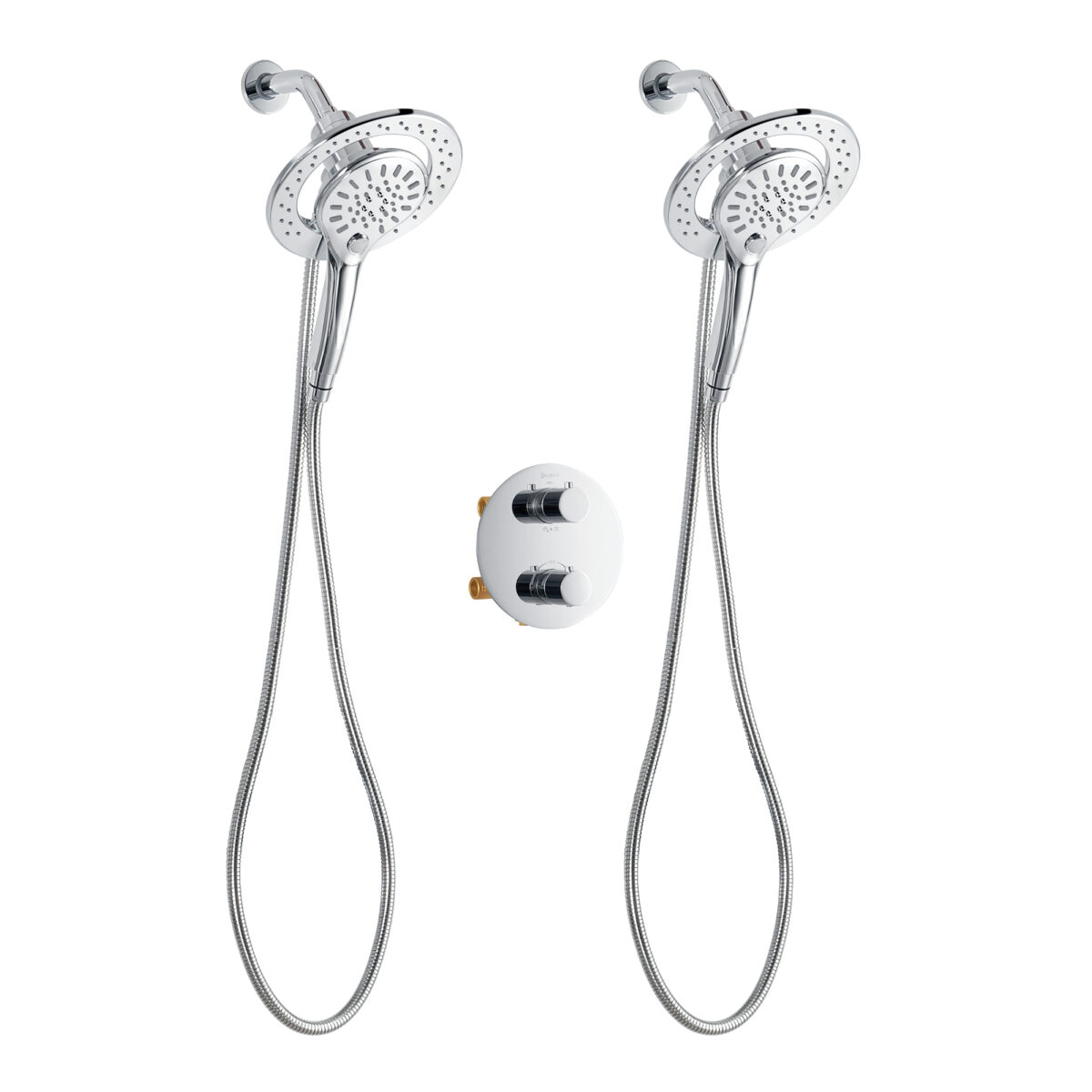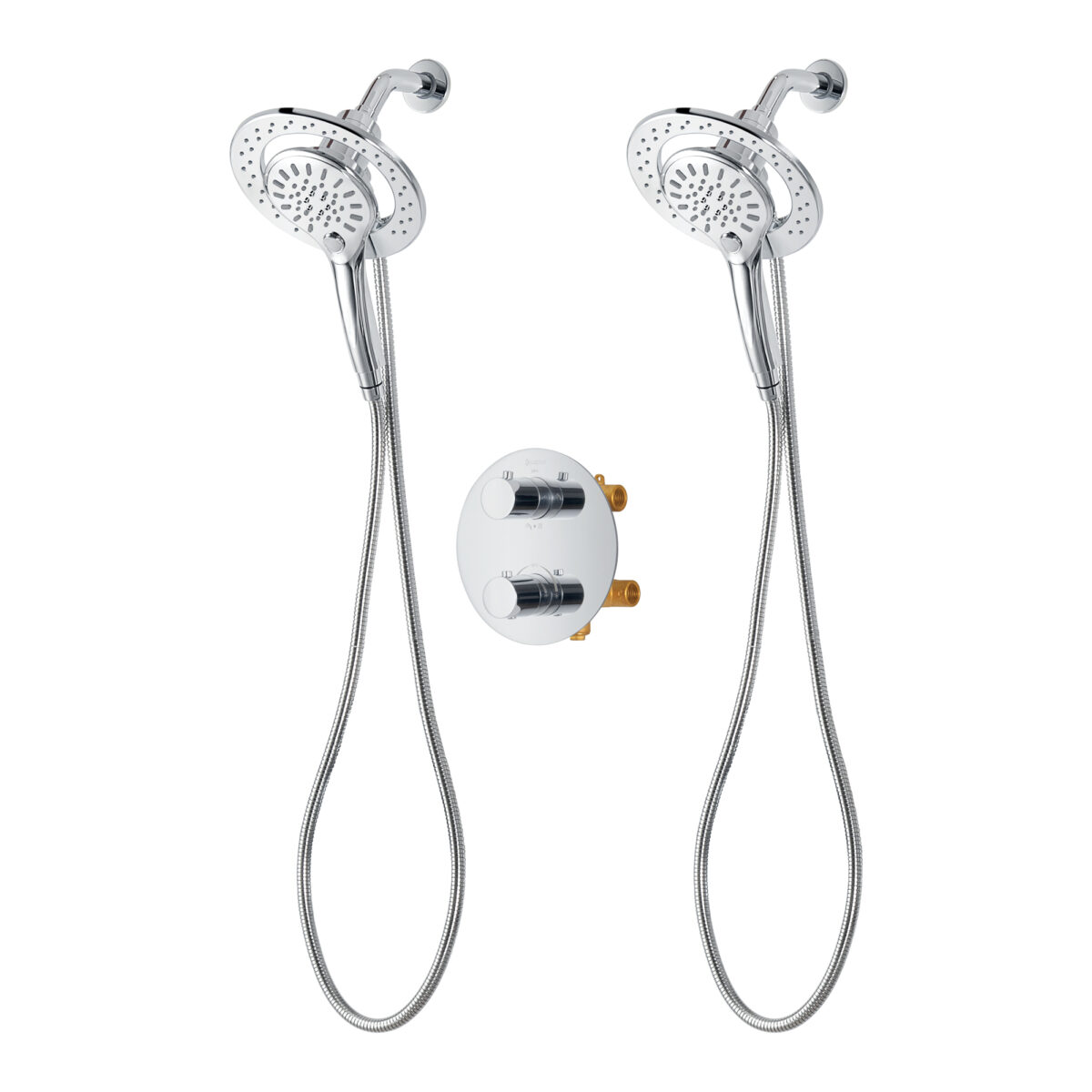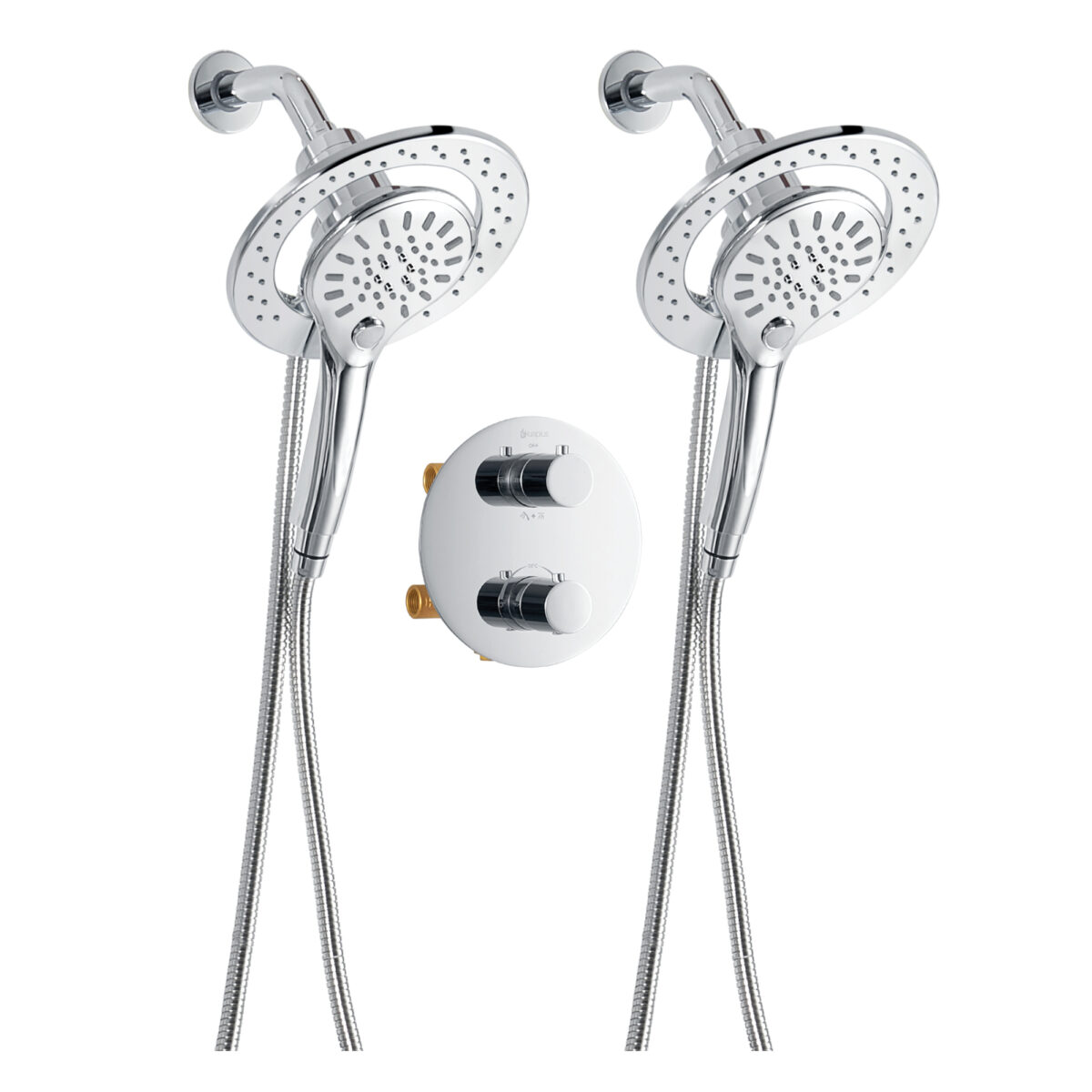Ensemble de douche duo thermostatique rond à 4 voies avec 2 ensembles pommeau et douchette magnétique à 3 réglages par akuaplus®