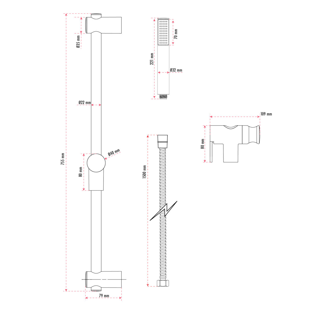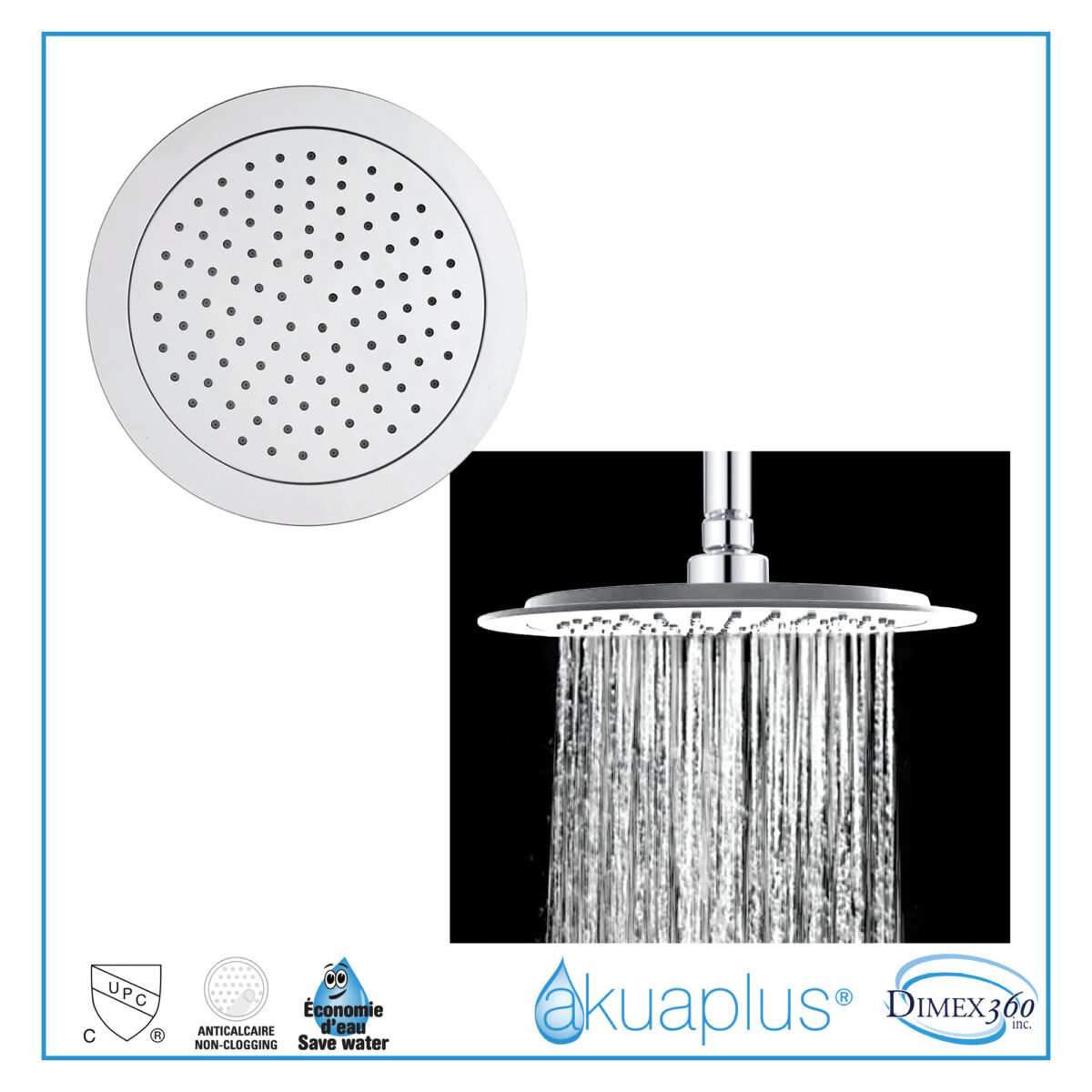 L’ensemble de douche thermostatique rond à 4 voies avec pommeau de douche pluie et douchette sur barre par akuaplus® est conçu pour offrir un contrôle précis de la température et une expérience de douche complète dans les salles de bain résidentielles modernes. La valve en laiton est munie d’une cartouche thermostatique assurant une température d’eau constante et sécuritaire, ainsi que d’une soupape d’arrêt intégrée facilitant l’entretien. Le déviateur 4 voies permet d’utiliser le pommeau de douche pluie, la douchette, les deux simultanément ou d’interrompre l’écoulement. Les connexions femelle filetées de 1/2 po assurent une compatibilité avec les standards nord-américains de plomberie. Le système comprend un bras de douche pour plafond en laiton de 8 po (20,3 cm) avec bride, ainsi qu’un pommeau de douche pluie de 9 1/2 po (24,1 cm) en ABS, pivotant grâce à une rotule en laiton. La barre de douche en acier inoxydable mesure 29 3/4 po (75,5 cm) et est dotée d’un support à douchette ajustable en ABS. La douchette en ABS à 1 réglage est munie de buses anti-calcaire faciles à nettoyer et assure un débit contrôlé de 9,5 L/min (2,5 gal US/min). L’ensemble comprend également un boyau flexible de 59 po (1,5 m) en acier inoxydable à double agrafage avec raccords en laiton, ainsi qu’un raccord coudé en laiton (mâle/mâle, 1/2 po) assurant une installation fiable. Certifié cUPC, cet ensemble est conforme aux normes nord-américaines de plomberie.