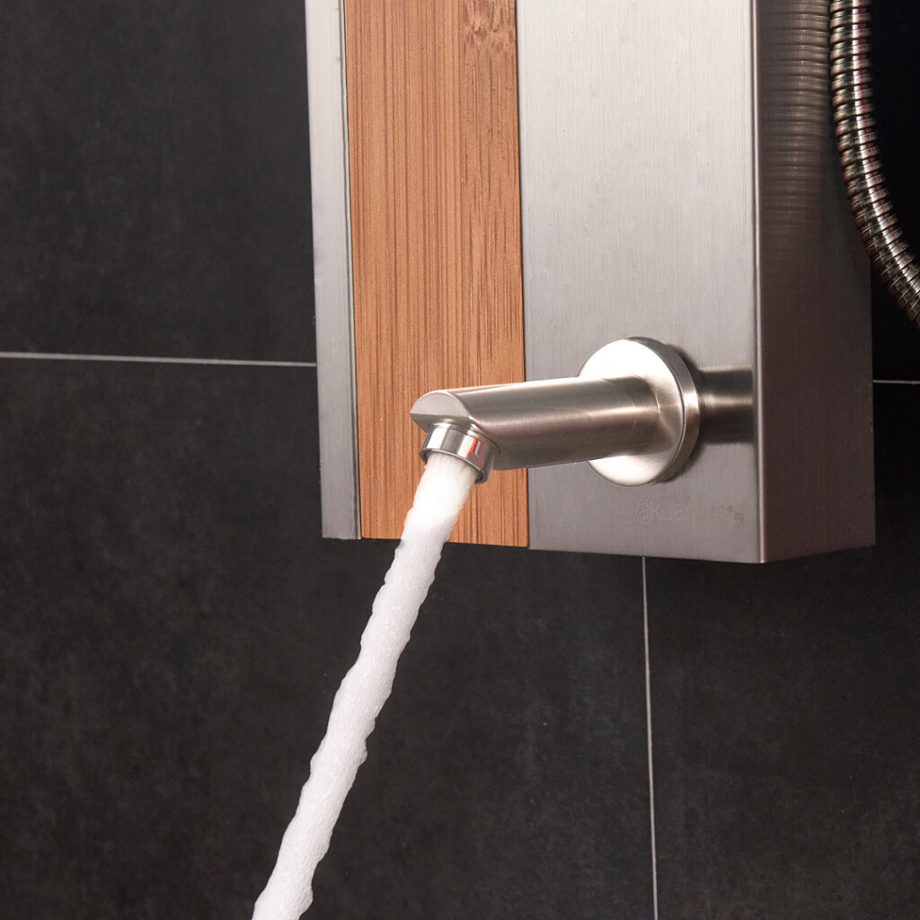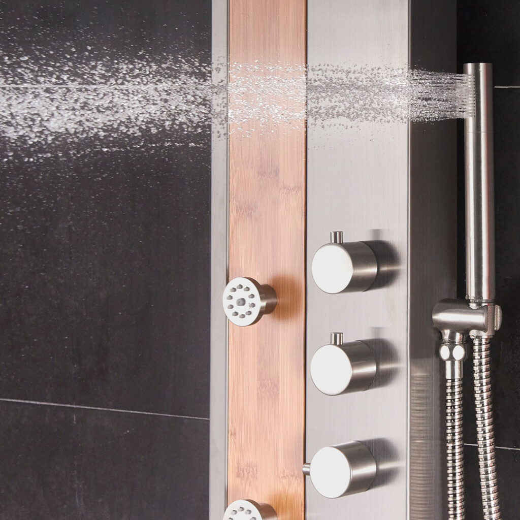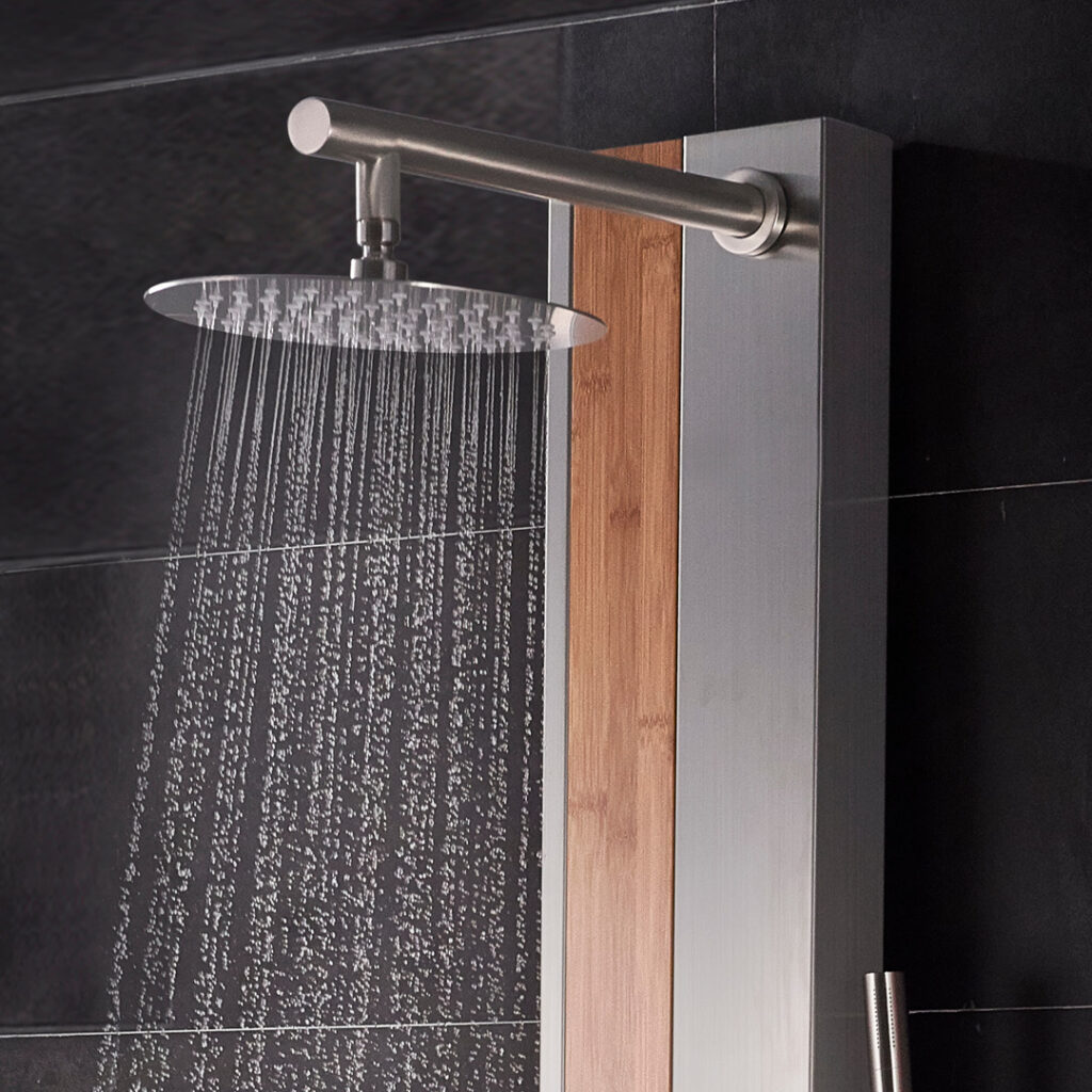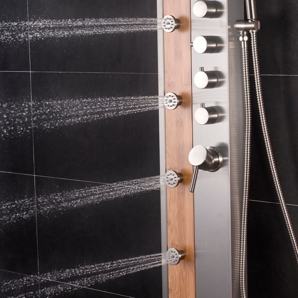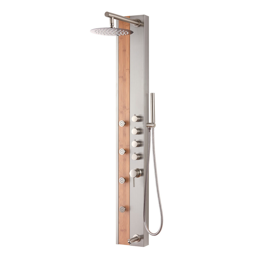 La colonne de douche à pression équilibrée NADIA SPB9817BN au fini nickel brossé et bambou comprend 4 jets de corps, une pomme de douche ronde de 25 cm, et d'une douchette en laiton pour un style raffiné.