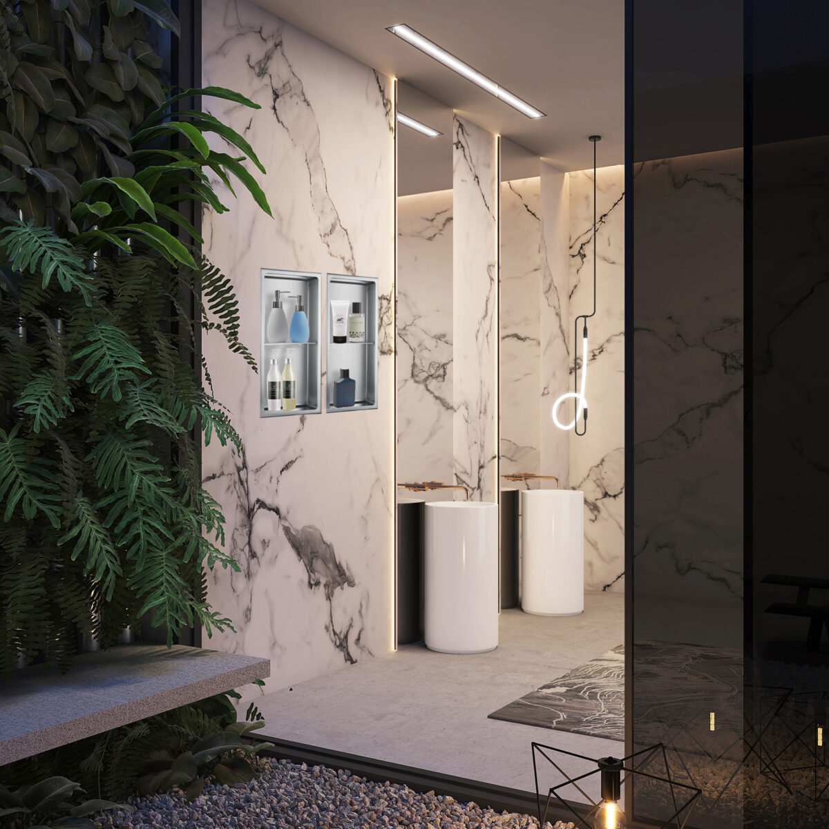 Niche de douche encastrée LAYLA à 2 tablettes fait d'acier inoxydable 304 par akuaplus®