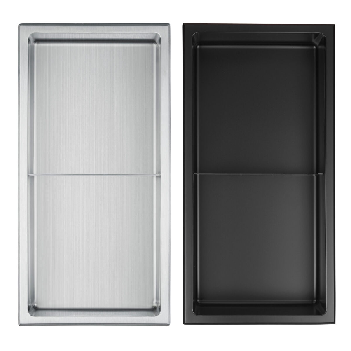 La niche de douche encastrée LAYLA par akuaplus® est fabriquée en acier inoxydable 304 de calibre 18, offrant une excellente résistance à la corrosion et une durabilité supérieure pour les installations résidentielles. D’une profondeur de 4 po (10,2 cm), elle est offerte en plusieurs grandeurs afin de s’adapter à différentes configurations de salle de bain. Elle constitue une solution idéale comme niche de douche encastrée en inox, niche murale moderne ou étagère murale pour salle de bain. Disponible en noir mat avec peinture électrostatique cuite au four ou en fini inox brossé, elle présente des coins arrondis de 3/8 po (1 cm) de rayon, assurant un rendu épuré et sécuritaire. Sa pente légère intégrée favorise l’écoulement de l’eau. Entièrement étanche, elle est facile à nettoyer et simple à installer. Elle peut être installée horizontalement ou verticalement, avec 1 ou 2 tablettes selon la configuration choisie. Conçue pour s’installer par-dessus le revêtement mural existant, elle ne nécessite aucun carrelage supplémentaire. Cette niche est certifiée cUPC, assurant sa conformité aux normes nord-américaines de plomberie.