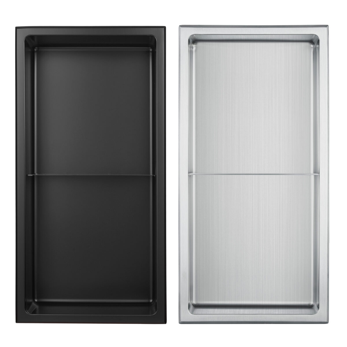 Niche de douche encastrée LAYLA à 2 tablettes en acier inoxydable 304 de calibre 18, fini noir mat, 12 po x 24 po x 4 po (30,5 x 61 x 10,2 cm), entièrement étanche et certifiée cUPC.