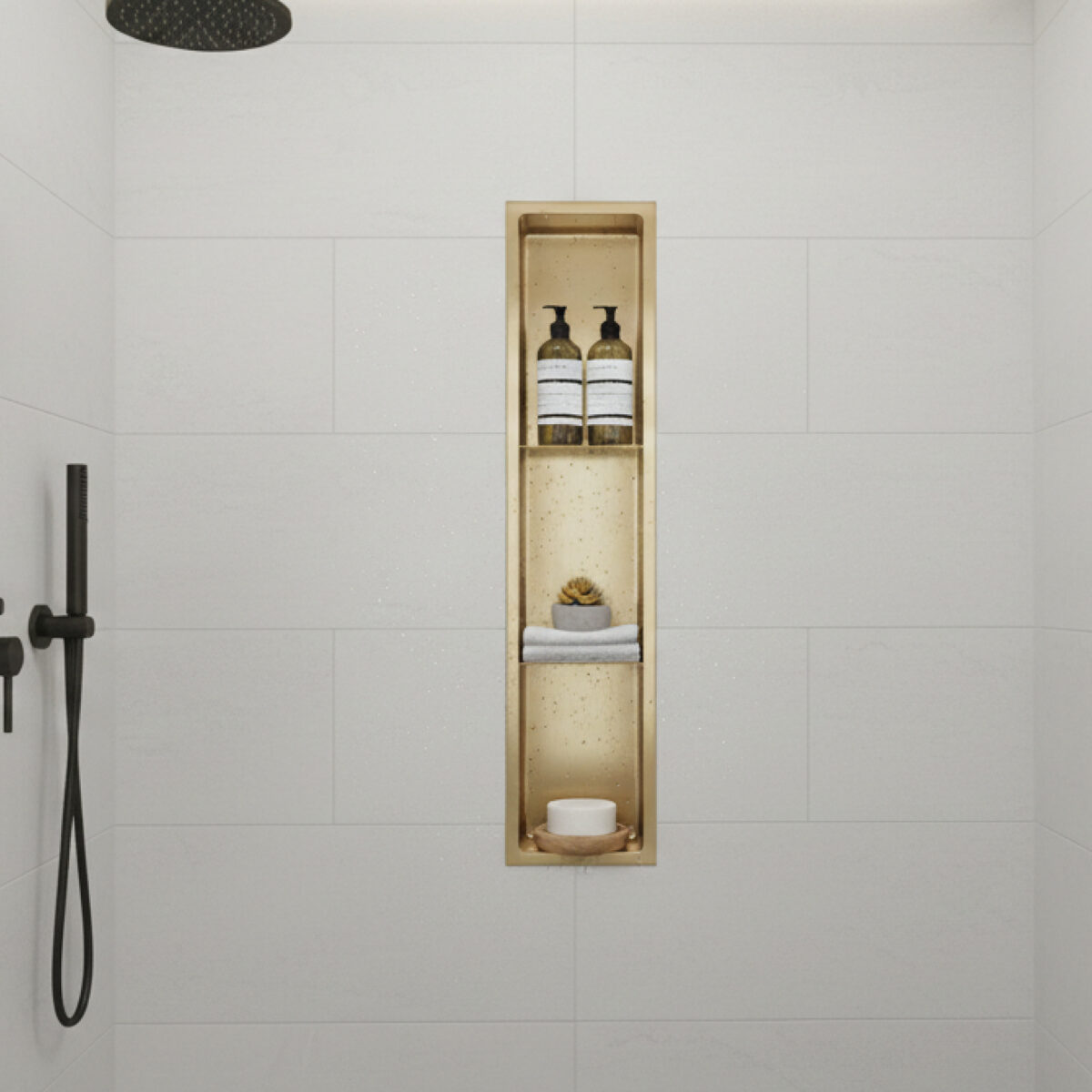 La niche de douche encastrée LAYLA d'AKUALUX® est fabriquée en acier inoxydable 304 de calibre 18, offrant une durabilité supérieure et une excellente résistance à la corrosion pour les environnements de salle de bain haut de gamme. D’une profondeur de 4 po (10,2 cm), elle comprend deux tablettes intégrées ainsi qu’une pente intérieure légère favorisant l’écoulement naturel de l’eau. Sa finition or champagne brossé apporte une touche élégante et contemporaine, idéale pour les aménagements raffinés. Les coins arrondis de 3/8 po (1 cm) de rayon assurent une finition soignée et sécuritaire. Entièrement étanche, elle peut être installée horizontalement ou verticalement selon la configuration de la douche. Elle s’installe directement par-dessus le revêtement mural existant, sans nécessité de carrelage supplémentaire. Certifiée cUPC, elle est conforme aux normes nord-américaines de plomberie.