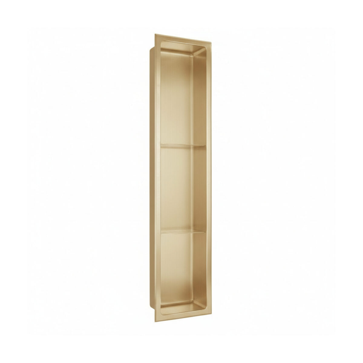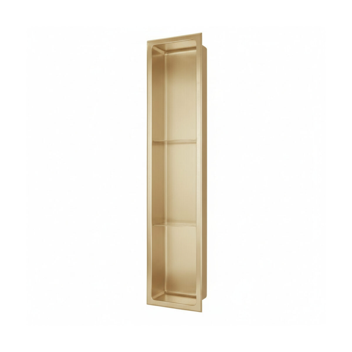 Niche de douche encastrée LAYLA à 3 tablettes en acier inoxydable 304 de calibre 18, fini or champagne brossé, 8 po x 36 po x 4 po (20,3 x 91,4 x 10,2 cm), entièrement étanche et certifiée cUPC.