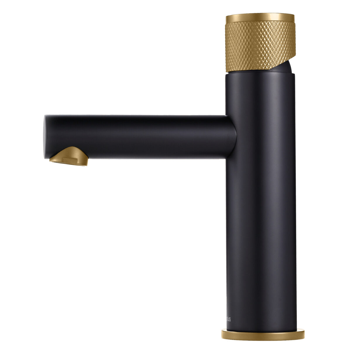 Robinet de lavabo monotrou rond fabriqué en laiton au fini noir mat et or champagne.