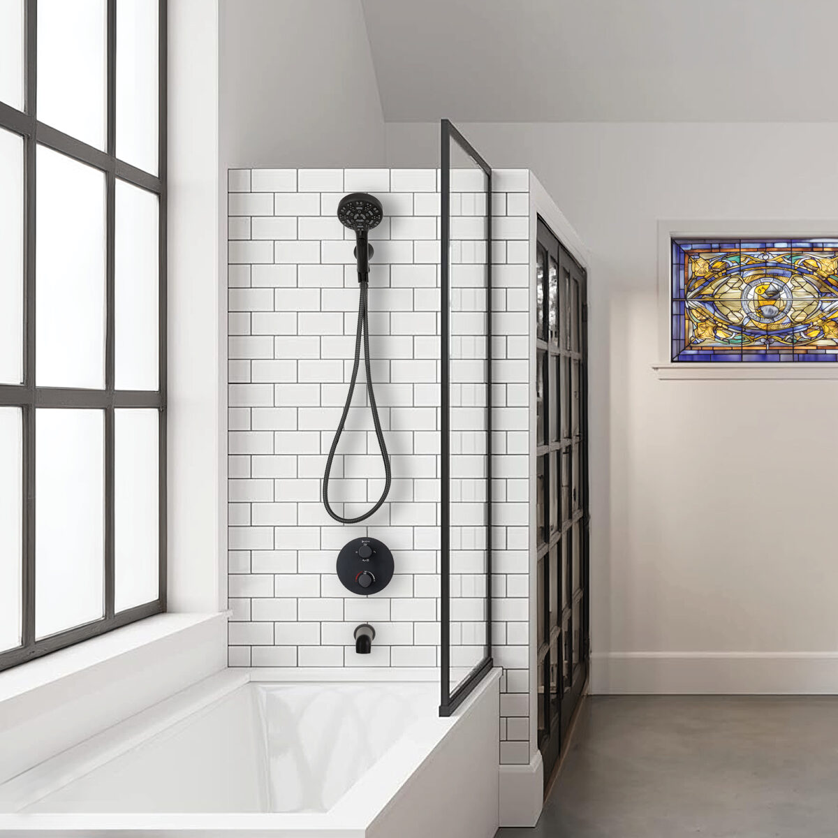 Ensemble bain-douche thermostatique au fini noir mat.