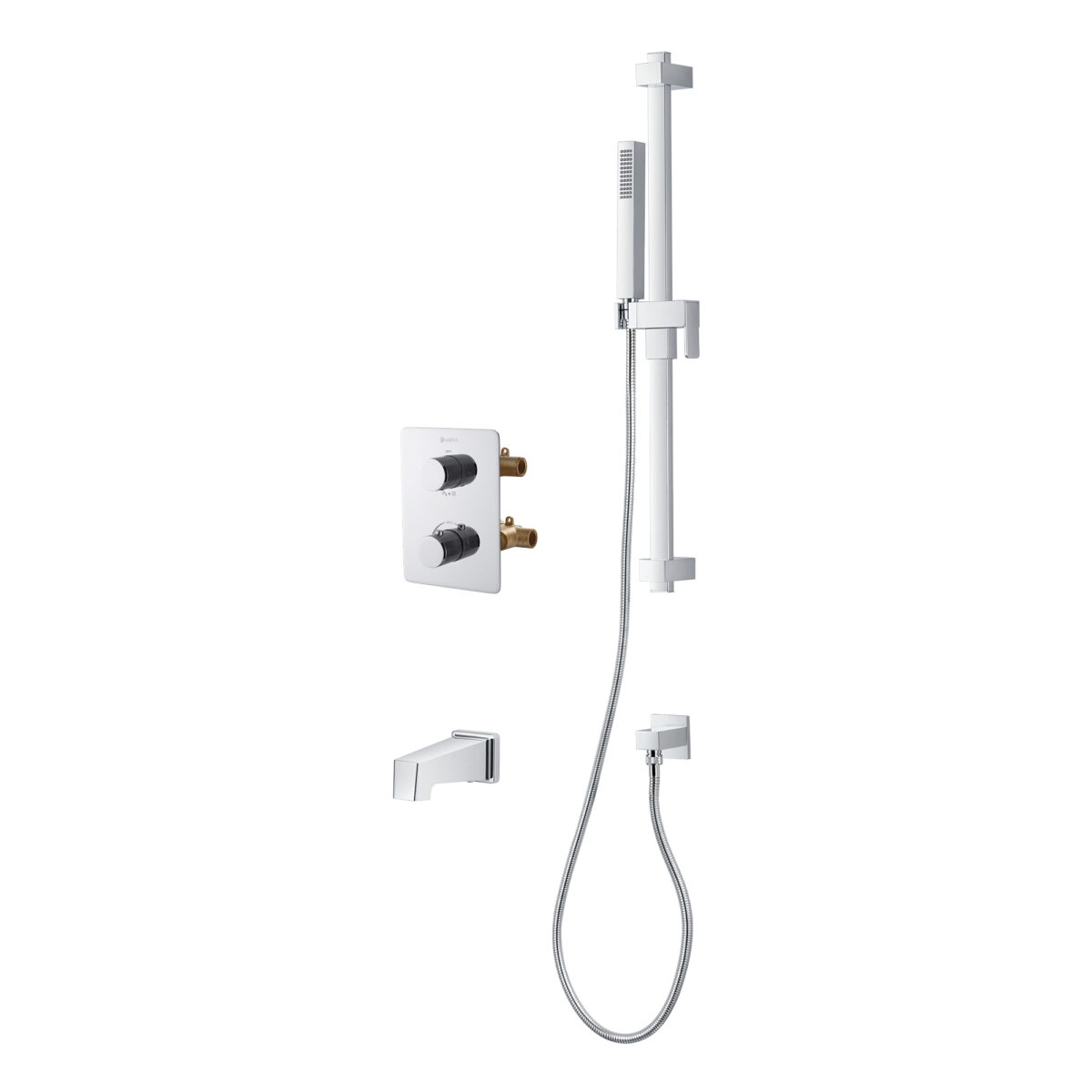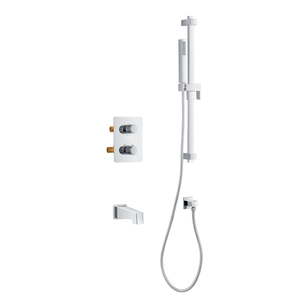 Ensemble bain-douche thermostatique carré au fini chrome avec un support mural en acier inoxydable, douchette et bec de bain à glissement.