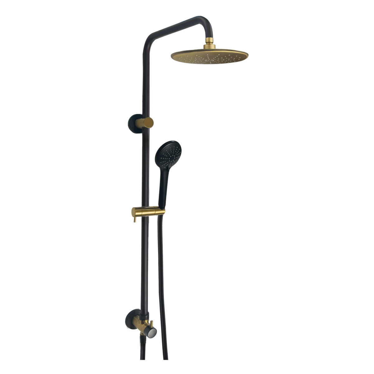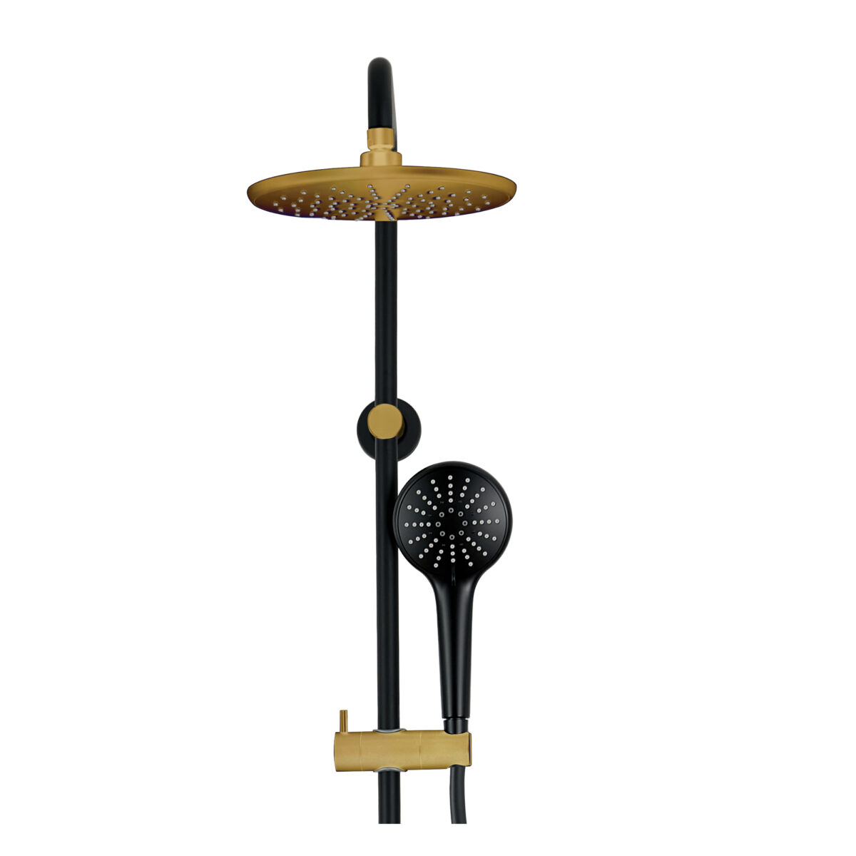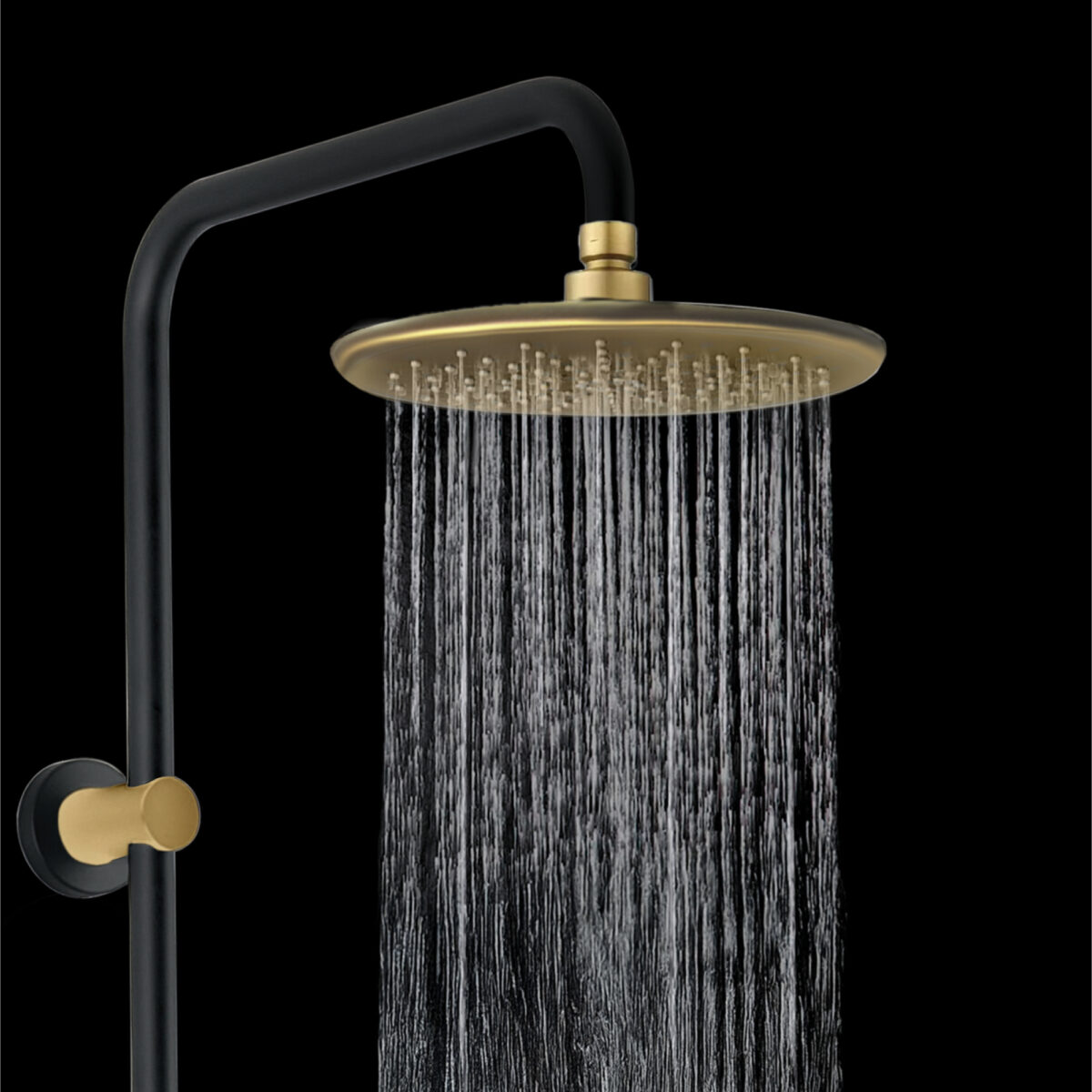 Système de douche AKUALUX® 3 voies avec pomme de douche pluie orientable de 8 5/8 pouces (22 cm) et douchette à 3 réglages au fini noir mat. et or champagne brossé. Ce combo est sans valve et remplacera votre pommeau de douche existant.