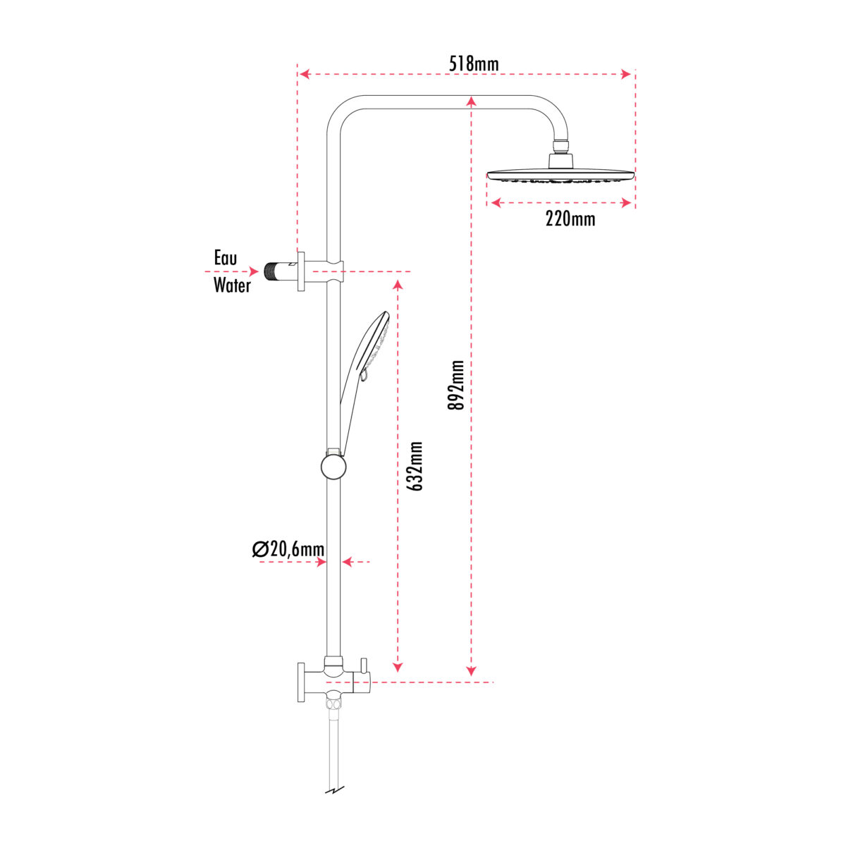 L’ensemble de douche sur colonne 3 voies AKUALUX® sans valve est conçu pour moderniser facilement une installation existante en remplaçant le pommeau de douche actuel par un système complet et polyvalent. Il comprend une barre de douche en laiton de 35 3/8 po (90 cm) avec support à douchette ajustable en ABS. Le sélecteur 3 voies permet d’utiliser le pommeau, la douchette ou les deux simultanément. Le pommeau de douche pluie pivotant de 8 po (20 cm) et la douchette à 3 réglages en ABS offrent confort et flexibilité, tandis que les buses anticalcaires faciles à nettoyer assurent un entretien simplifié. L’ensemble inclut un boyau flexible en PVC de 59 po (1,5 m) avec raccords en laiton. L’entrée d’eau située à l’attache murale supérieure permet un raccordement direct à l’installation existante. Il offre un débit de 9,5 L/min (2,5 gal US/min) et est certifié cUPC, assurant sa conformité aux normes nord-américaines de plomberie. La valve est vendue séparément. Remplacez votre pommeau de douche existant avec ce combo moderne.