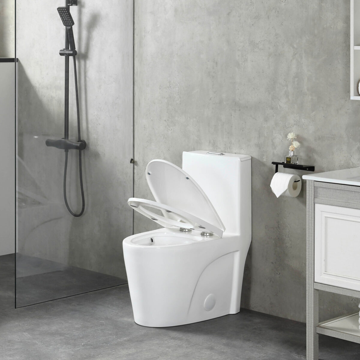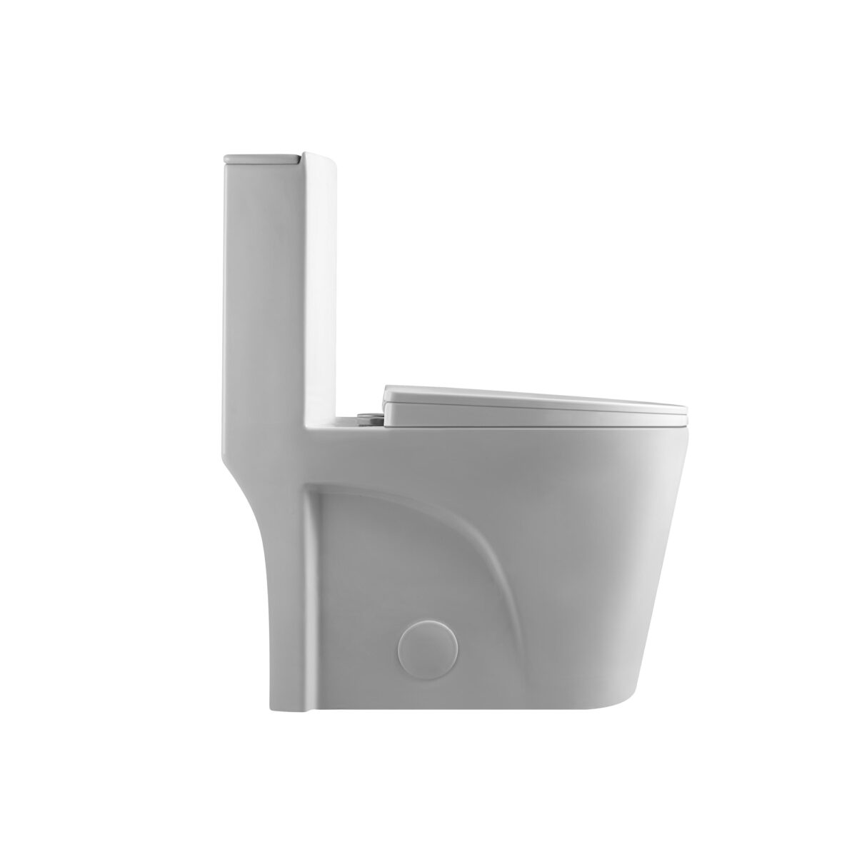 Toilette monobloc à double chasse d’eau au fini blanc en porcelaine antimicrobienne, cuve allongée, chasse siphonique, siège à fermeture lente.