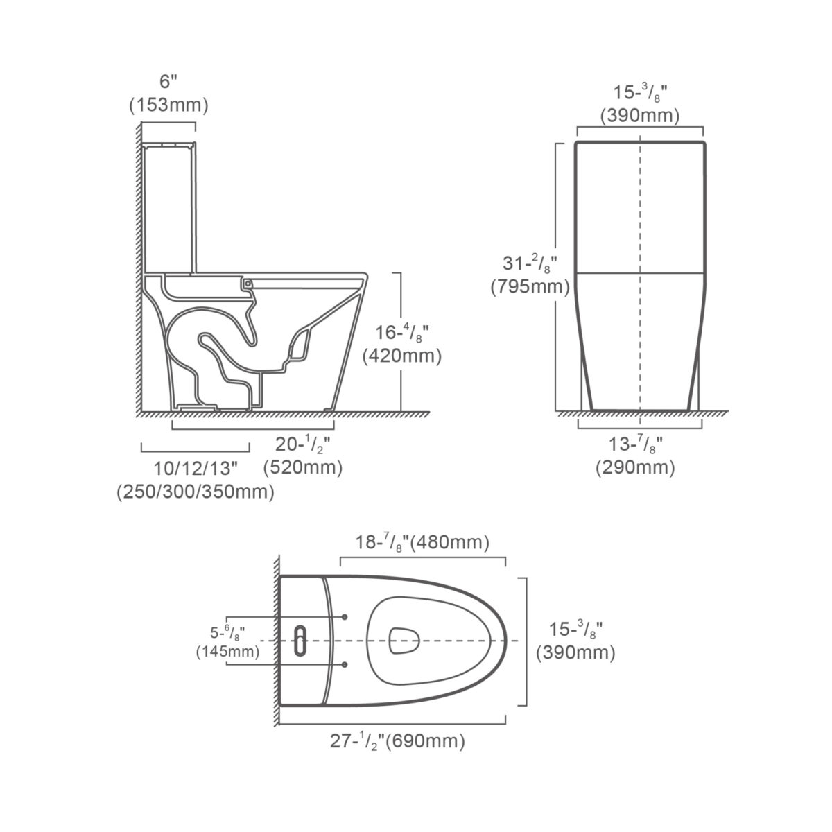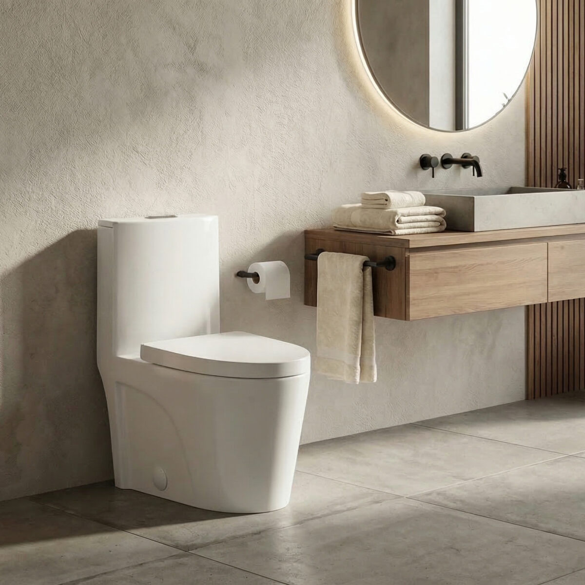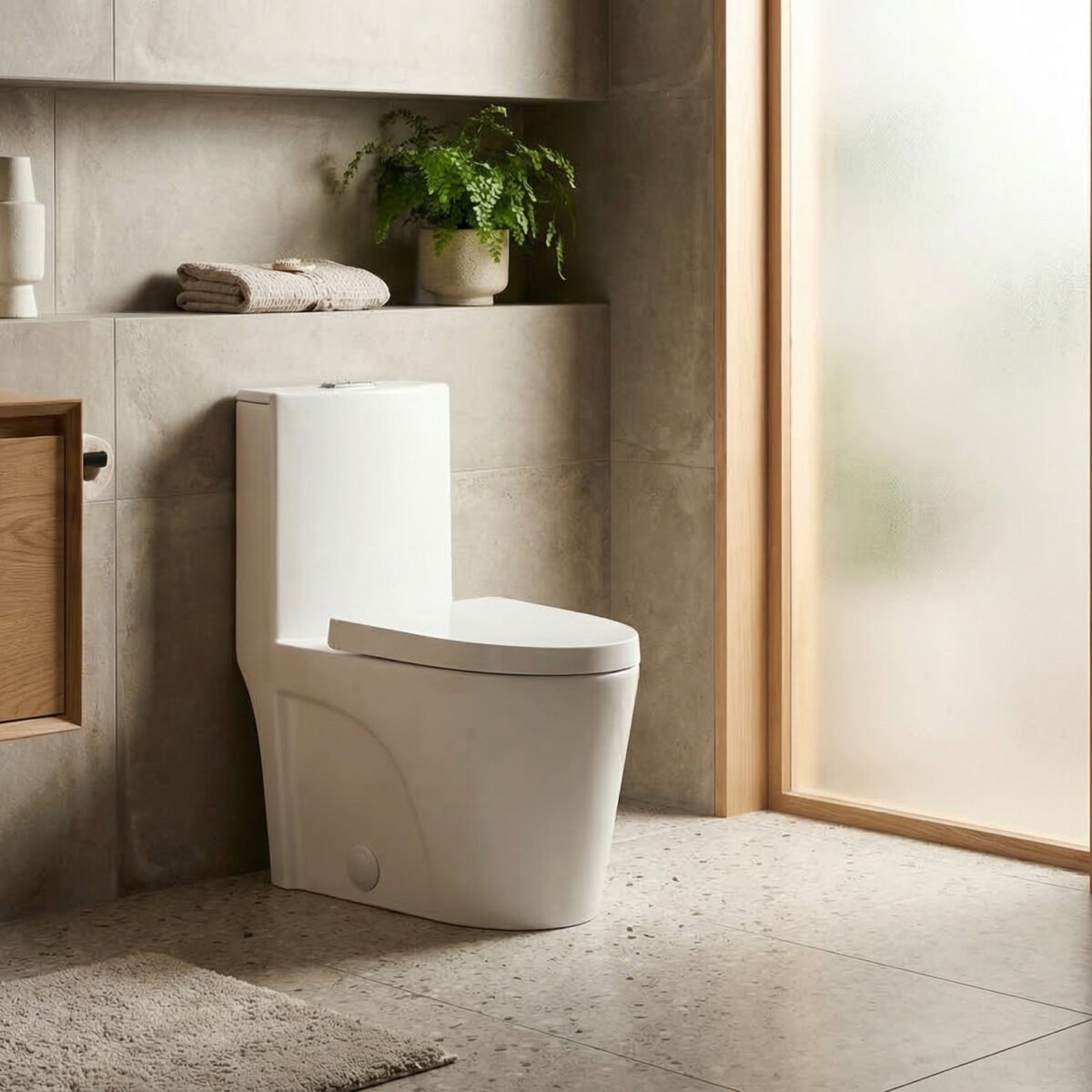 Toilette monobloc à double chasse d’eau fabriquée en porcelaine antimicrobienne, dotée d’une cuve allongée pour un confort accru. Son système de chasse siphonique assure un débit d’évacuation de 4,0 / 6,0 LPF (1,06 / 1,6 gal US par chasse) et offre une performance MAP de 1000 g. Conçue pour une installation standard avec une distance du mur de 12 po, cette toilette convient parfaitement aux installations résidentielles. Elle est fournie avec un siège à fermeture lente ainsi que des cache-vis inclus pour une finition soignée. Dimensions hors tout : 69 cm (L) × 39 cm (l) × 79,5 cm (H). Conforme aux exigences ADA, avec une hauteur de siège de 42 cm du sol.
