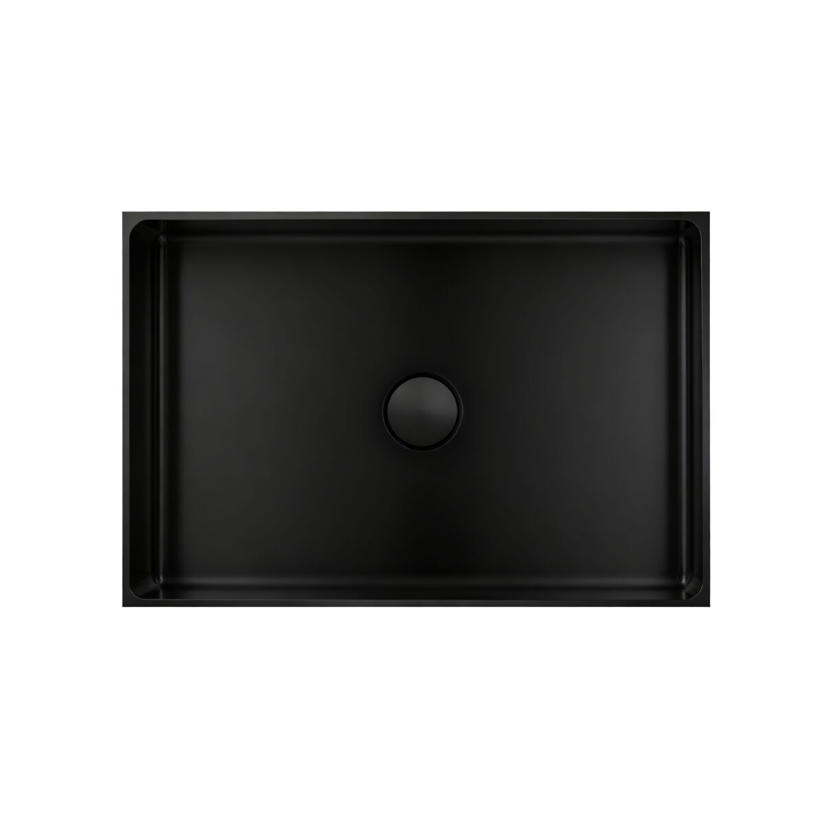 Vasque rectangulaire en acier inoxydable 304 au fini noir mat, installation en surface, crépine incluse.
