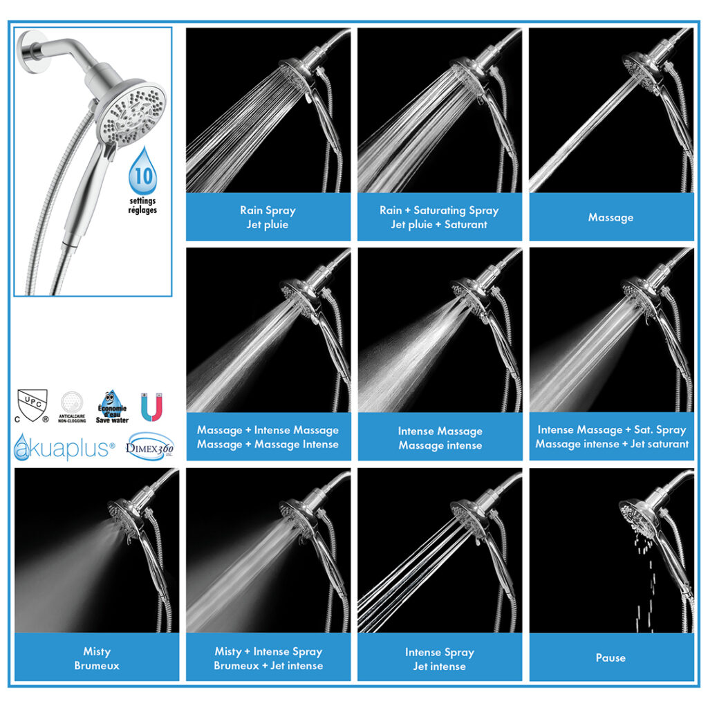 MAGNETIC HANDHELD SHOWER SET: 10-setting magnetic handshower with easy-to-clean anti-limescale nozzles; ABS magnetic handshower holder; 59 in. (1.5 m) flexible stainless steel hose with double interlocking and brass fittings; Flow rate of 9.5 L/min (2.5 US gal/min).