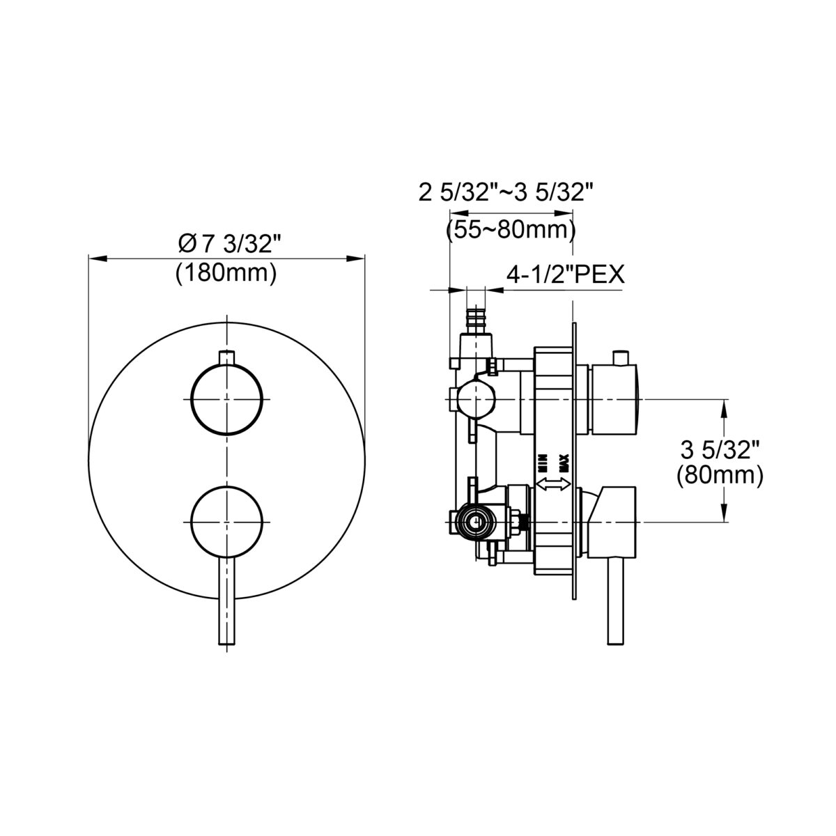 The akuaplus® round 3-way pressure balance shower valve is designed to deliver performance, stability, and versatility for modern residential installations. Constructed from brass with stainless steel and zinc components, it features a pressure balance cartridge that maintains consistent and safe water temperature despite pressure fluctuations. It includes a 3-function ceramic diverter, allowing independent selection of one outlet, another outlet, or a third outlet. The configuration can be adapted up to 6 functions with a compatible cartridge sold separately, depending on the installation layout. An integrated stop valve facilitates servicing and maintenance. This valve features 1/2" PEX connections for both the water supply and outlets, ensuring reliable installation and compatibility with North American plumbing standards. It is cUPC certified, guaranteeing compliance with applicable plumbing regulations. The round two-tone trim plate measures 7 3/32" in diameter (180 mm), providing a clean and contemporary wall finish.