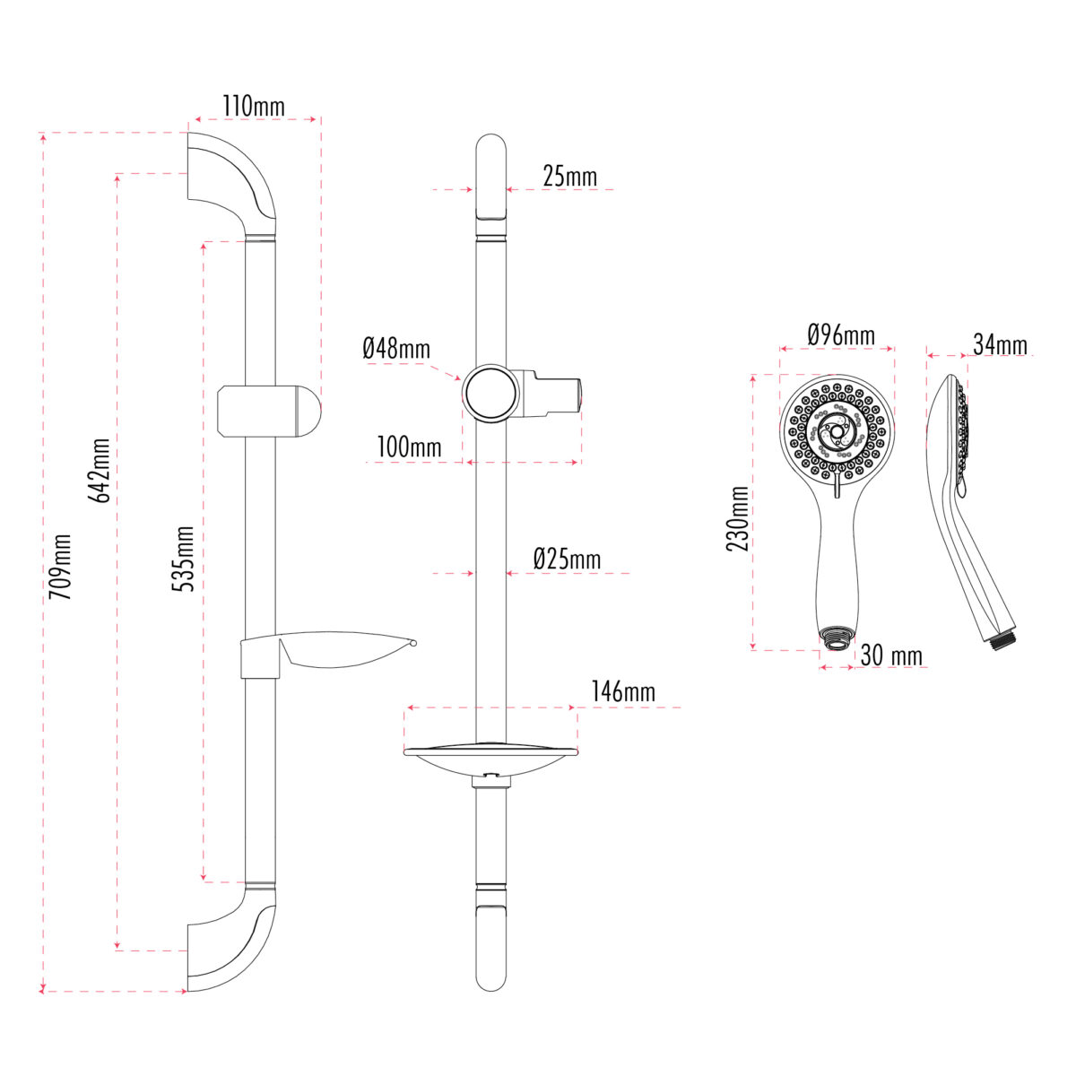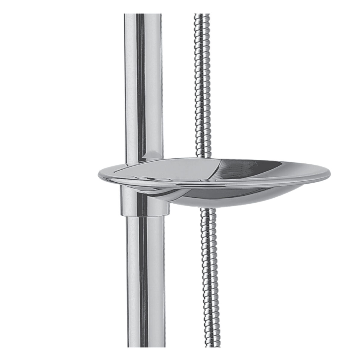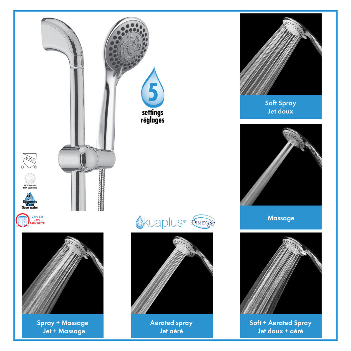 The adjustable Shower Post System features a 28 3/8" (72 cm) stainless steel shower post, providing strength and long-lasting durability. The 5-setting ABS hand shower includes easy-to-clean anti-limescale nozzles for versatile and comfortable use. The adjustable ABS hand shower bracket, along with the adjustable soap dish, allows for convenient and customized positioning. The system includes a 59" (1.5 m) double-interlocked stainless steel flexible hose with brass fittings, ensuring durability and reliability. It delivers a flow rate of 9.5 L/min (2.5 US gal/min) for optimal performance. Wall-mounting hardware is included for a complete and straightforward installation. Designed for residential applications, this system is cUPC certified, ensuring compliance with North American plumbing standards.