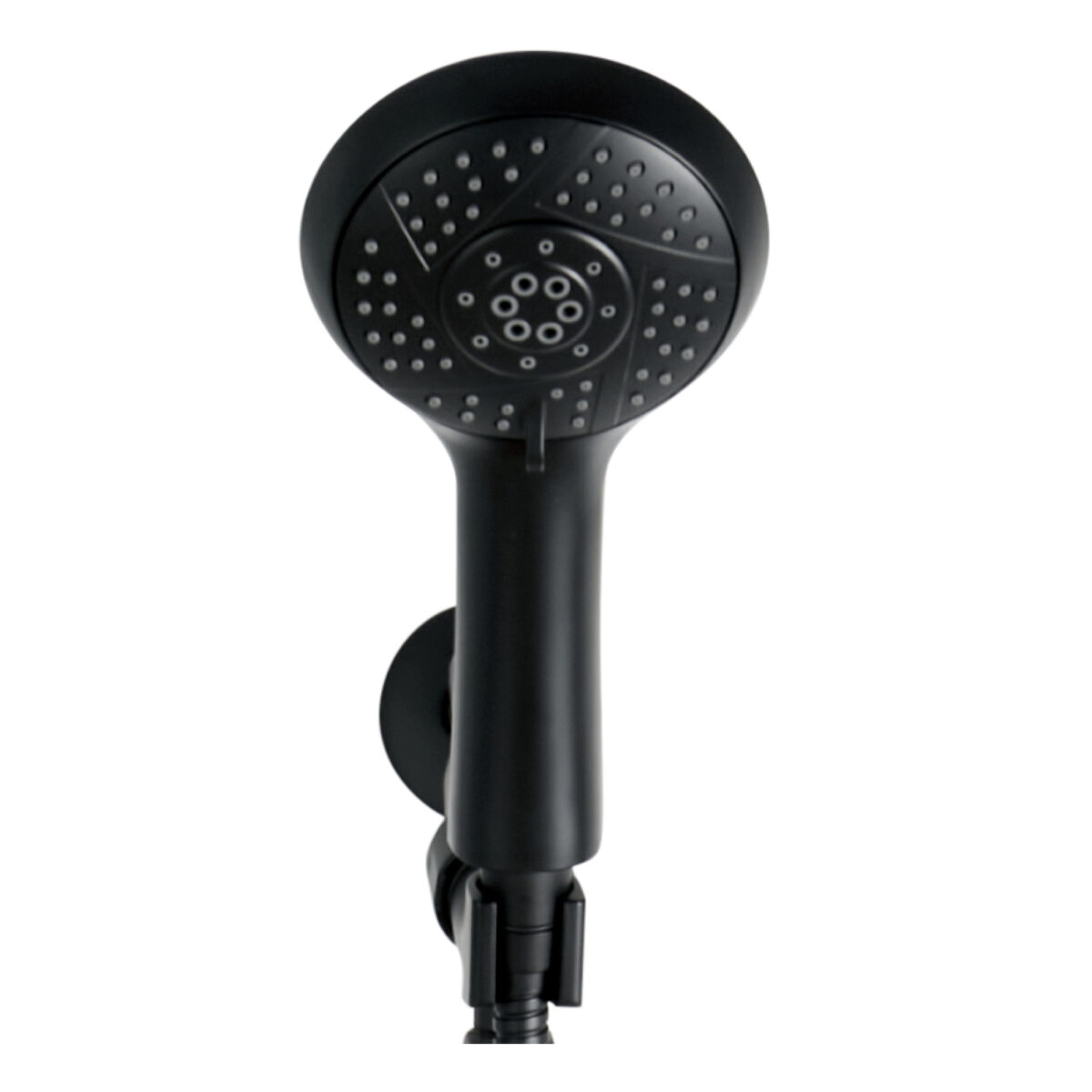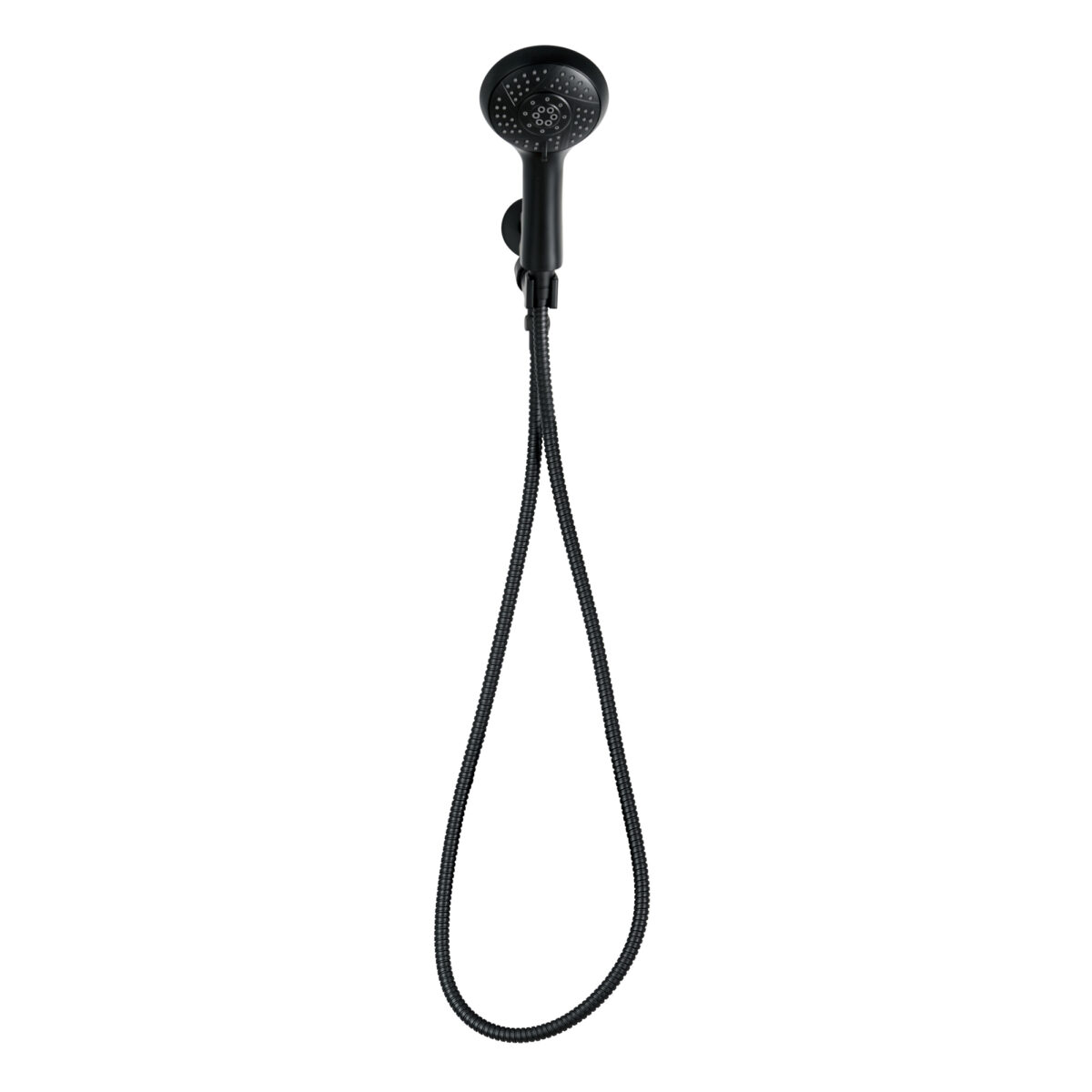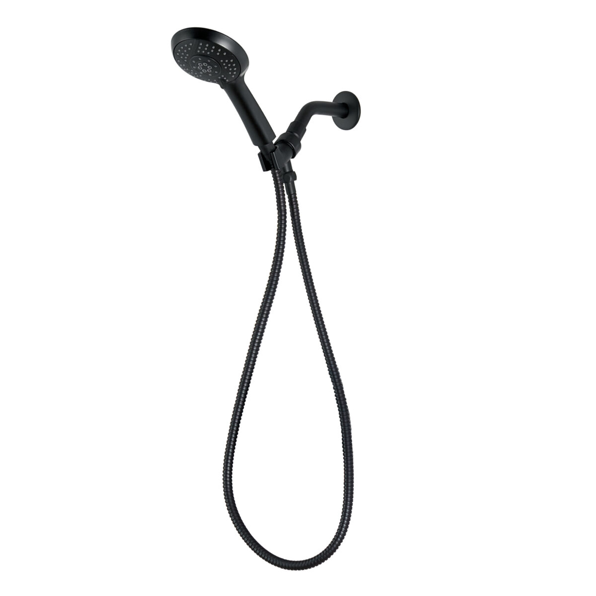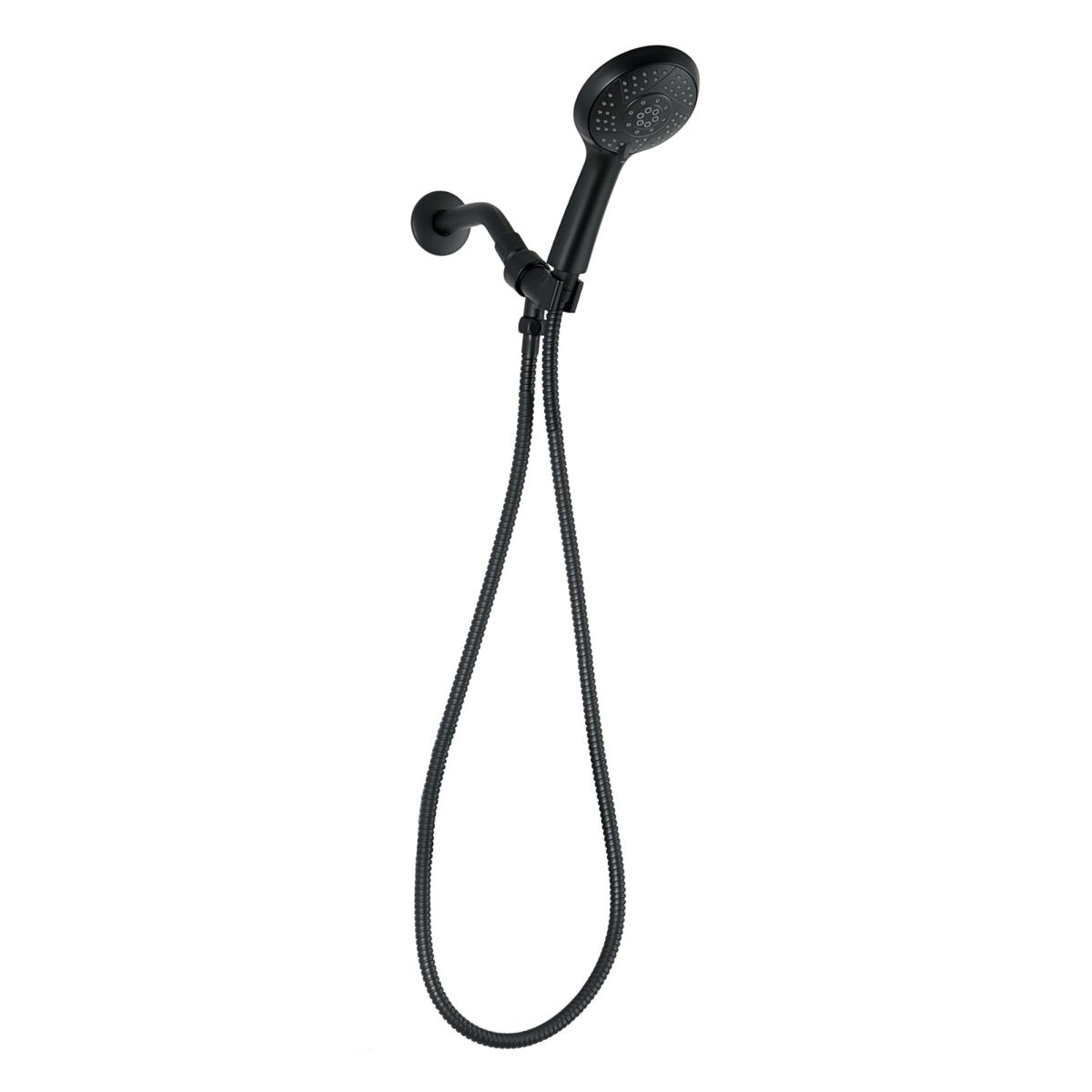 Handheld Shower made of ABS with 5 settings on a 6-inch (15.24 cm) brass wall-mounted Shower arm in a matte black finish.