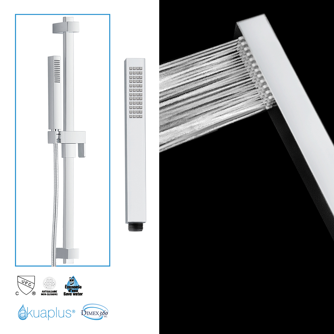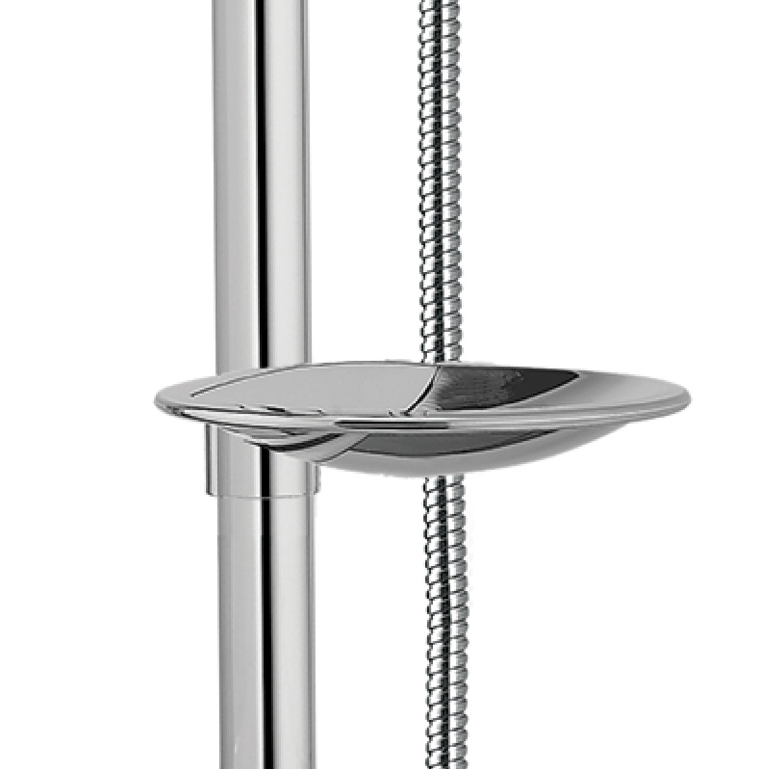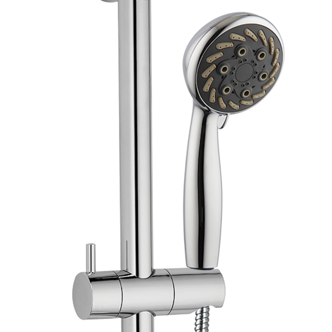 ADJUSTABLE SHOWER POST SYSTEM: Stainless steel 25-7/32 inches (64 cm) shower post; 6-setting ABS handheld shower with easy-to-clean anti-limescale nozzles; Adjustable handheld shower bracket and soap dish made of ABS; Flexible and extendable 59-inch (1.5 m) double interlocking stainless steel hose with brass fittings; Flow rate of 9.5 L/min (2.5 US gal/min); Wall-mounting hardware included.