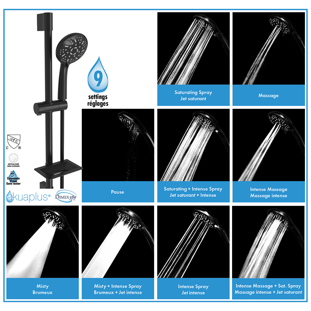 Handheld Shower made of ABS with 9 settings on a stainless steel adjustable post in a matte black finish.