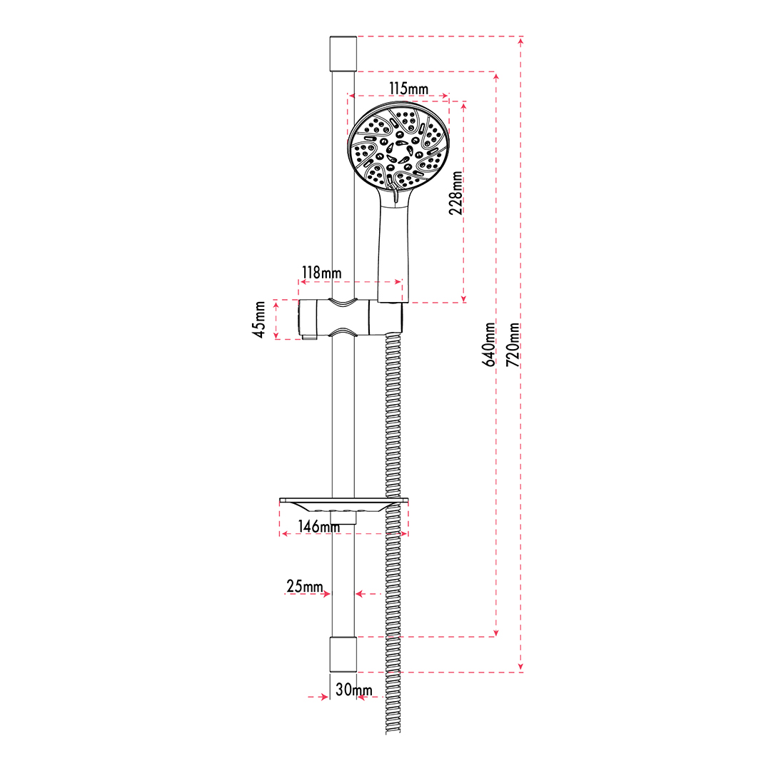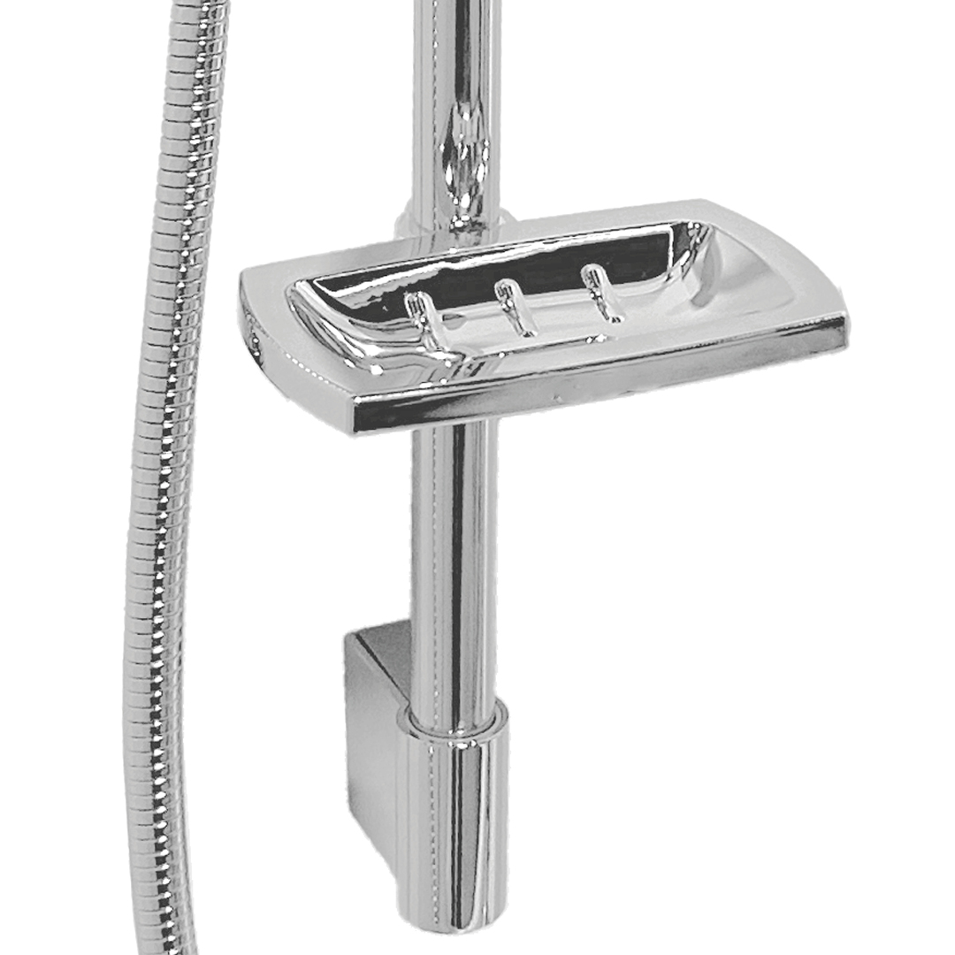 ADJUSTABLE SHOWER POST SYSTEM: Stainless steel 28-3/8-inch (72 cm) shower post; 9-setting ABS handheld shower with easy-to clean anti-limescale nozzles; Adjustable handheld shower bracket and soap dish made of ABS; Flexible and extendable 59-inch (1.5 m) double interlocking stainless steel hose with brass fittings; Flow rate regulator of 9.5 L/min (2.5 US gal/min); Wall-mounting hardware included.