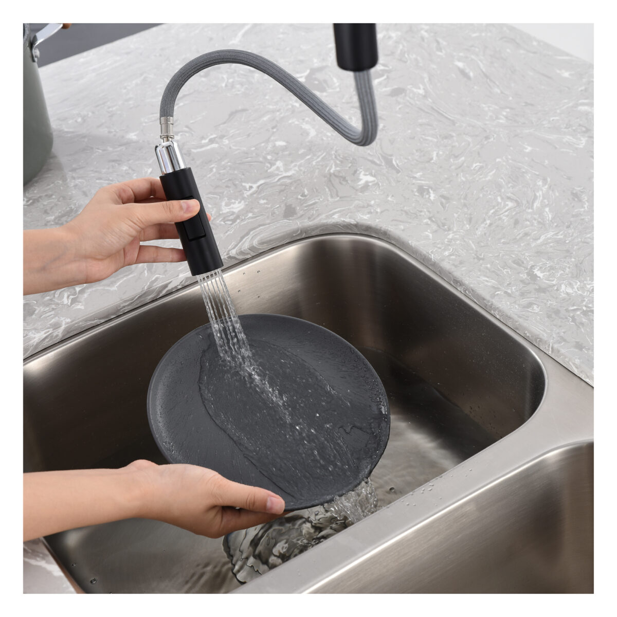The akuaplus® single-hole kitchen faucet from the ABA series combines functionality with modern design for residential kitchens. It features a 2-function pull-down sprayer with smooth retraction. The 360° adjustable swivel spout provides excellent flexibility and extended reach, ideal for single or double-basin sinks. Easy-to-clean anti-limescale nozzles help maintain optimal performance over time. The faucet is equipped with a ceramic cartridge for durability and precise control. The single lever handle allows effortless adjustment of water flow and temperature. It includes a nylon braided hose, ensuring reliable and long-lasting installation. Maximum flow rate: 6.81 L/min (1.8 US gal/min). Installation is quick and straightforward. The 3-hole deck plate is sold separately. Designed for residential applications, this faucet is cUPC certified, ensuring compliance with North American plumbing standards.