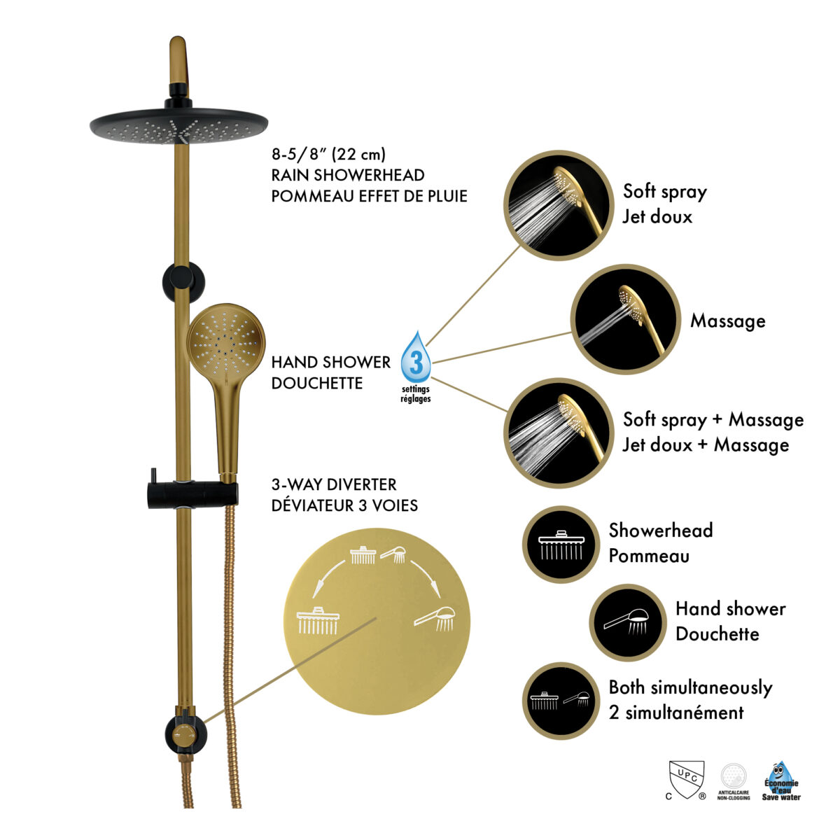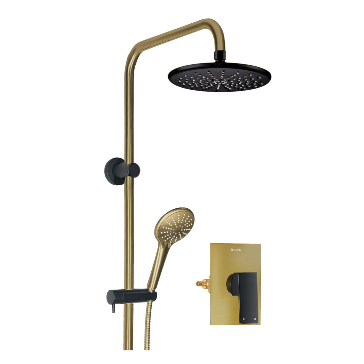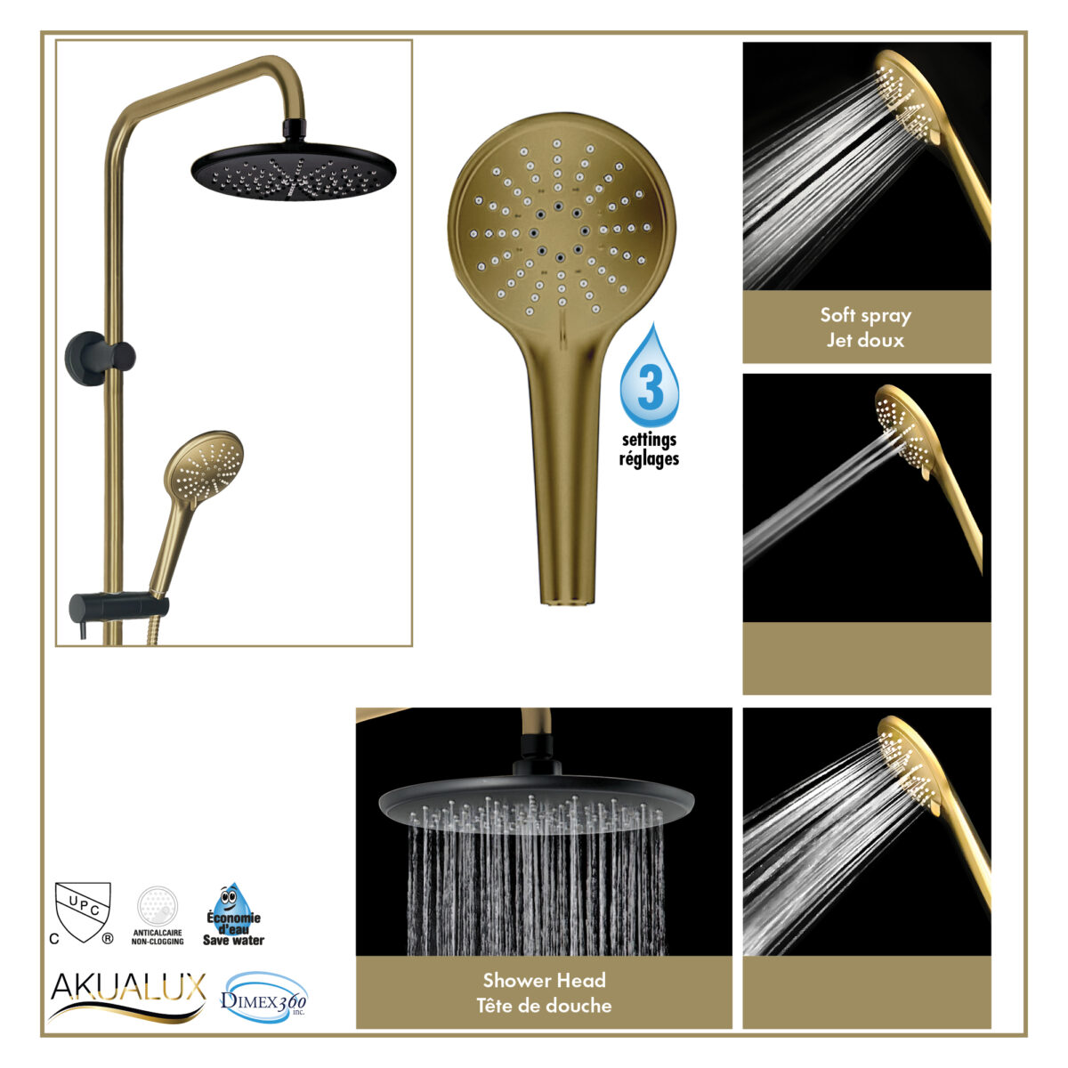 AKUALUX® 3-Way pressure balance Shower system with valve featuring an 8-5/8 inches (22 cm) swiveling rain Showerhead, and a 3-setting handheld Shower in a brushed champagne gold and matte black finish.