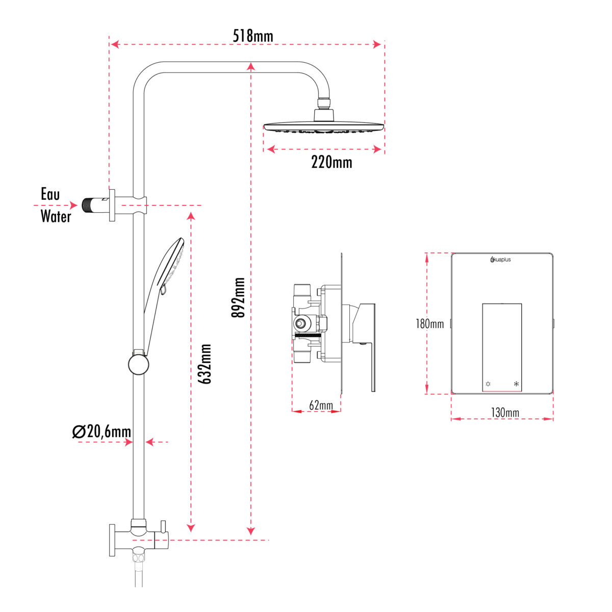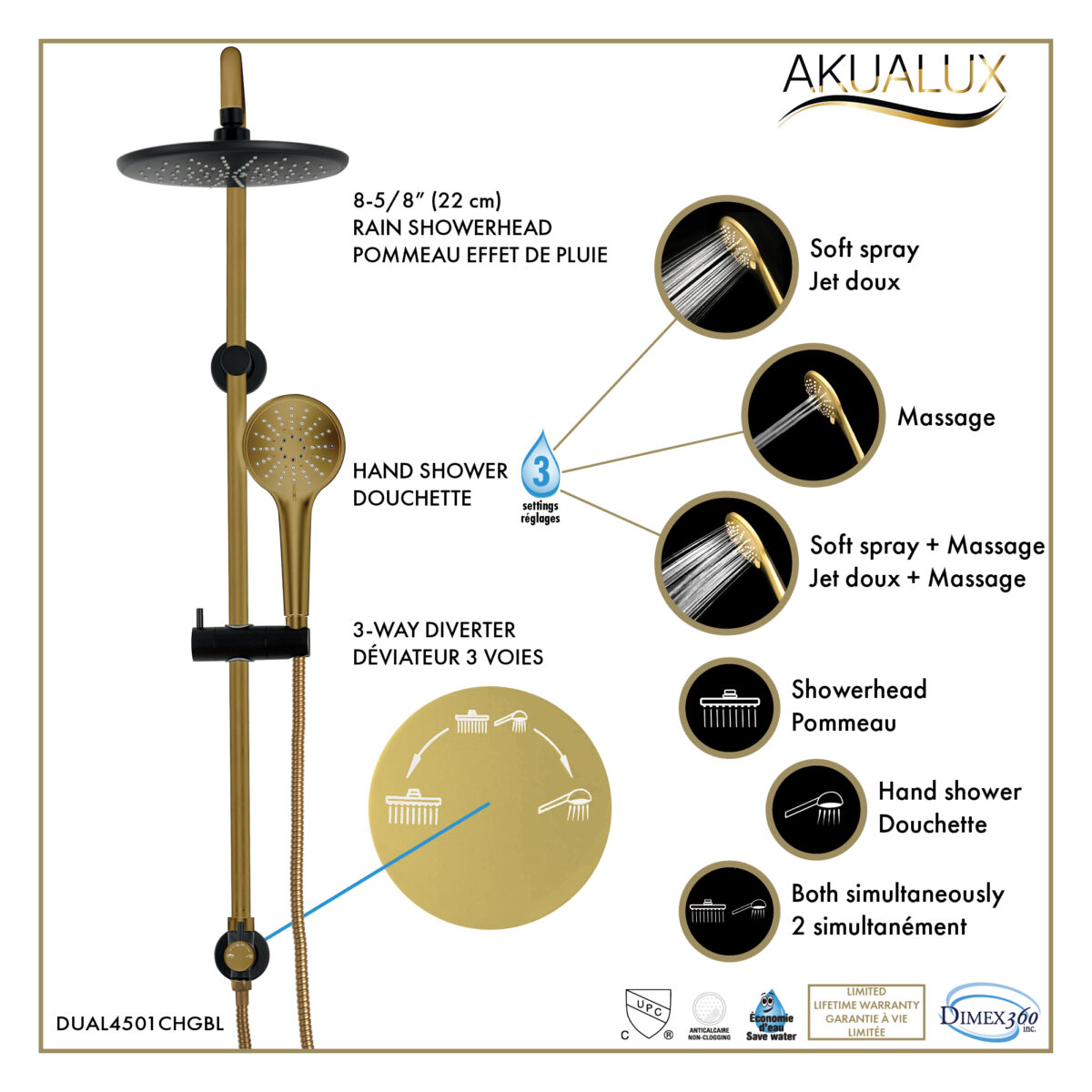 The AKUALUX® pressure balance shower post system is designed to deliver stability, performance, and durability for modern residential bathroom installations. The shower valve, made of brass, stainless steel, and zinc, features a pressure balance cartridge that maintains consistent water temperature while minimizing sudden pressure fluctuations. It includes a single handle for precise flow and temperature control. The water inlet is compatible with a 1/2" PEX connection and includes an integrated stop valve for secure and dependable installation. The system includes a 35 3/8" (90 cm) brass shower post with an adjustable ABS hand shower bracket. The water inlet is located at the upper wall connection point, allowing for a clean and integrated shower column installation. A 3-way diverter allows use of the showerhead, the hand shower, or both simultaneously. The 8" (20.32 cm) ABS swiveling showerhead provides optimal coverage. The 3-setting ABS hand shower features easy-to-clean anti-limescale nozzles for simplified maintenance. The 59" (1.5 m) flexible PVC hose with brass fittings ensures flexibility and durability. Maximum flow rate is 9.5 L/min (2.5 US gal/min). Designed for residential applications, this system is cUPC certified, ensuring compliance with North American plumbing standards. Product offered exclusively at Costco.